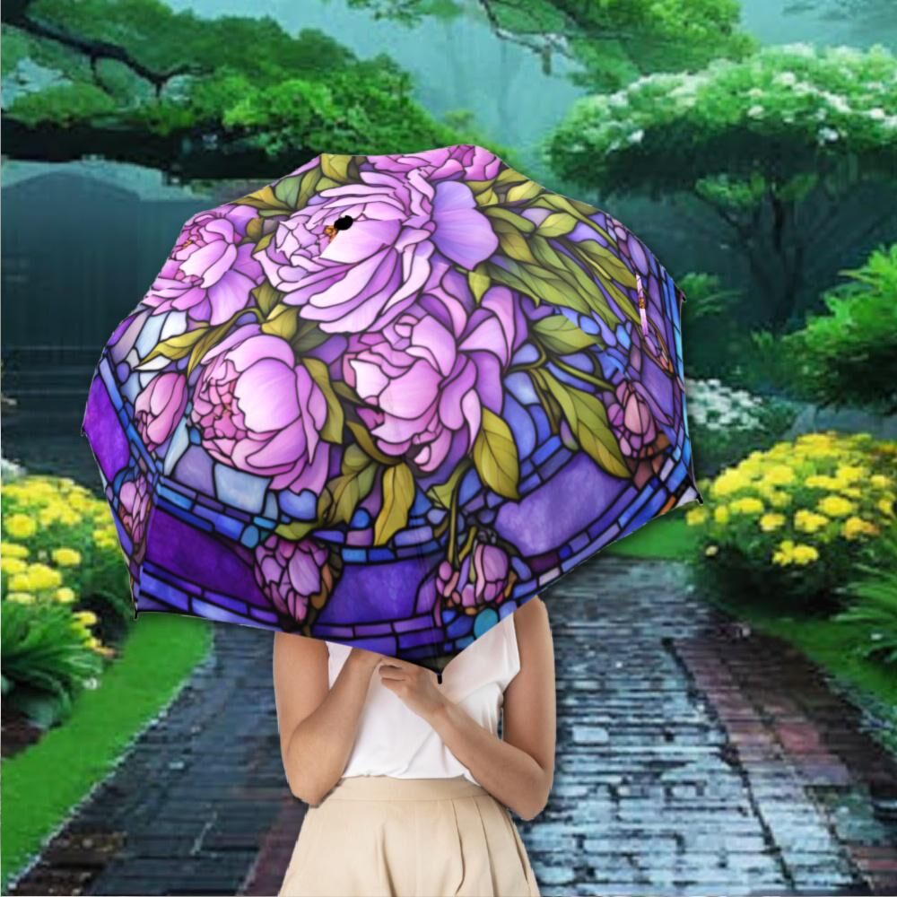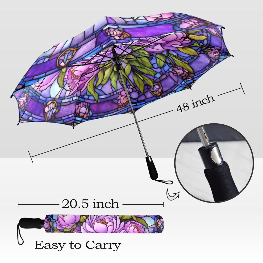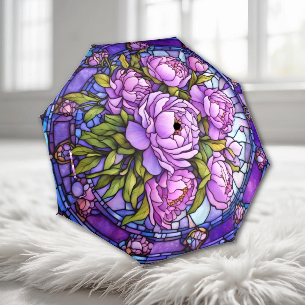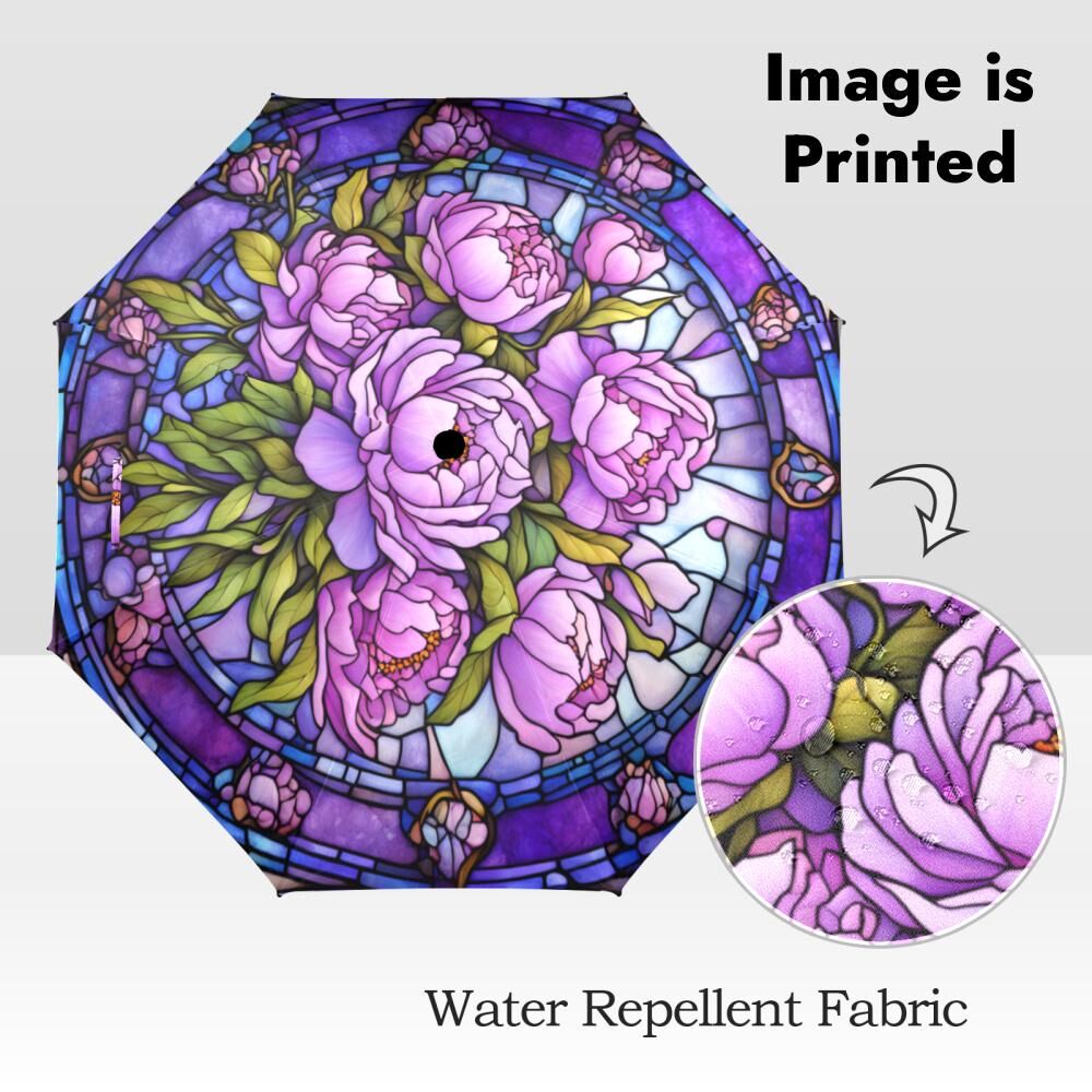Purple Peonies Romantic Umbrella Victorian Inspired Faux Stained Glass Flower Parasol Semi-Automatic Waterproof Foldable Umbrella