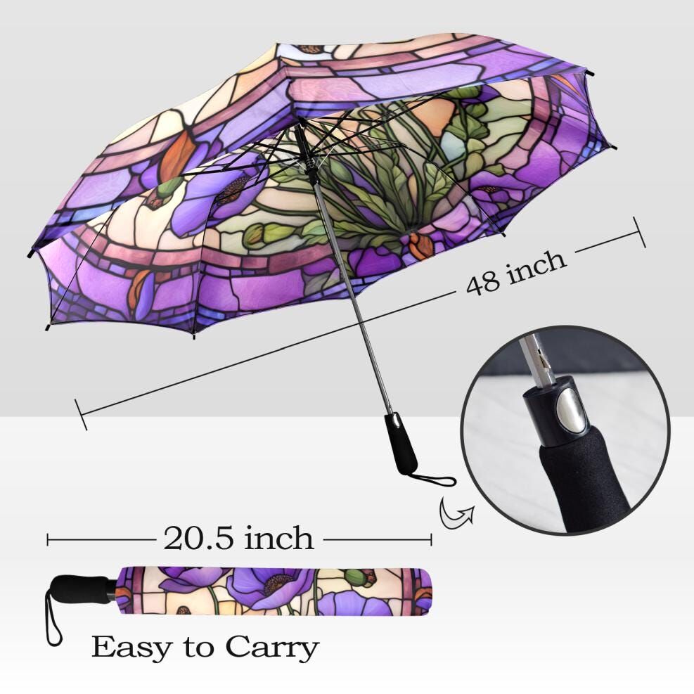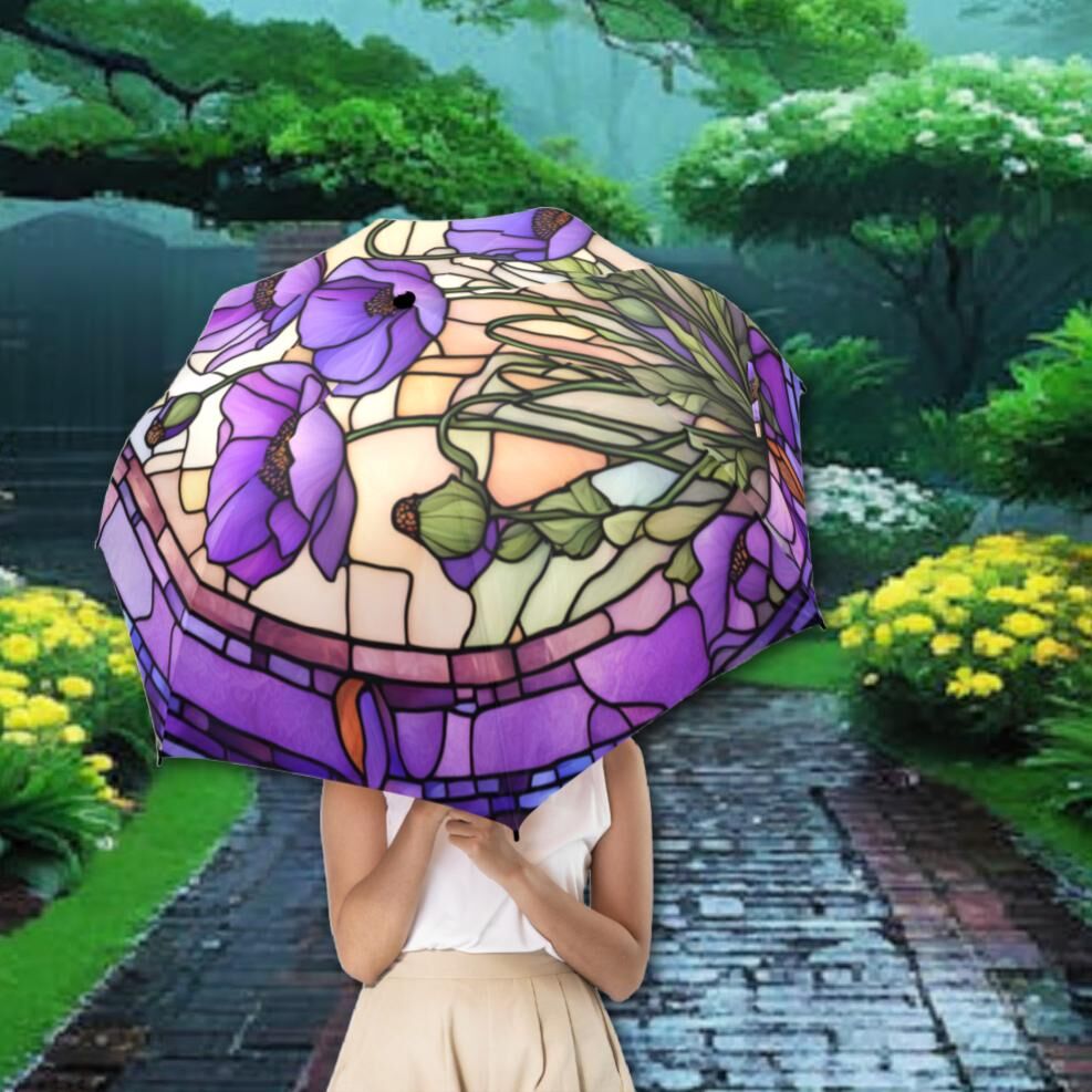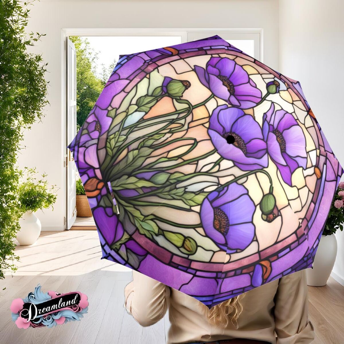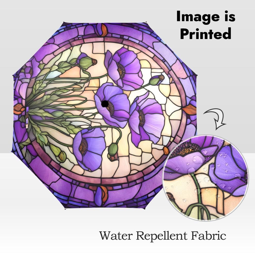 Purple Romantic Umbrella Poppy Wreath Faux Stained Glass Art Nouveau Flower Parasol Semi-Automatic Waterproof Foldable Umbrella