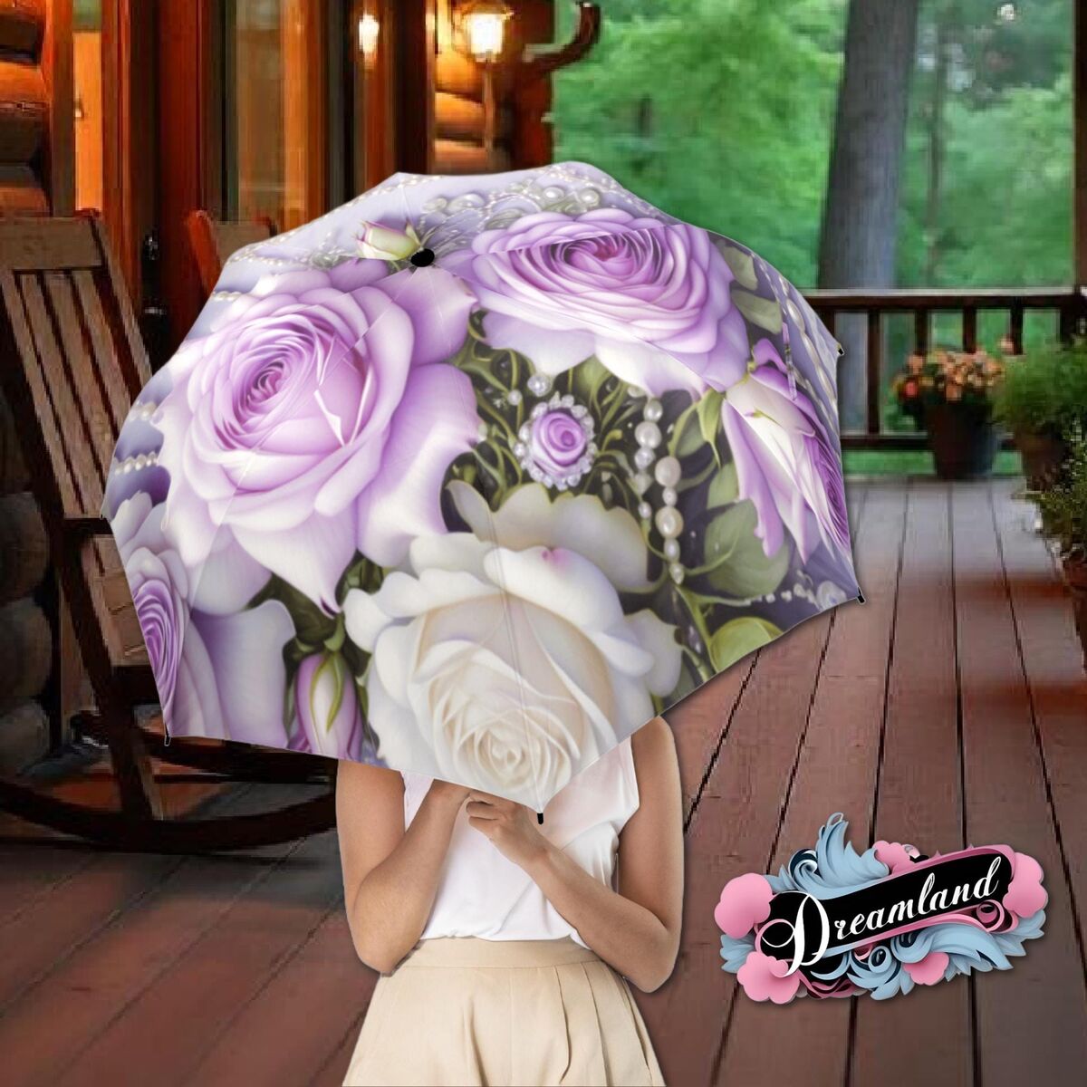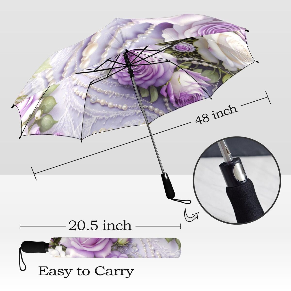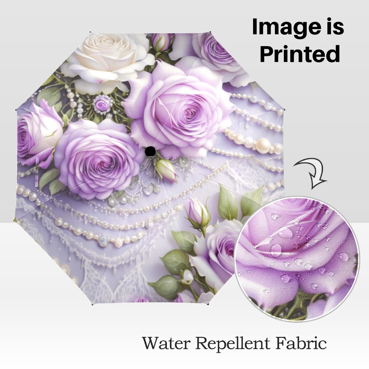 White Purple Flower Umbrella Floral Victorian Style Printed Faux Lace Pearls Roses Parasol Semi-Automatic Waterproof Foldable Umbrella