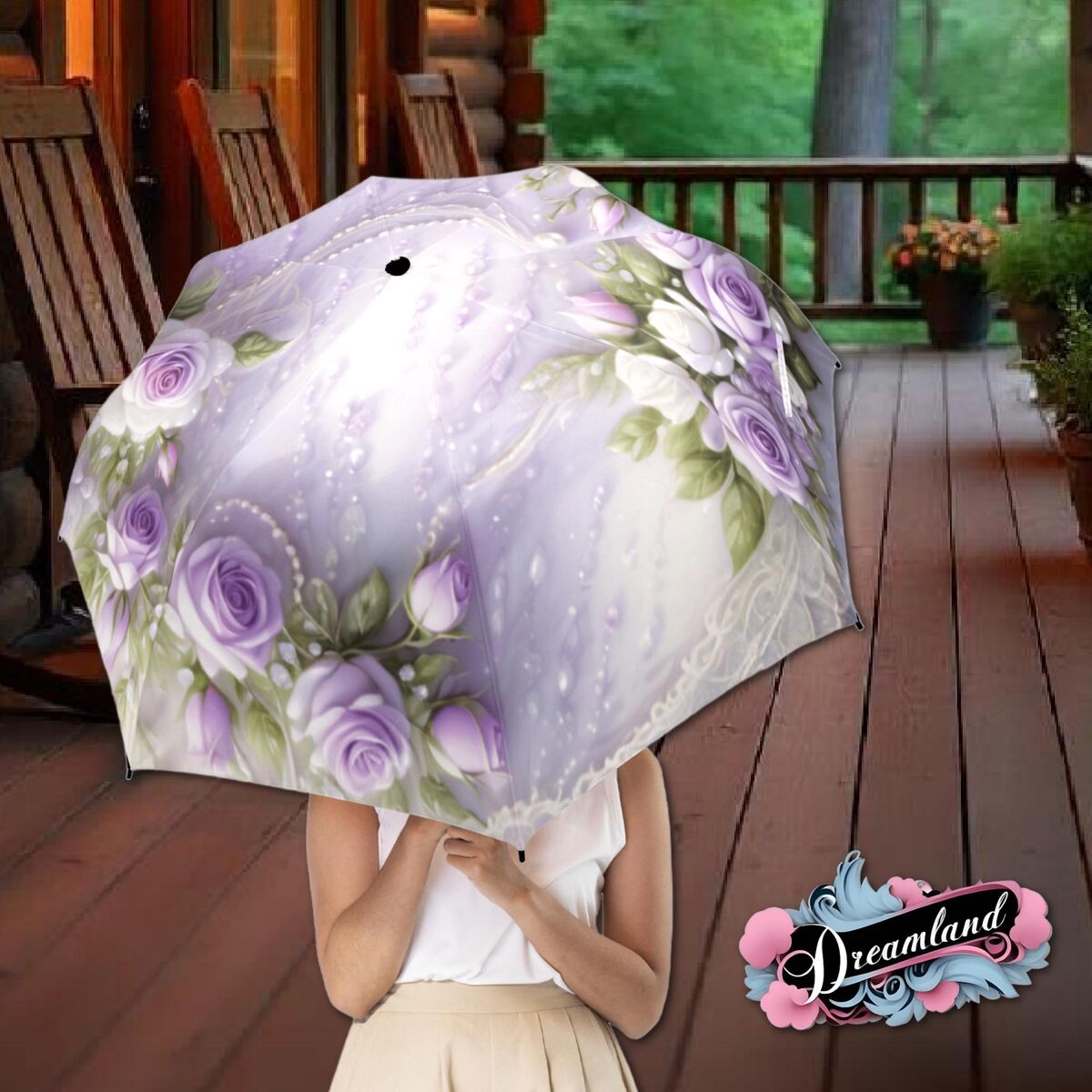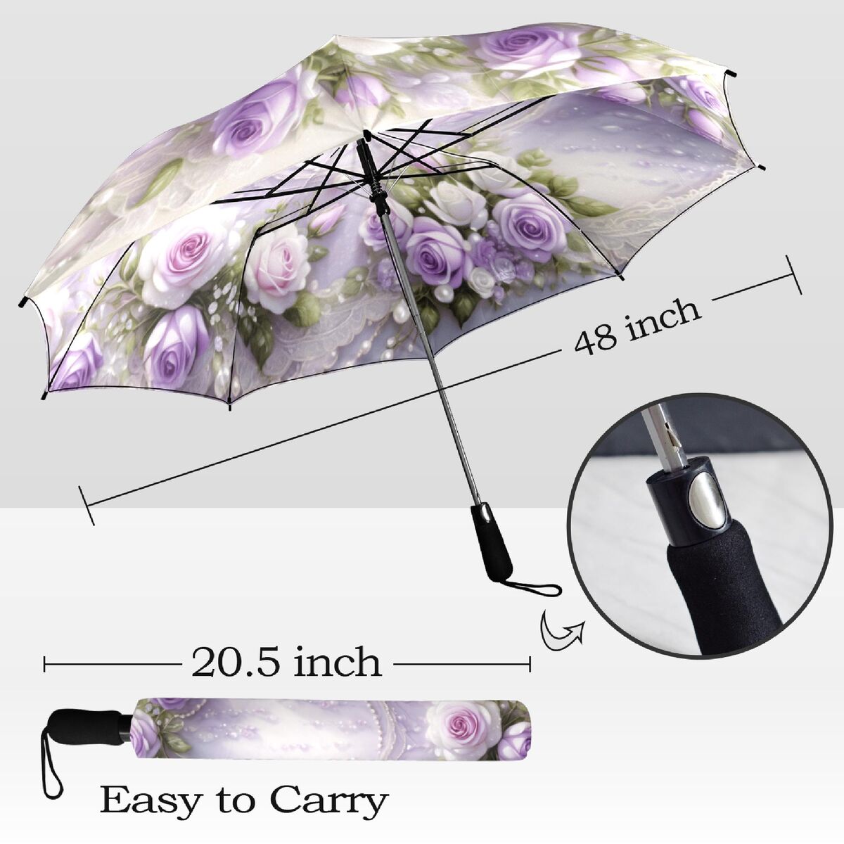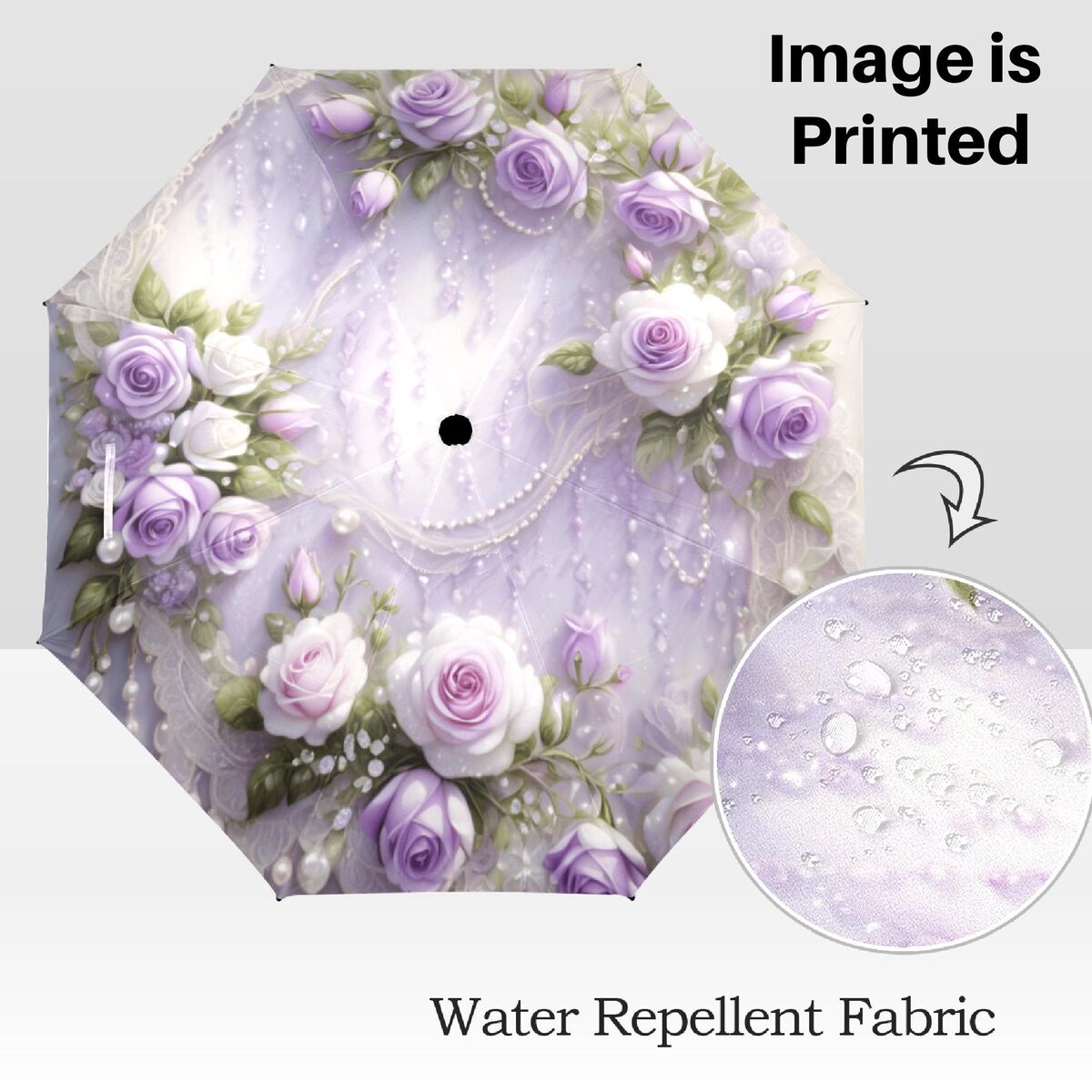 Purple Rose Umbrella Flower Floral Victorian Style Printed Faux Lsce Parasol Semi-Automatic Waterproof Foldable Umbrella