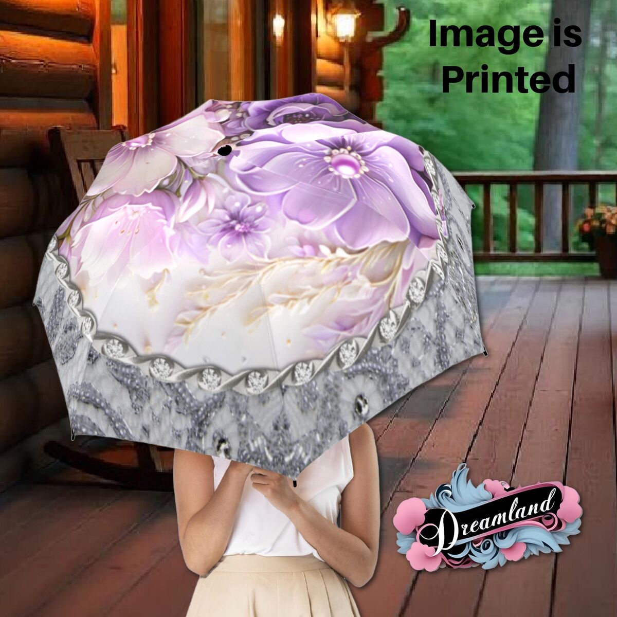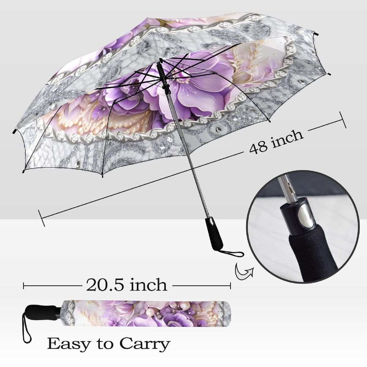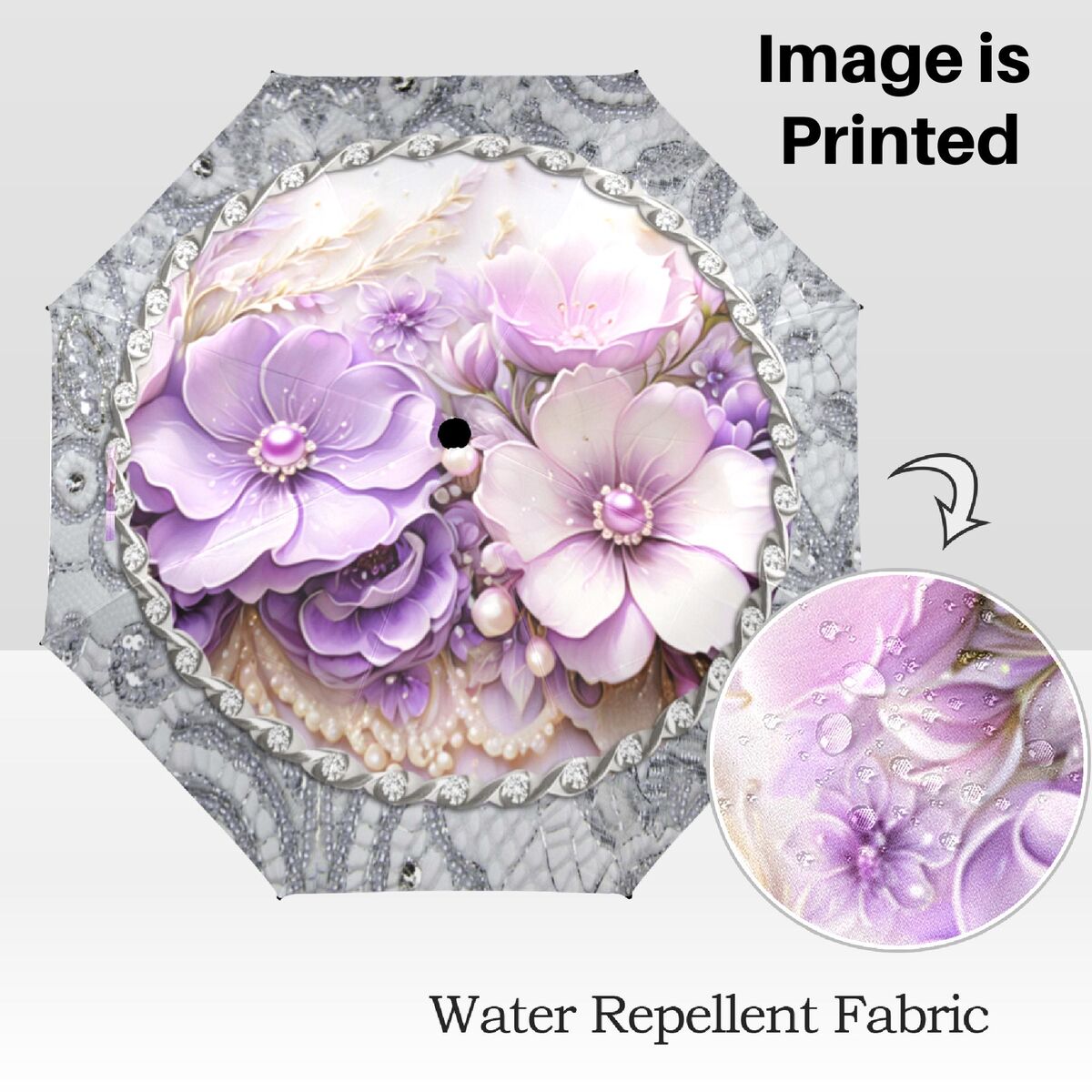 Purple Silver Gray Floral Unique Umbrella Art Nouveau Style Printed Faux Flower Lace Parasol Semi-Automatic Waterproof Foldable Umbrella