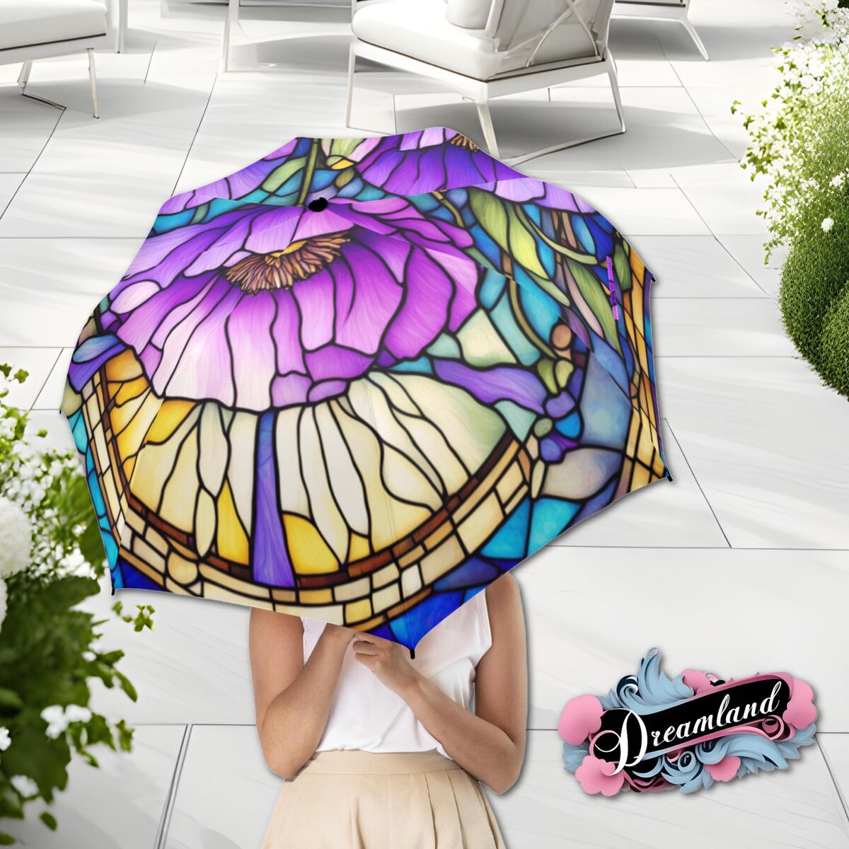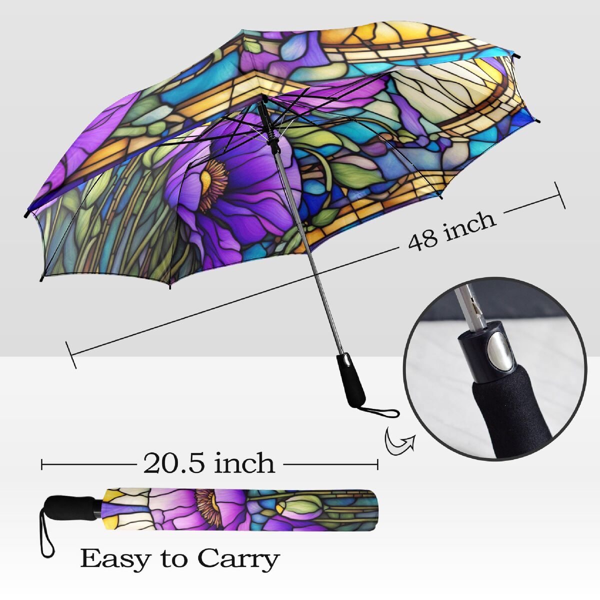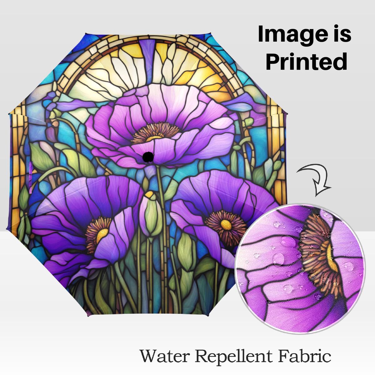 Purple Umbrella Romantic Floral Poppy Blossoms Faux Stained Glass Flower Parasol Semi-Automatic Waterproof Foldable Umbrella