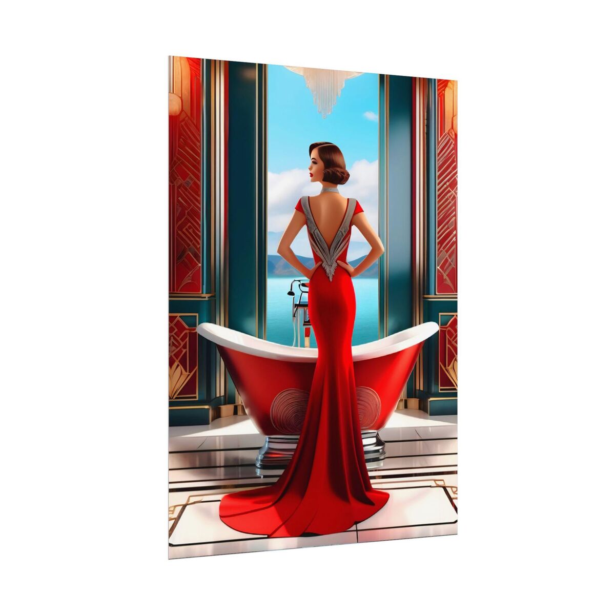 Enhance your bathroom decor with this stunning Art Deco Gatsby Girl 1920 Style Powder Room poster print. The retro design adds a touch of elegance and sophistication to any space, making it a perfect addition to your home.