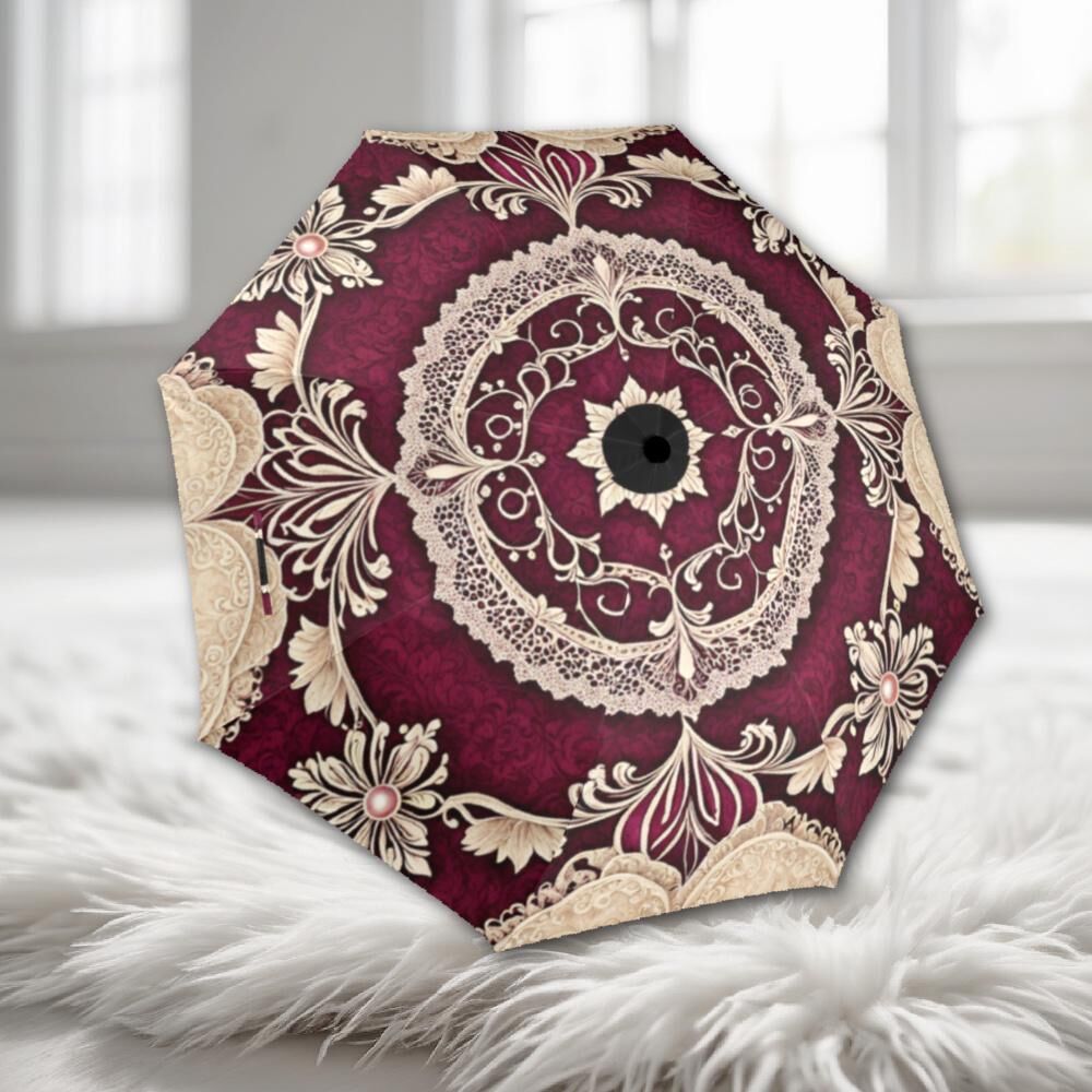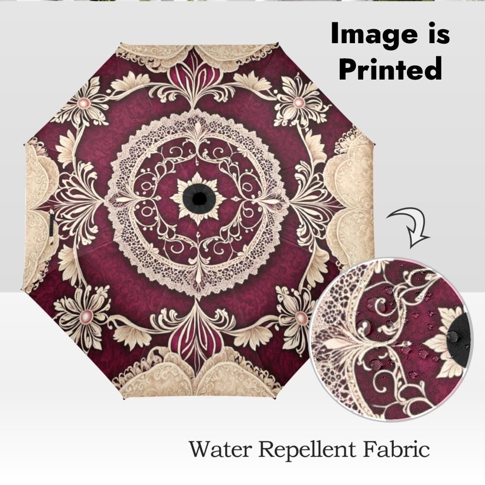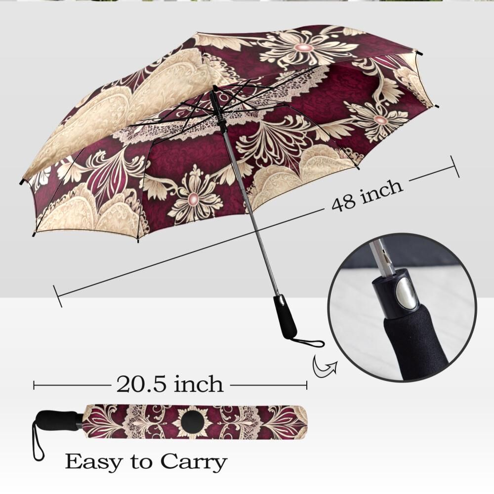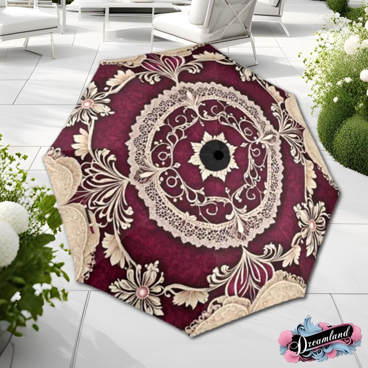 Red Beige Romantic Umbrella Victorian Inspired Burgundy Faux Beaded Parasol Semi-Automatic Waterproof Foldable Umbrella