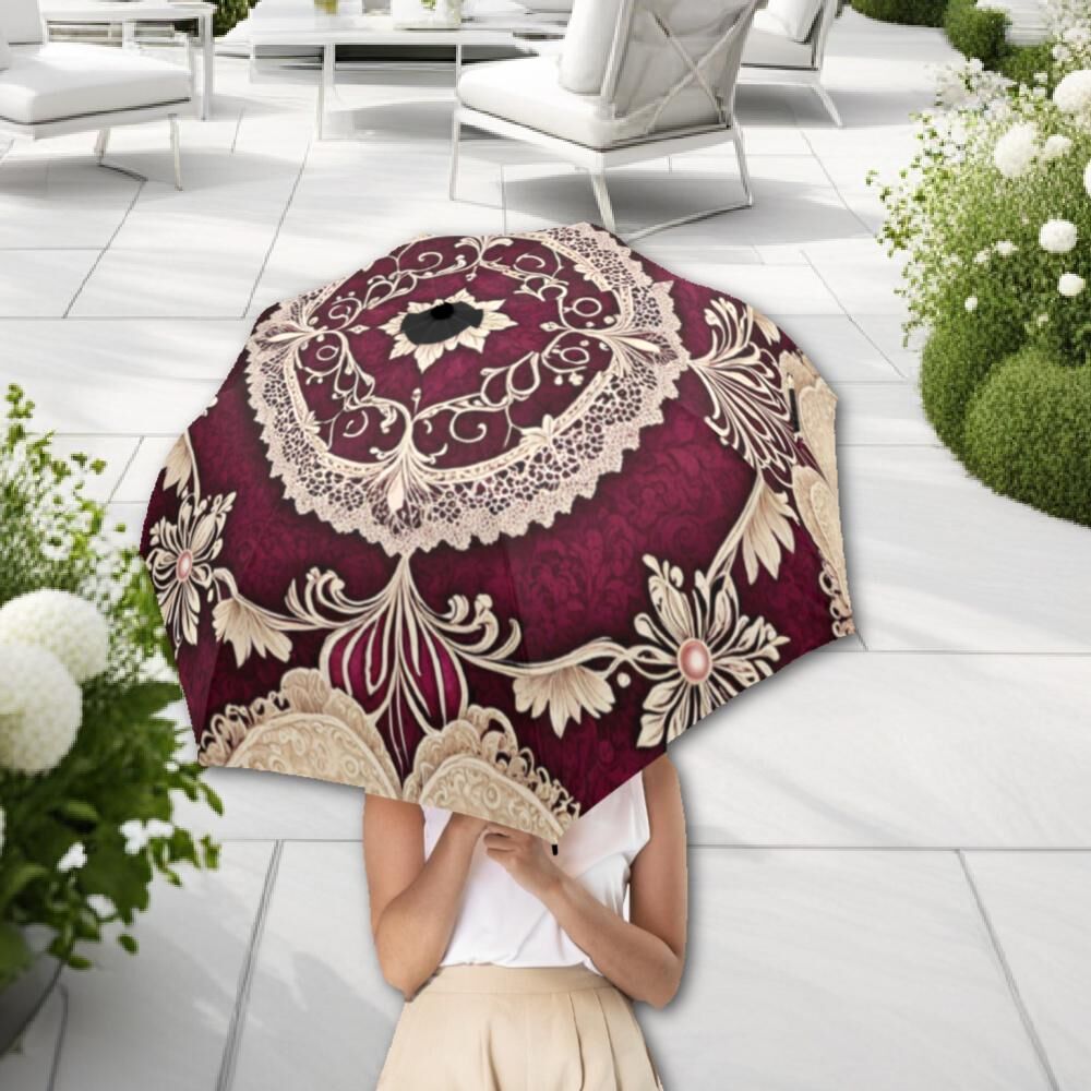 Red Gothic Black Umbrella Flower Romantic Art Nouveau Floral Faux Printed Lace Parasol Semi-Automatic Waterproof Foldable Umbrella