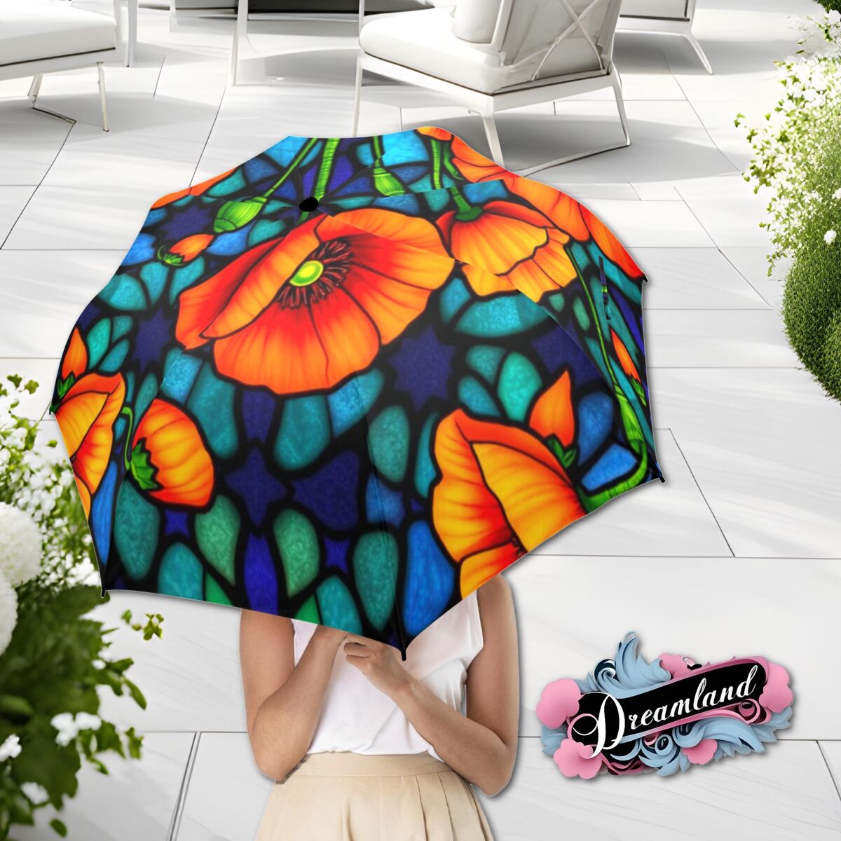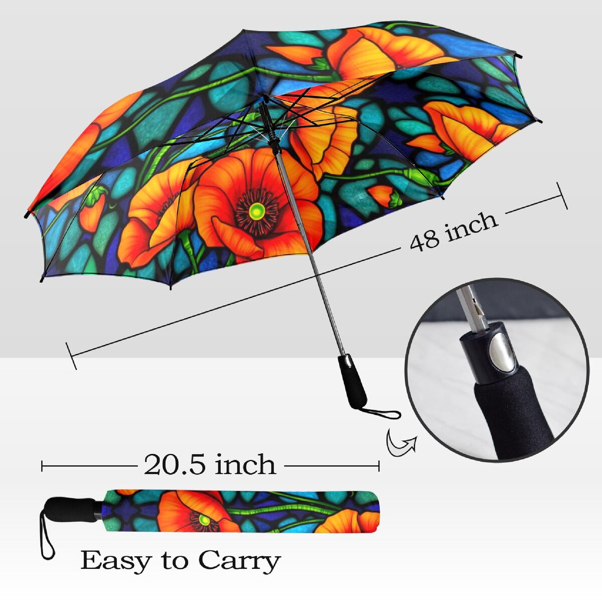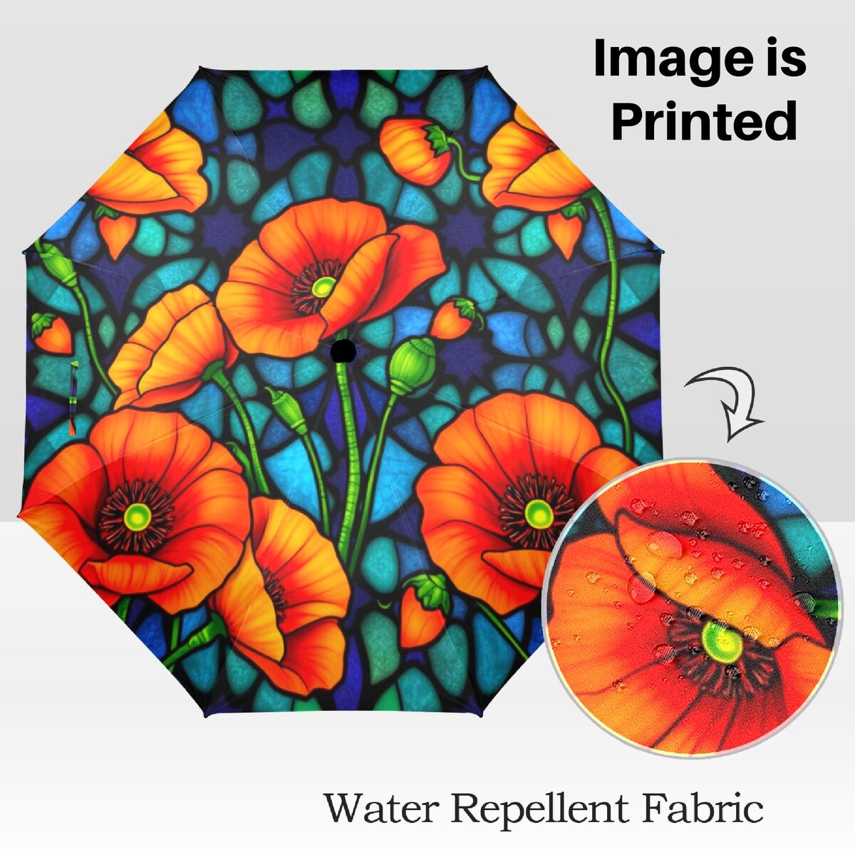 Red Blue Flowers Umbrella Romantic Poppy Flowers Floral Art Nouveau Faux Stained Glass Parasol Semi-Automatic Waterproof Foldable Umbrella