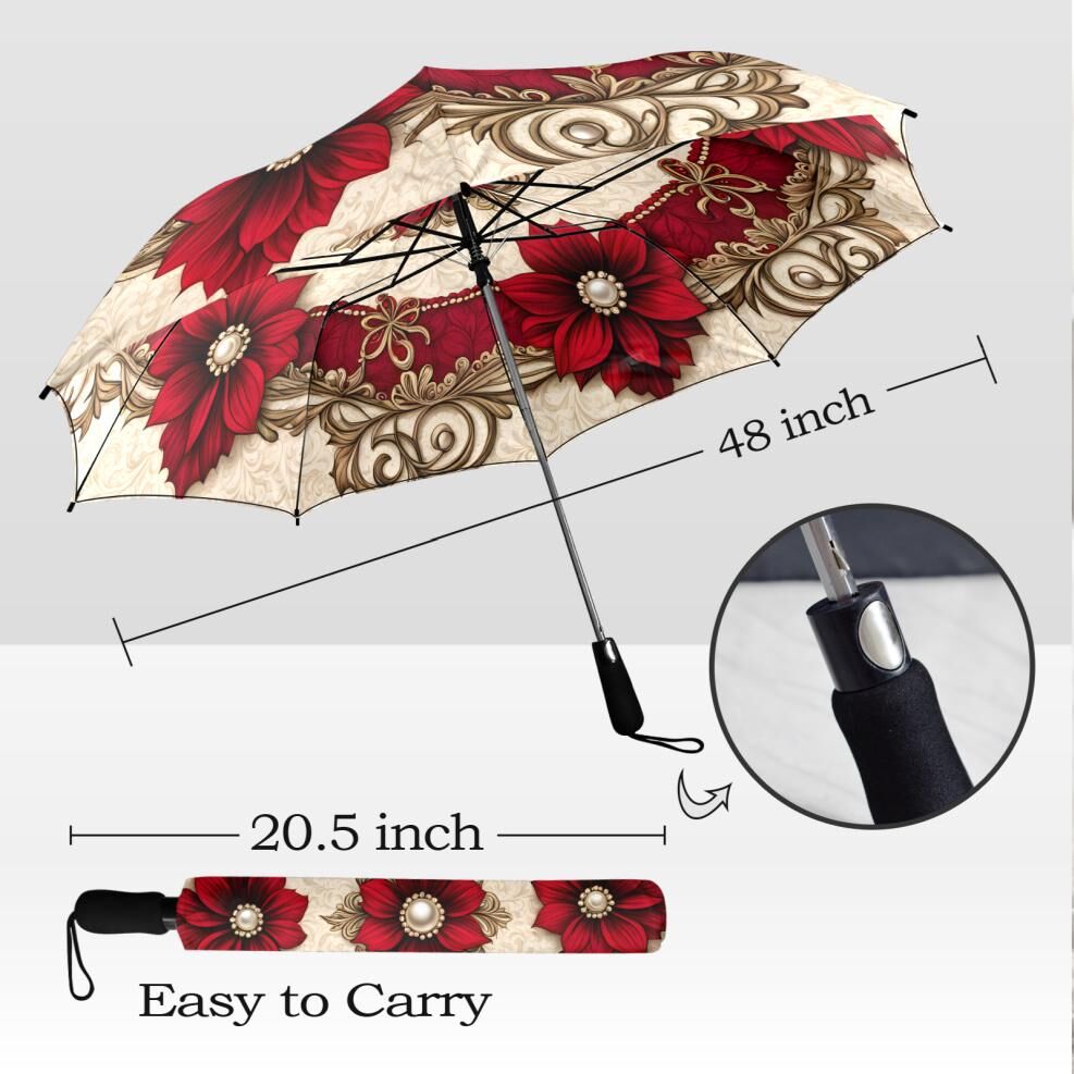 Gold Red White Flower Umbrella Romantic Magnolia Floral Art Nouveau Faux Stained Glass Parasol Semi-Automatic Waterproof Foldable Umbrella