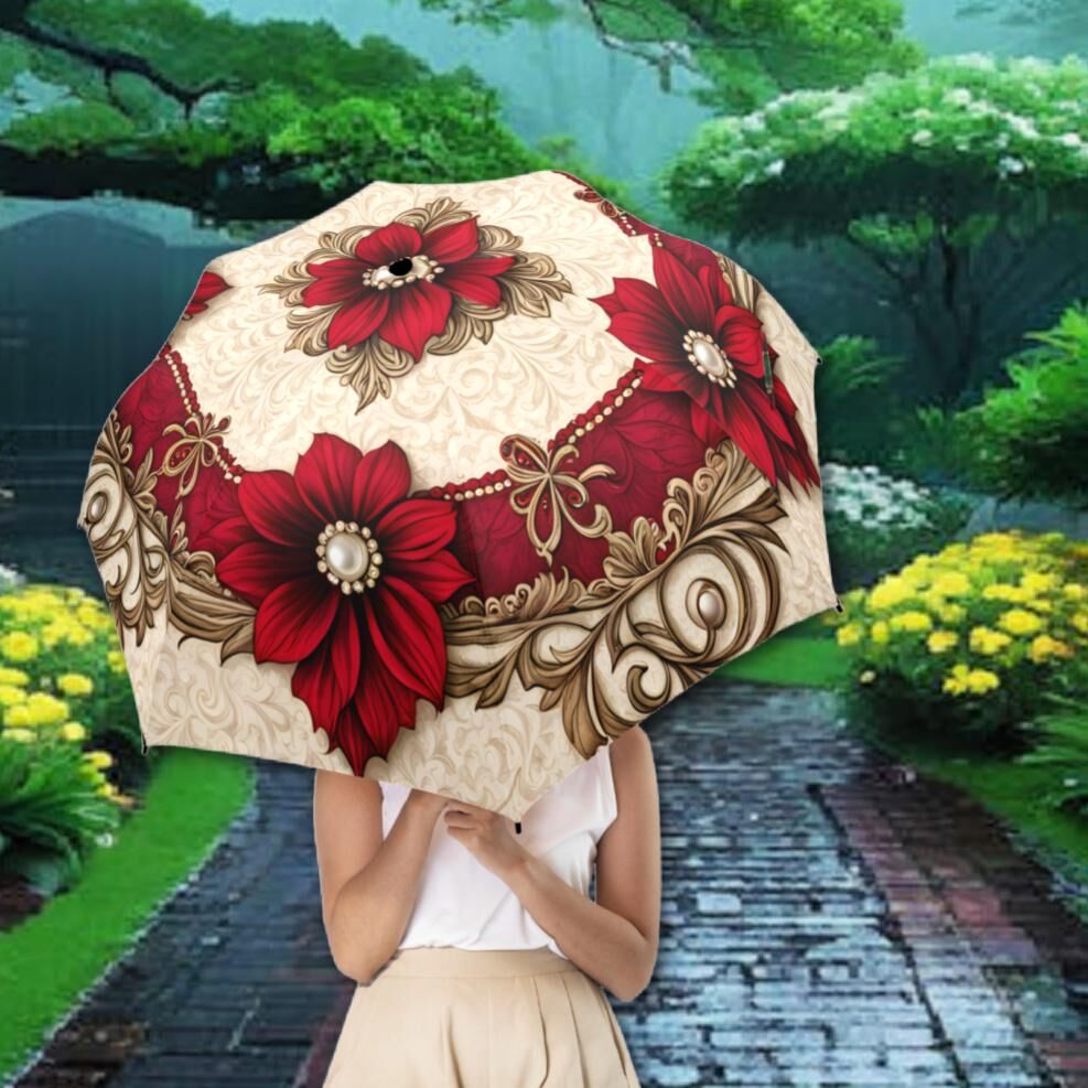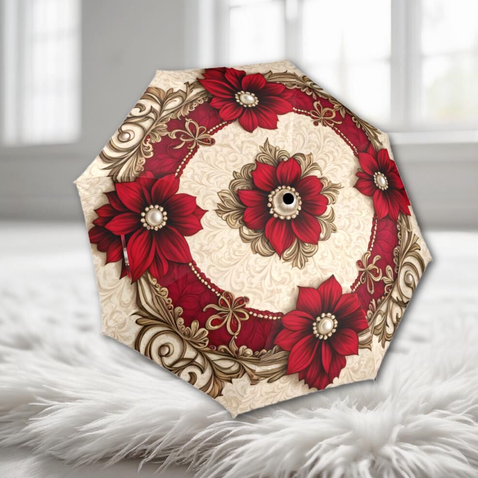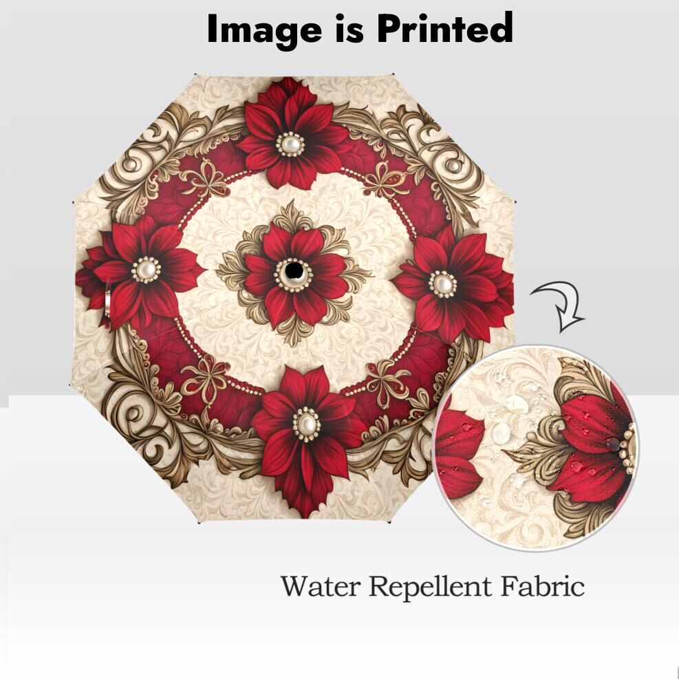 Red Cream Tan Romantic Umbrella Victorian Inspired Boho Flower Parasol Semi-Automatic Waterproof Foldable Umbrella