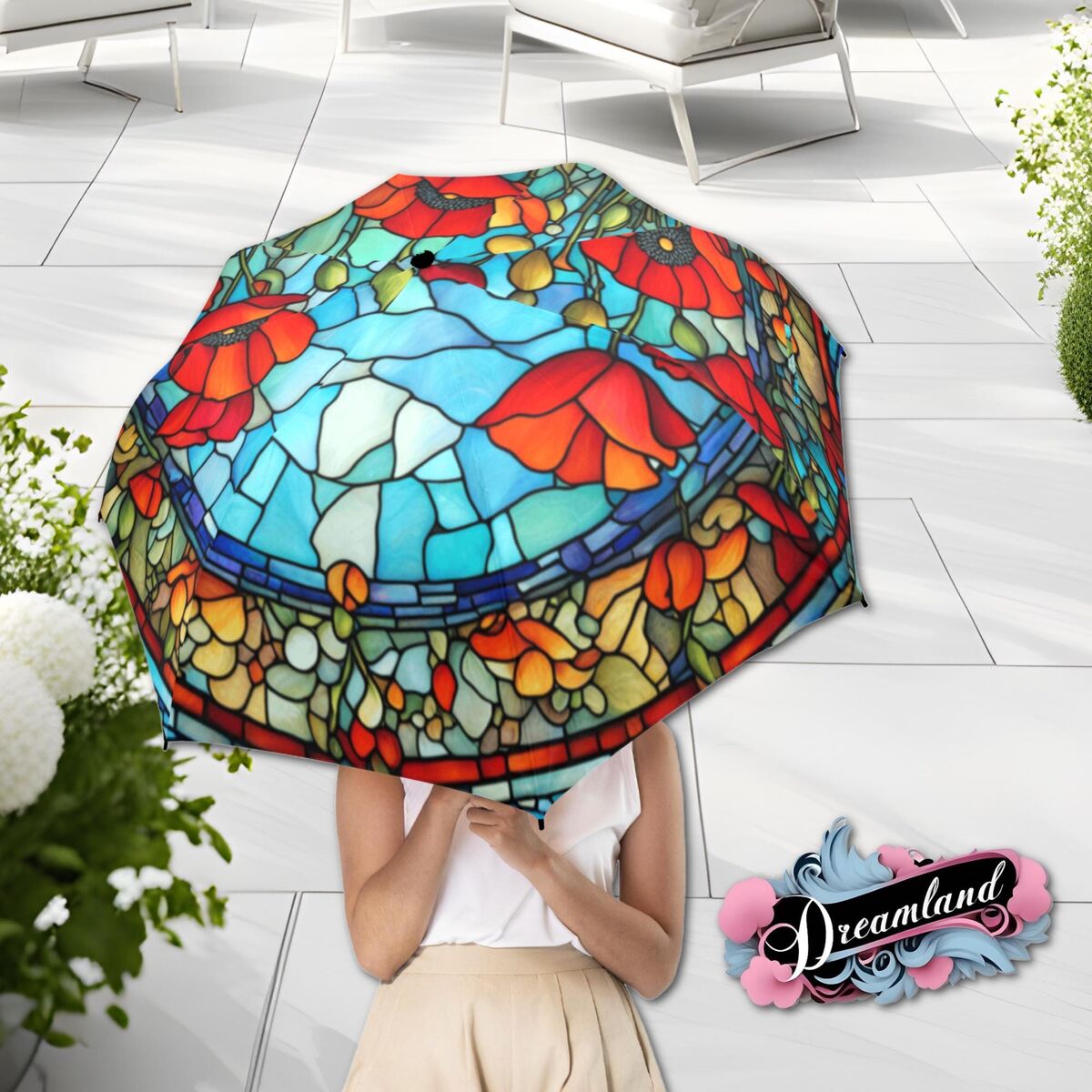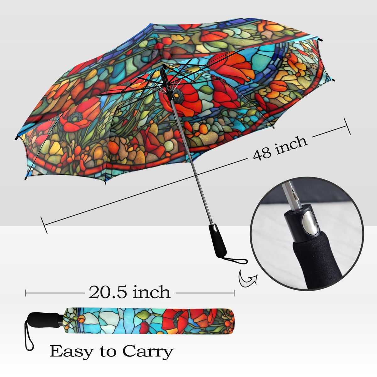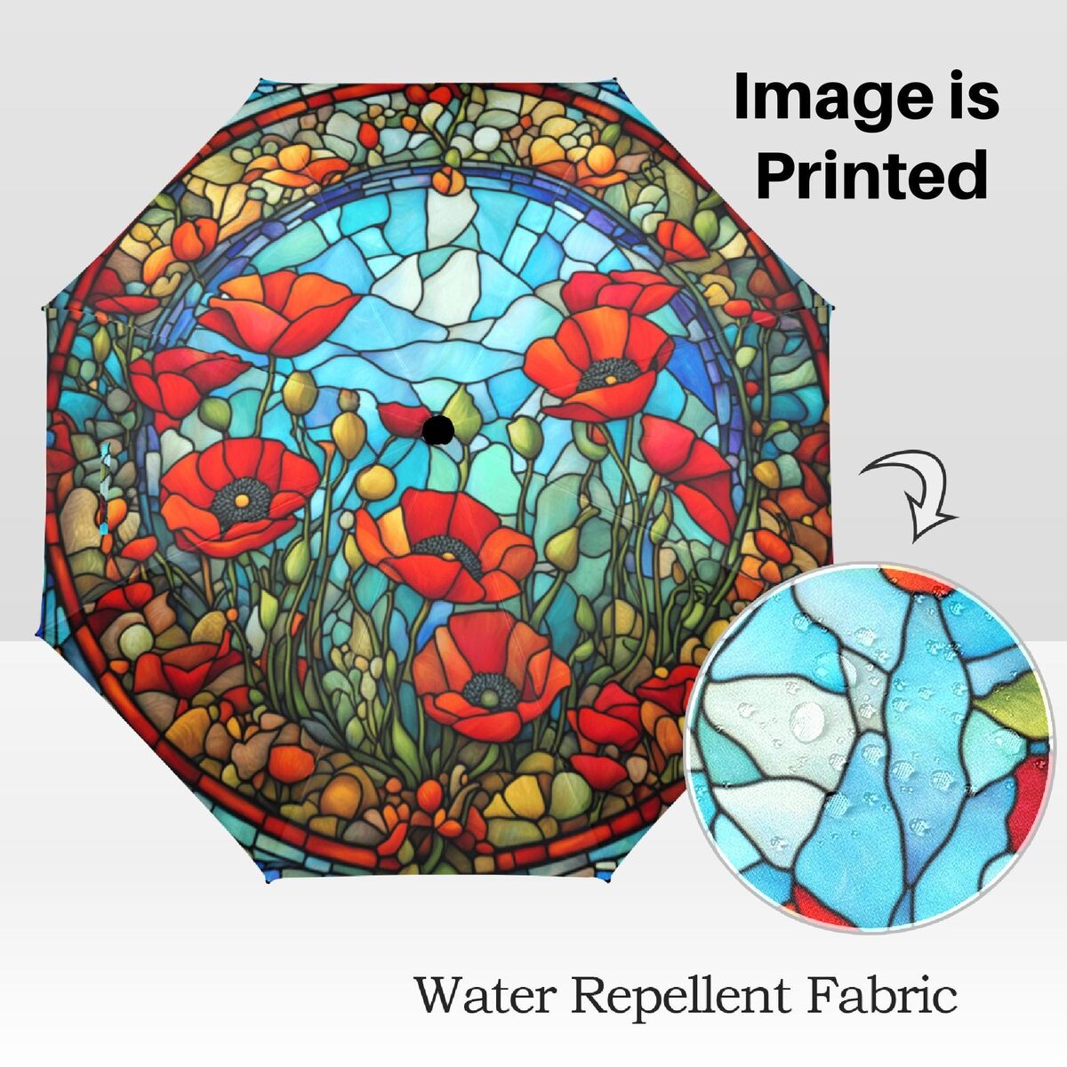 Red Flower Umbrella Romantic Art Nouveau Poppies Floral Blossoms Faux Stained Glass Parasol Semi-Automatic Waterproof Foldable Umbrella