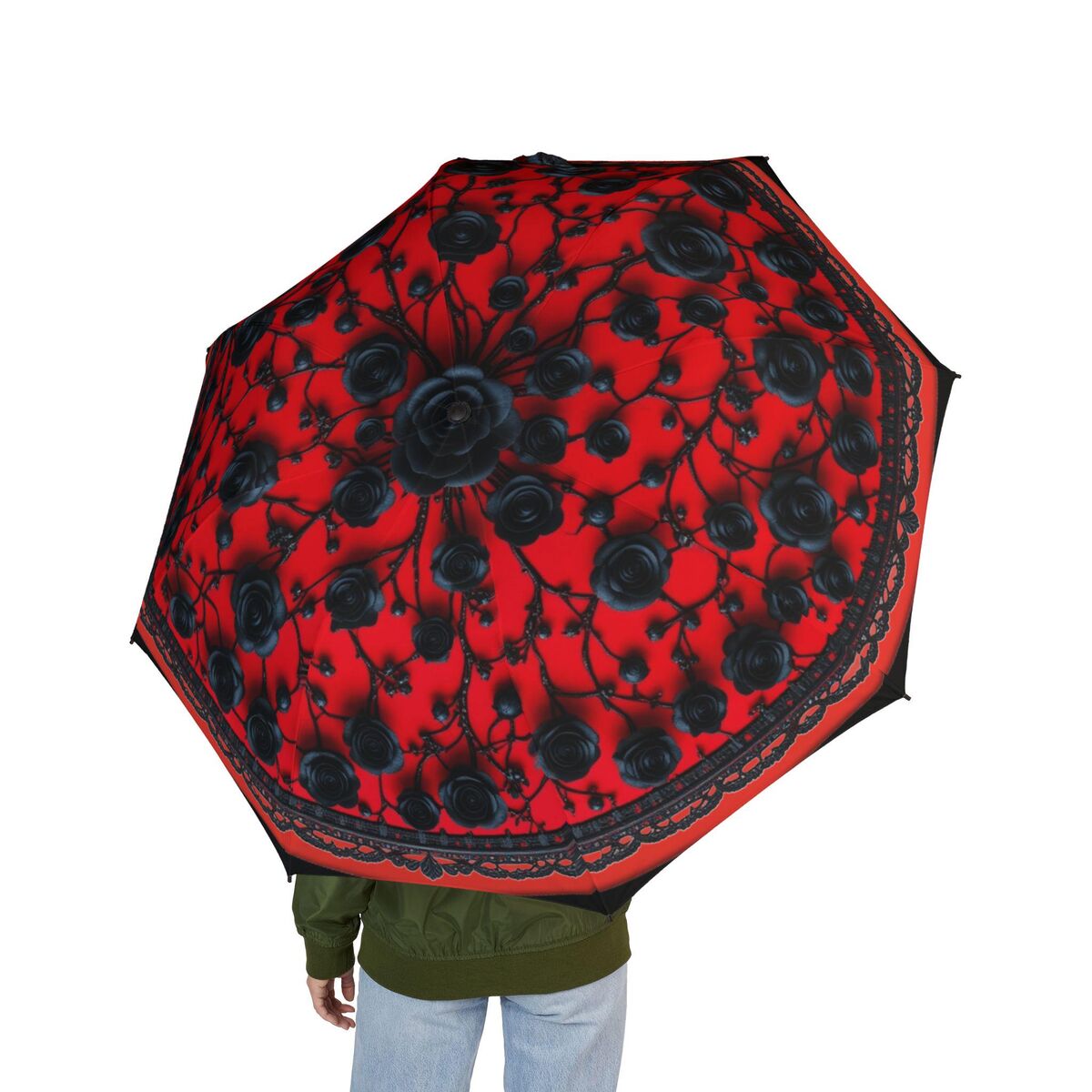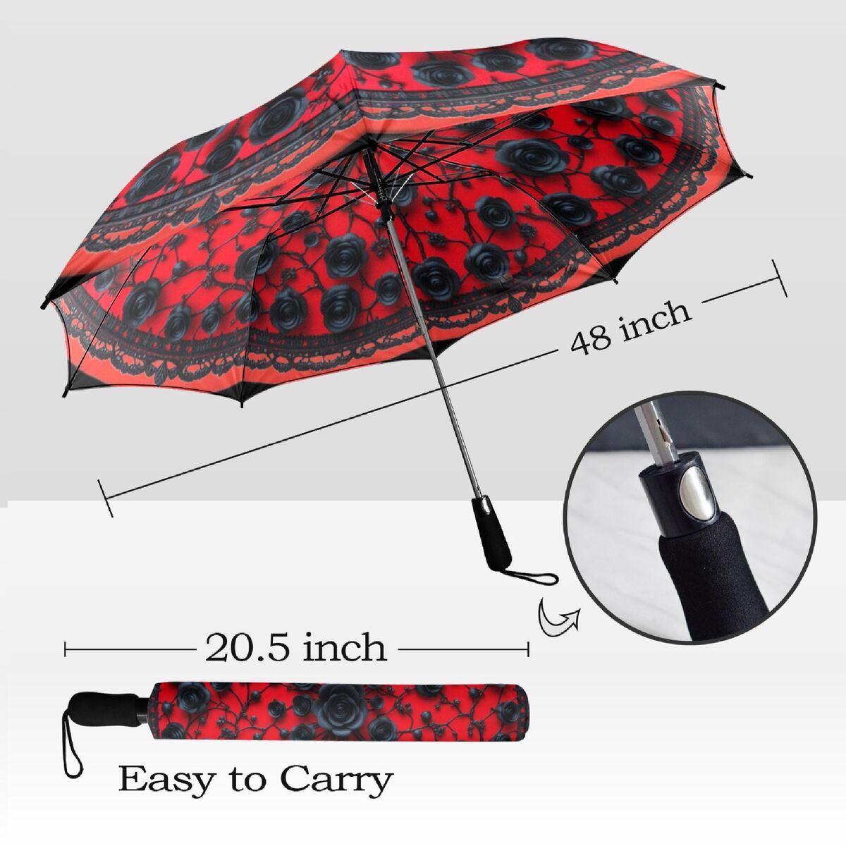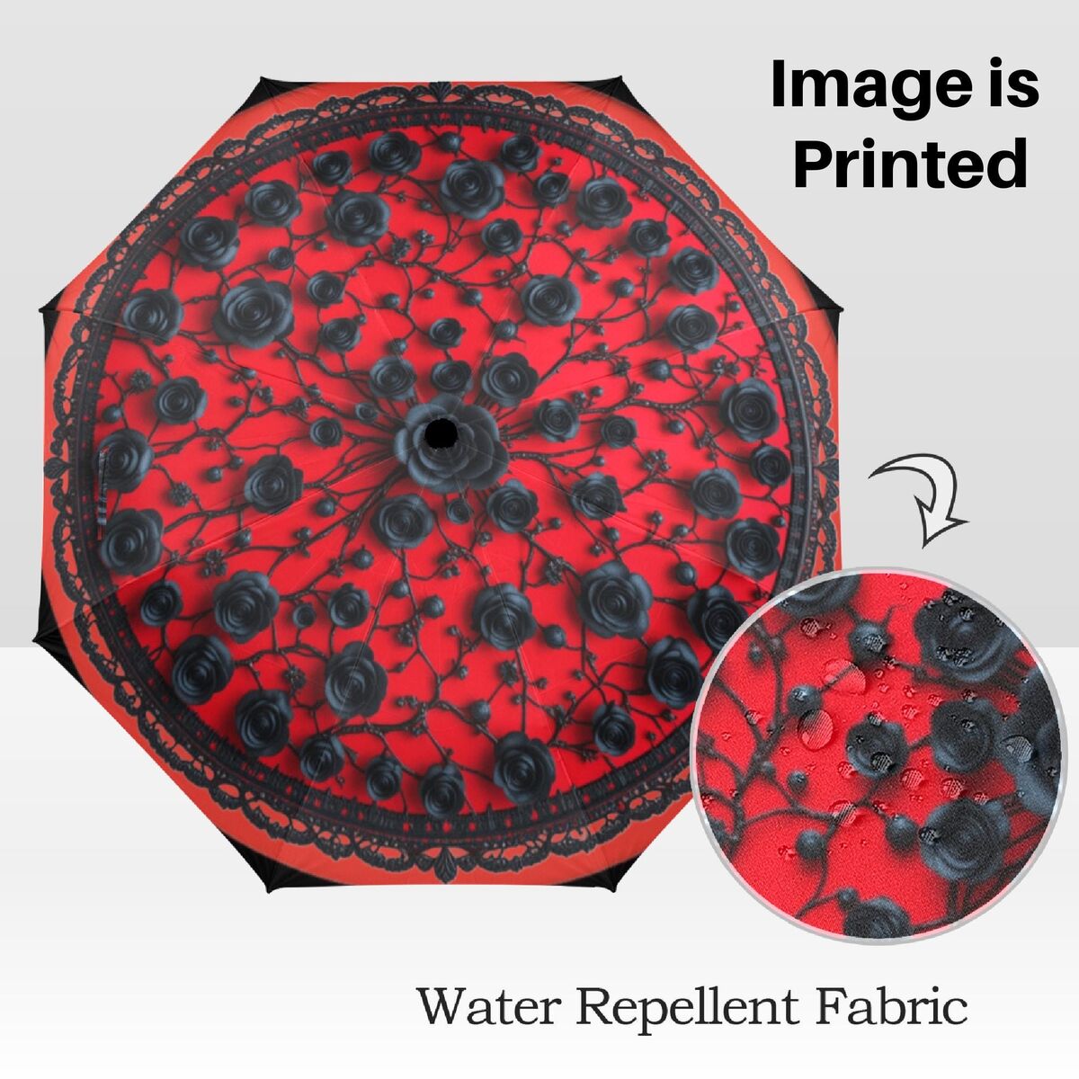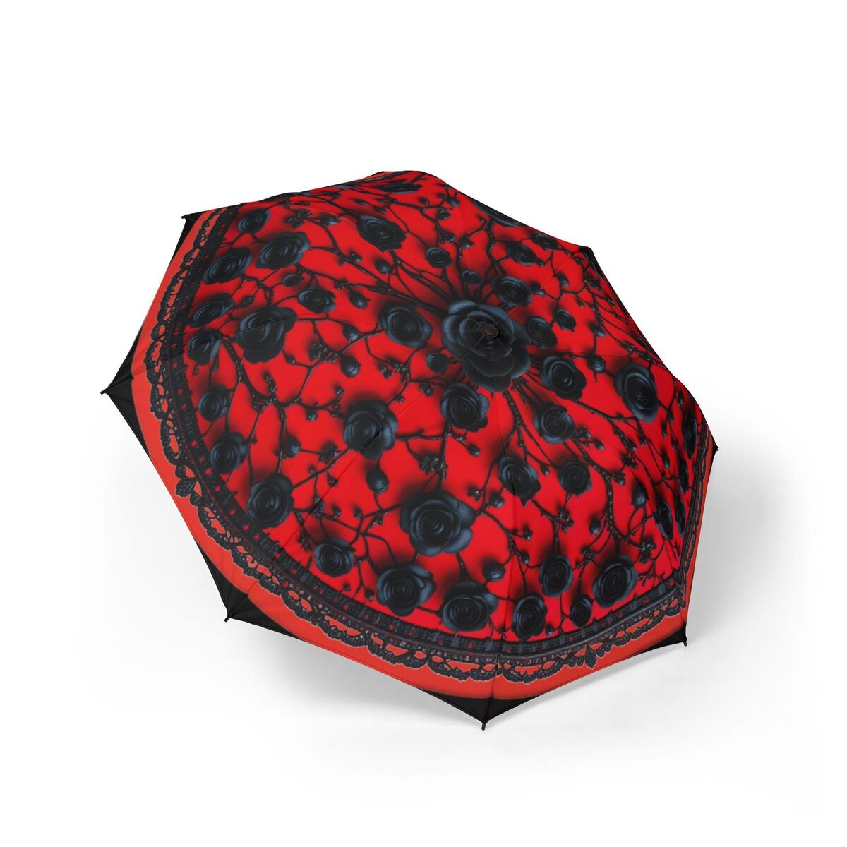 Red Gothic Black Umbrella Flower Romantic Art Nouveau Floral Faux Printed Lace Parasol Semi-Automatic Waterproof Foldable Umbrella