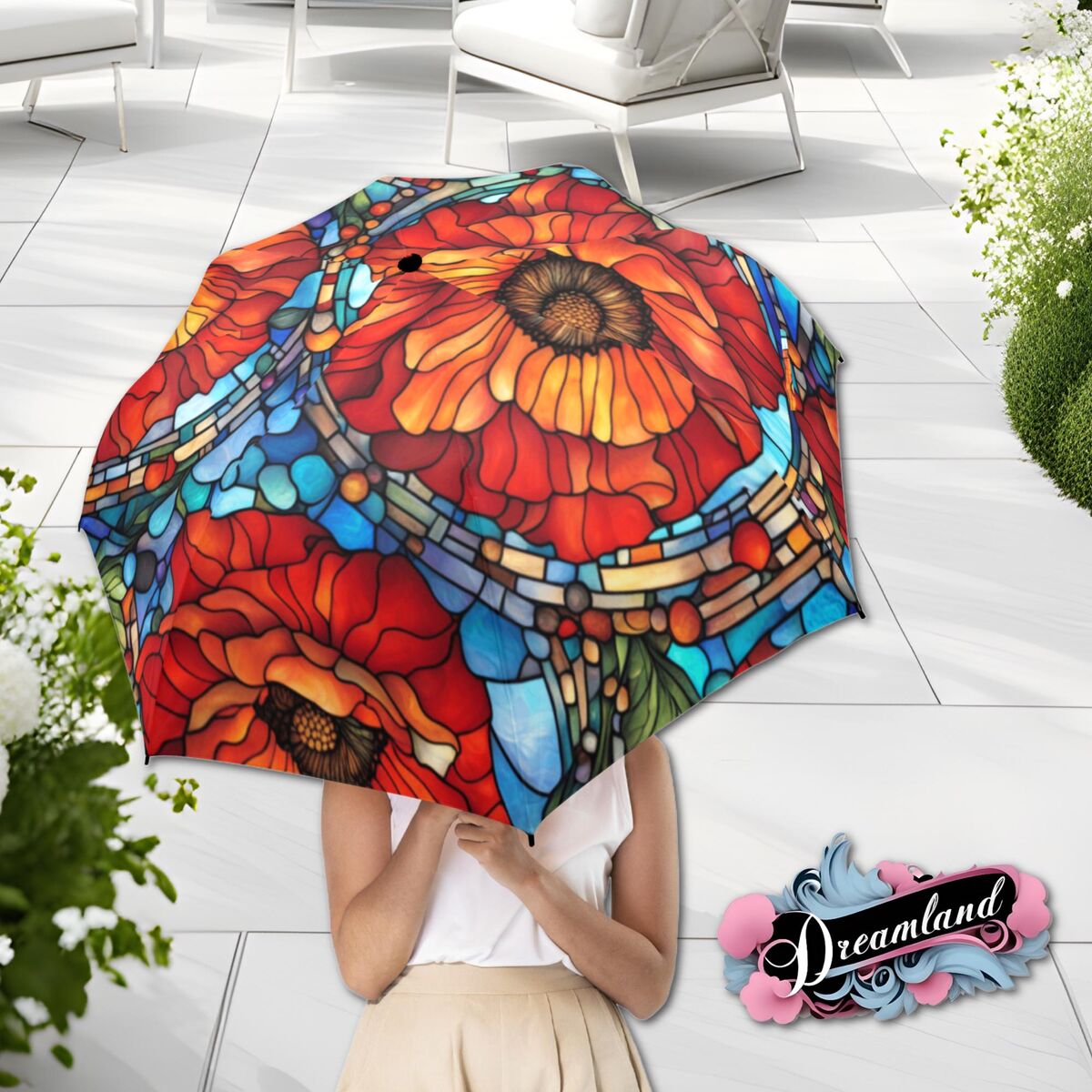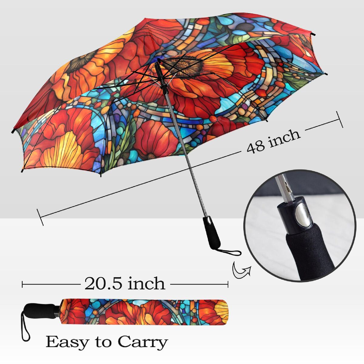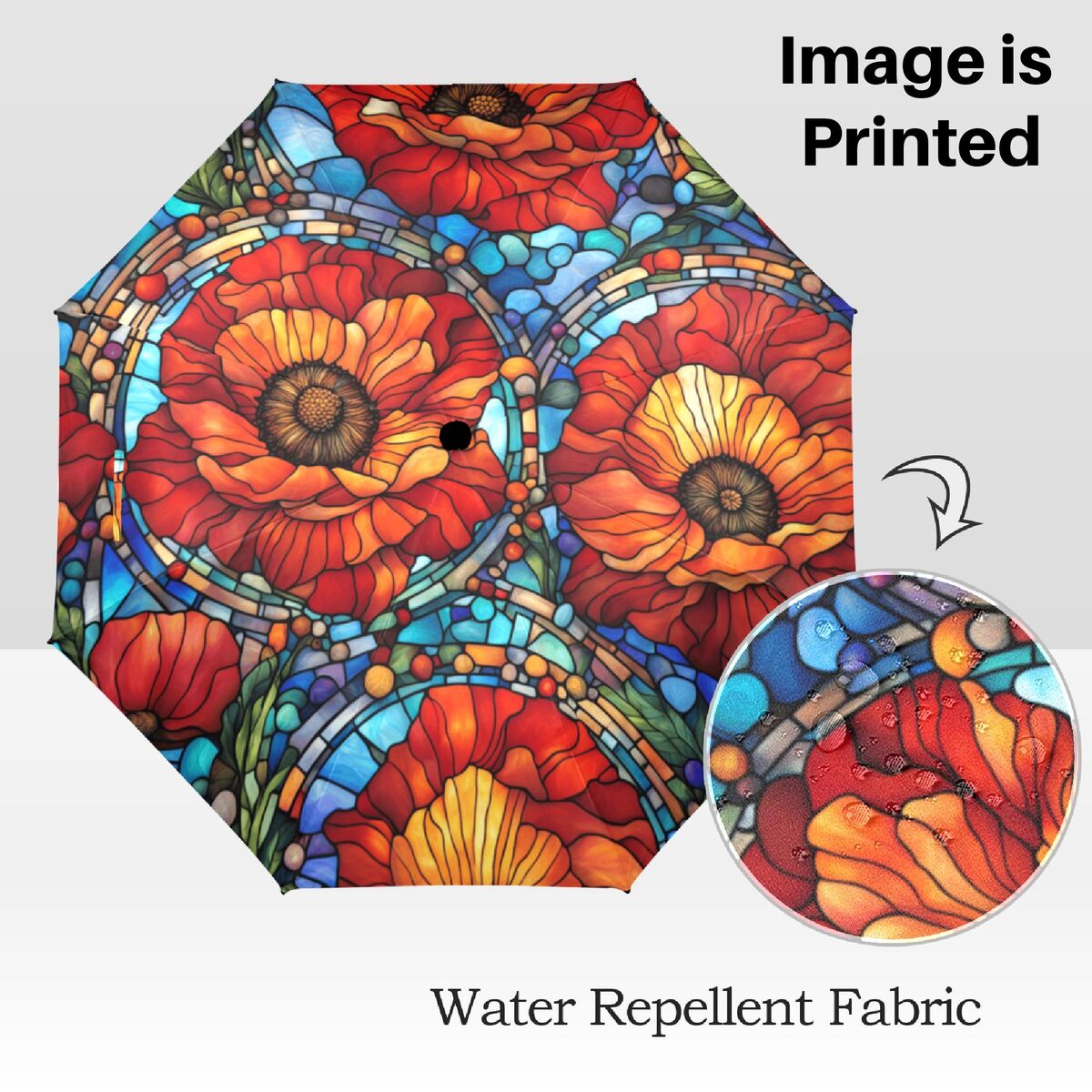 Red Poppy Floral Umbrella Romantic Floral Blossoms Faux Stained Glass Flower Parasol Semi-Automatic Waterproof Foldable Umbrella
