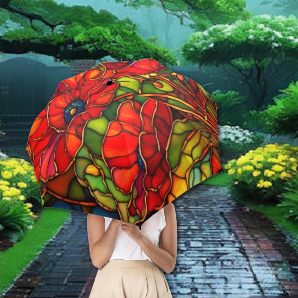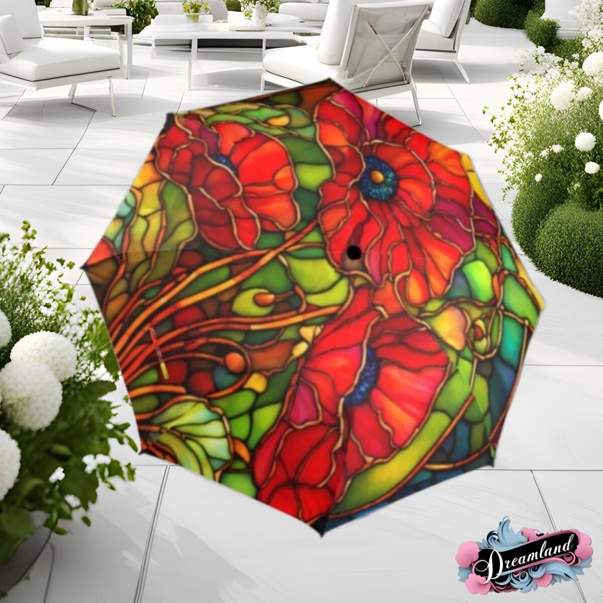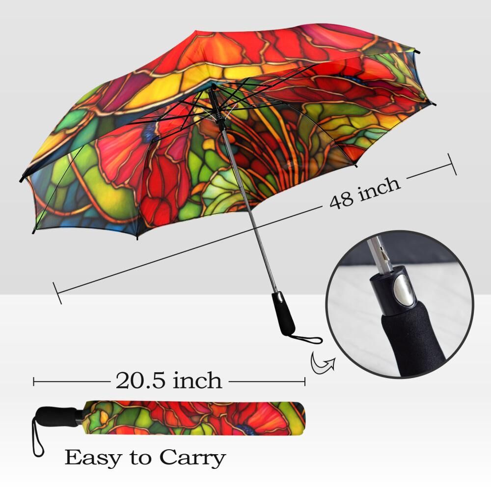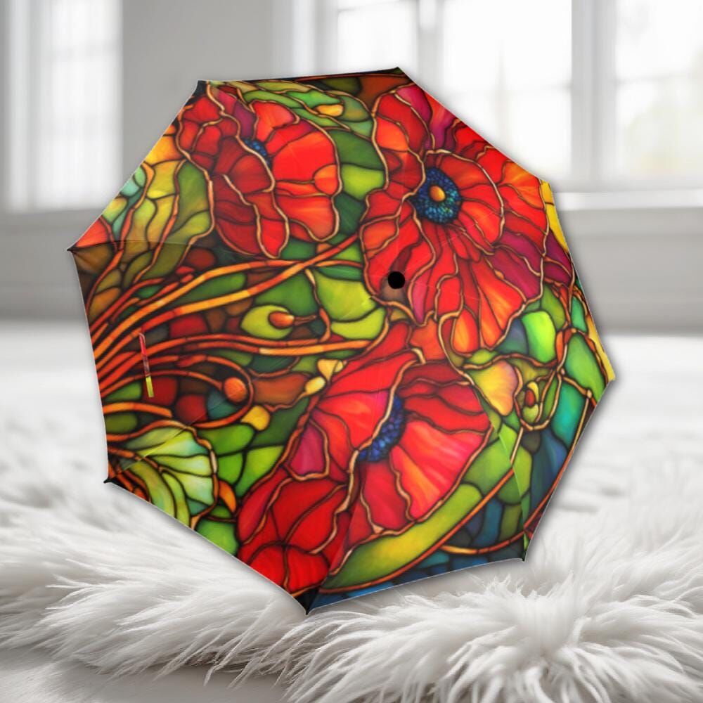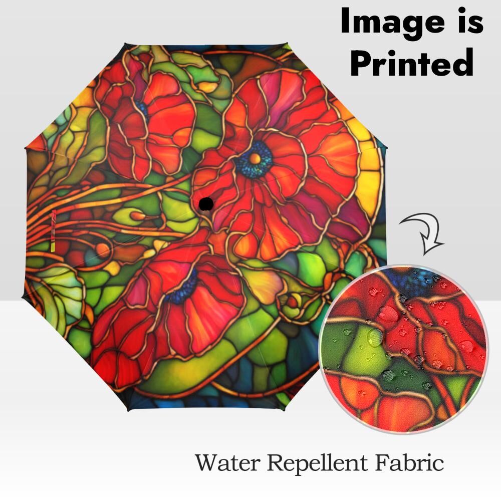 Red Poppy Romantic Umbrella Victorian Inspired Faux Stained Glass Flower Parasol Semi-Automatic Waterproof Foldable Umbrella