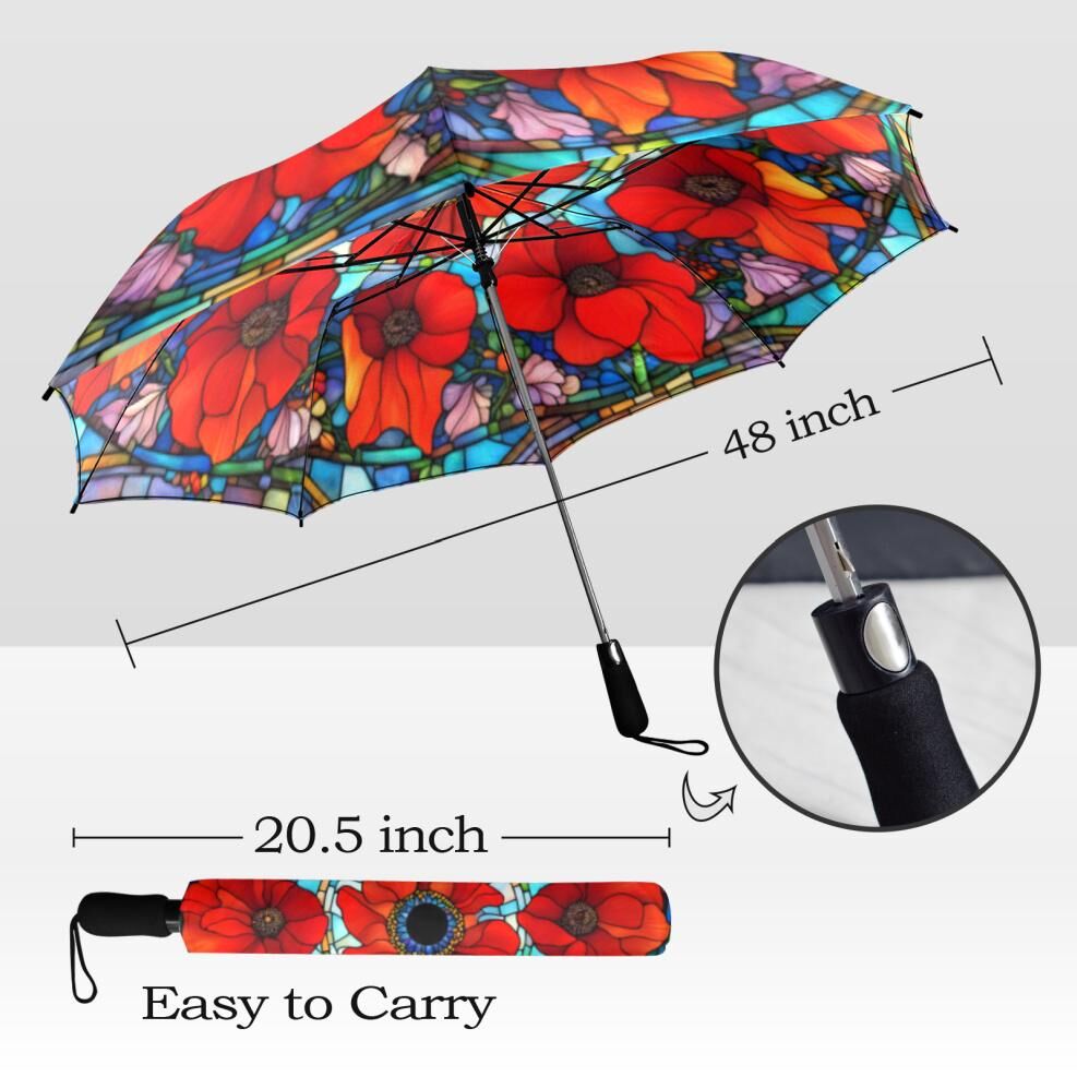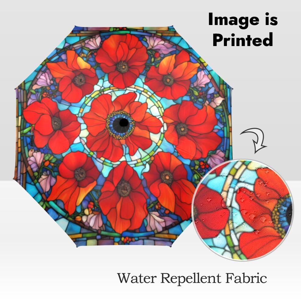 Umbrella Red Stained Glass Art Nouveau Poppies Red Parasol Semi-Automatic Waterproof Foldable Umbrella