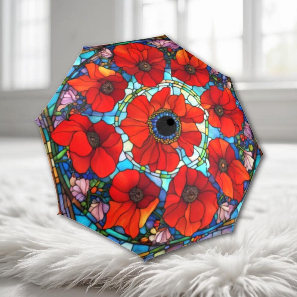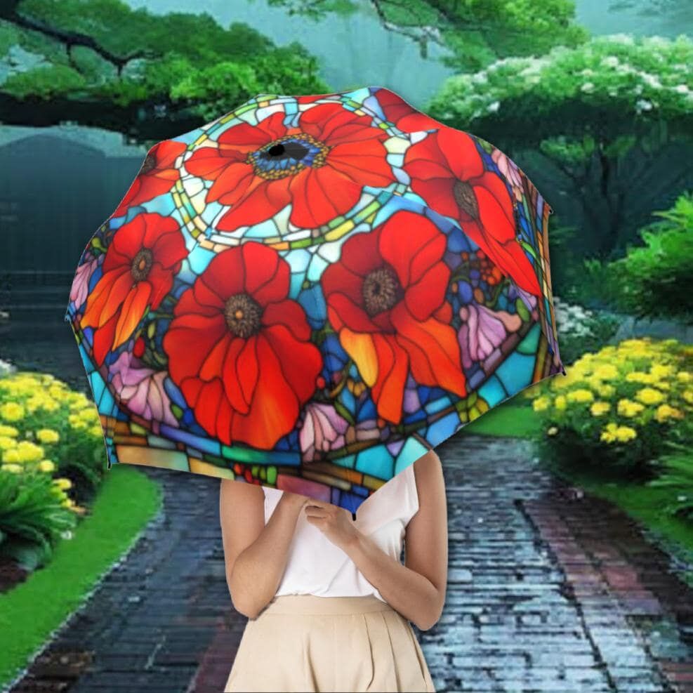 Red Romantic Umbrella Poppy Wreath Faux Stained Glass Art Nouveau Flower Parasol Semi-Automatic Waterproof Foldable Umbrella