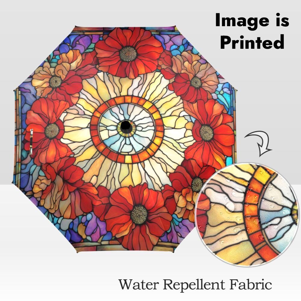 Red Umbrella Stained Glass Art Nouveau Poppies Red Parasol Semi-Automatic Waterproof Foldable Umbrella