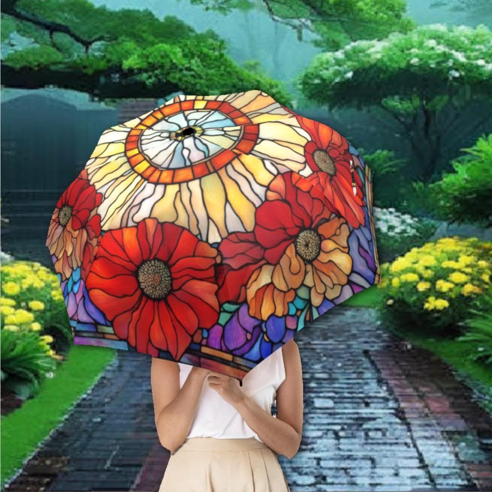 Sunrise Poppy Flower Romantic Umbrella Blossoms Faux Stained Glass Flower Parasol Semi-Automatic Waterproof Foldable Umbrella