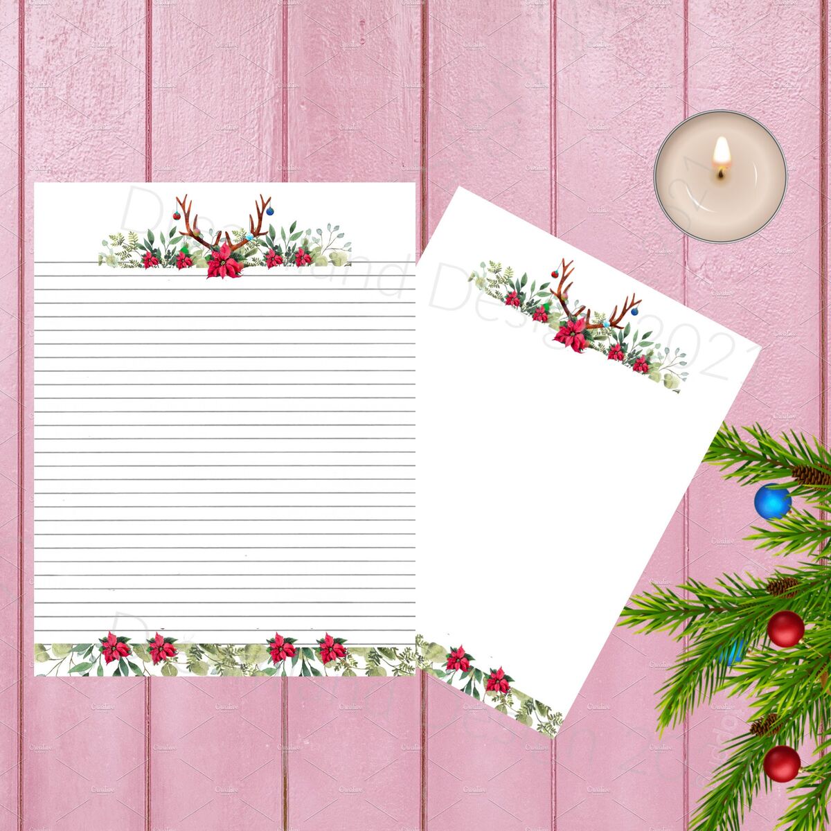 Reindeer Stationary Christmas Note Book Printable Blank Digital Writing Paper Holiday Floral Lined Note Book Flower Watercolor Roses Paper