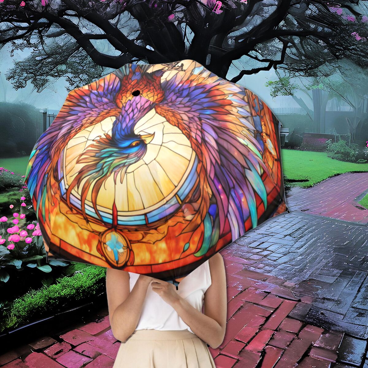 This Umbrella is inspired by the myth of the phoenix, adding a touch of elegance to your rainy days. The semi-automatic design makes it easy to open and close, while the waterproof material ensures you stay dry in style.