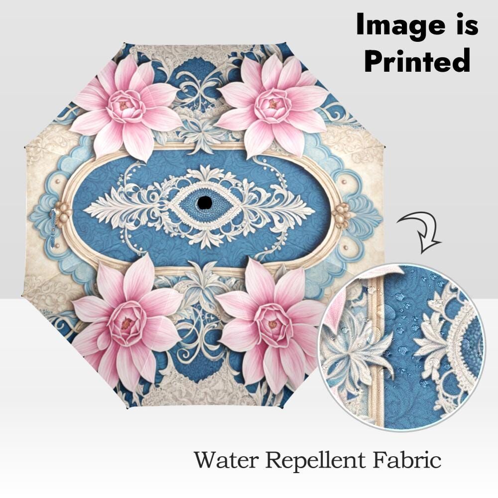 Roses Umbrella Romantic Flower Floral Art Nouveau Style Printed Blue Faux Floral Lace Parasol Semi-Automatic Waterproof Foldable Umbrella