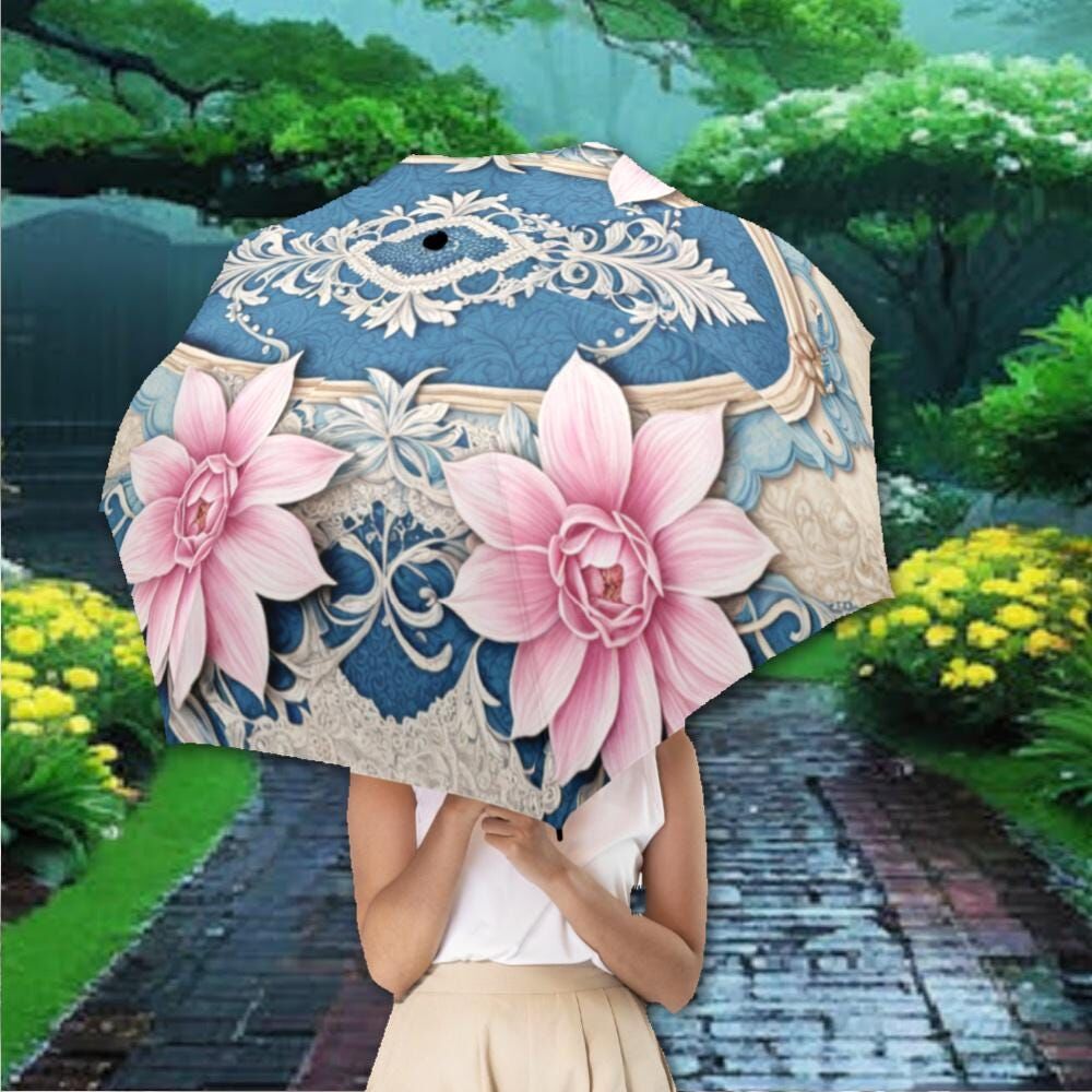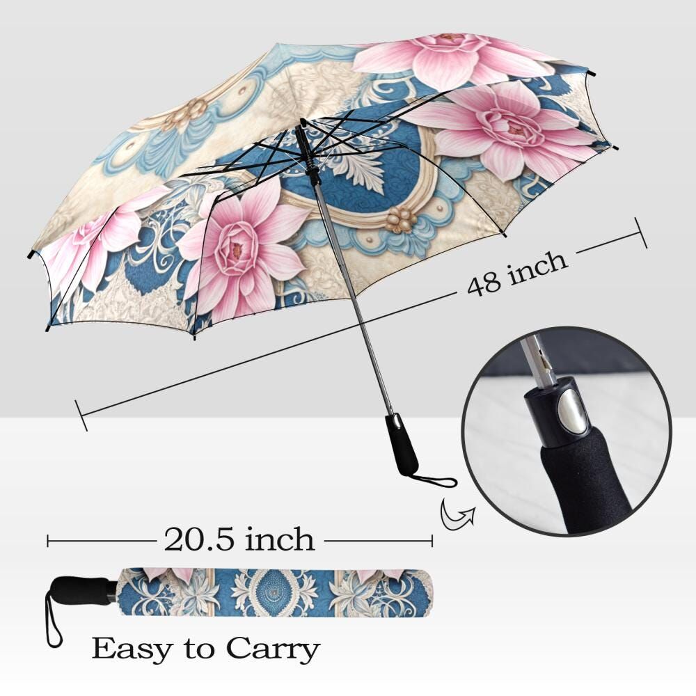 Umbrella Romantic Pink Flower Floral Art Nouveau Style Printed Faux Floral Lace Parasol Semi-Automatic Waterproof Foldable Umbrella