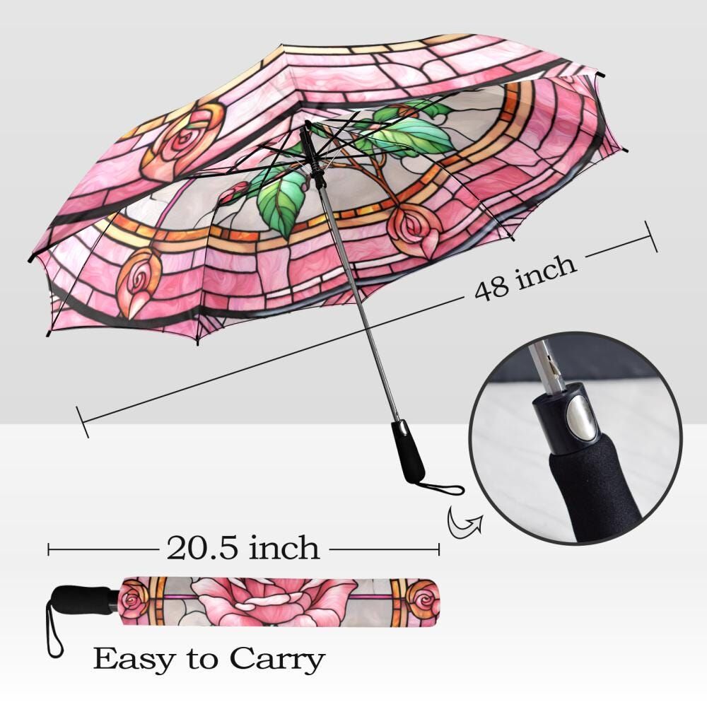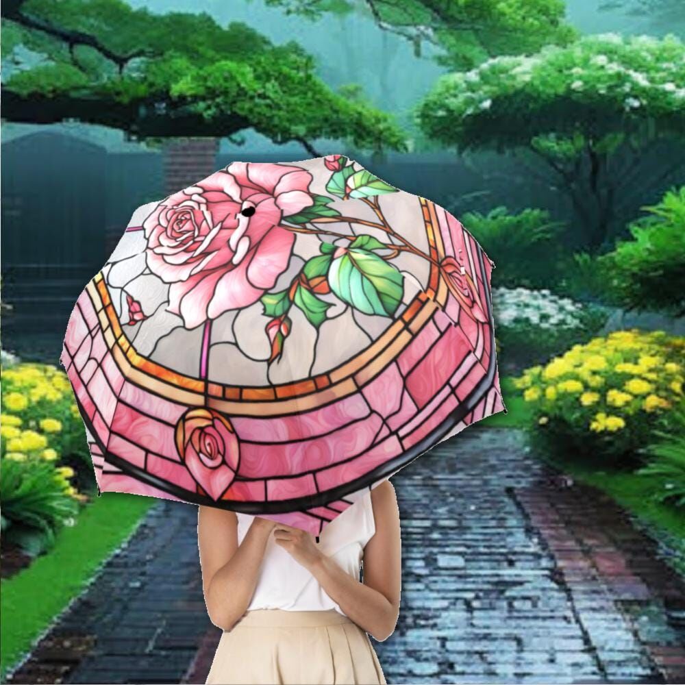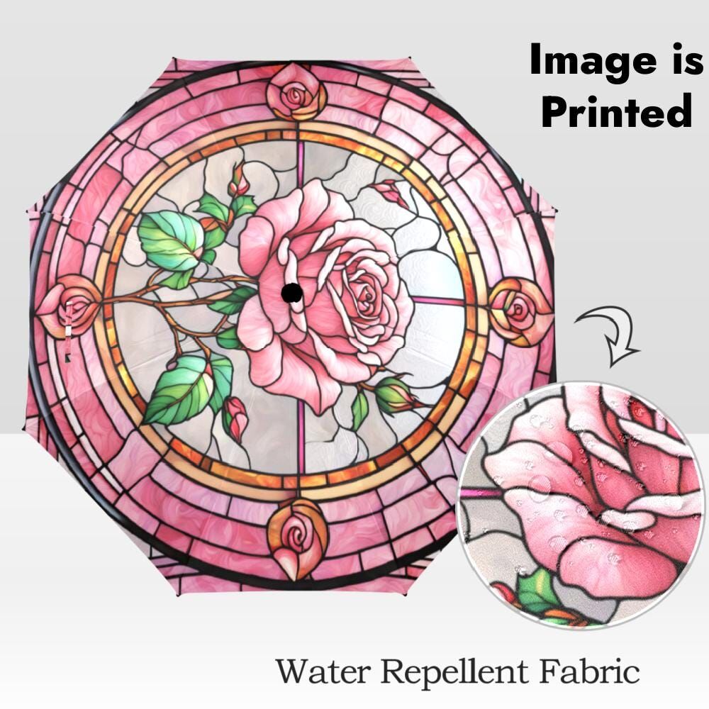 Rose Stained Glass Umbrella Pink Rose Romantic Flowers Parasol Semi-Automatic Floral Sun Rain Waterproof Foldable Umbrella
