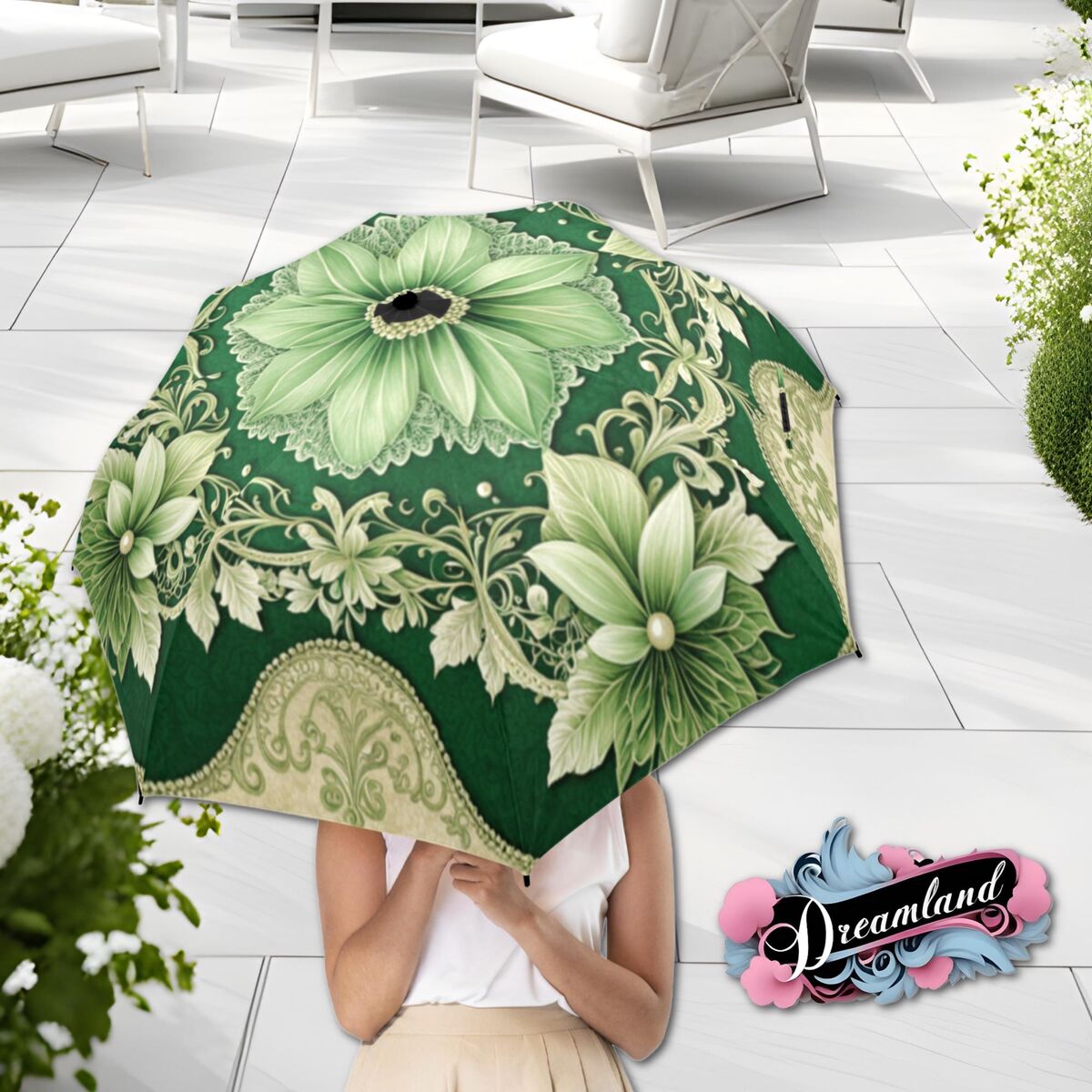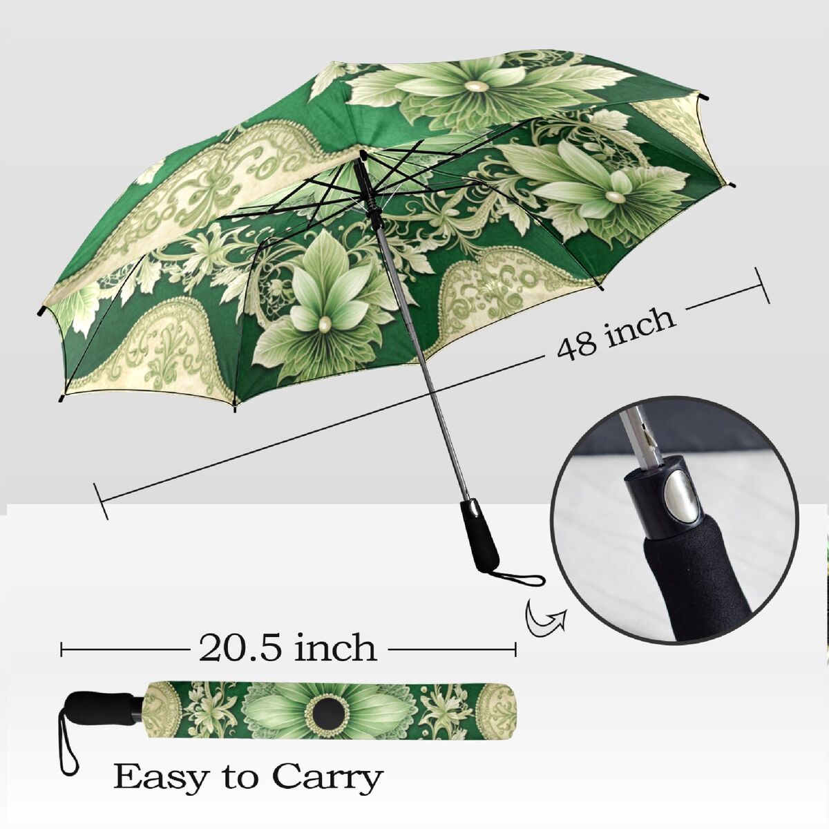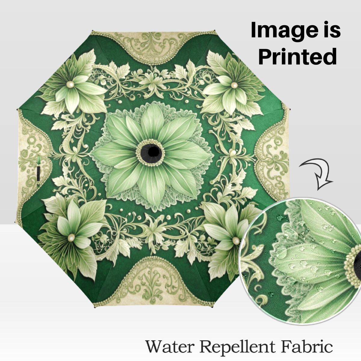 Sage Green Cream Umbrella Art Nouveau Printed Pearls Parasol Semi-Automatic Waterproof Foldable Umbrella