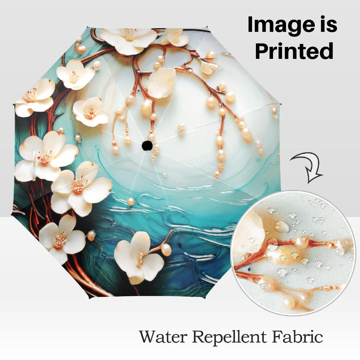 Blue White Unique Umbrella Flower Floral Art Nouveau Style Printed Faux Floral Beads Parasol Semi-Automatic Waterproof Foldable Umbrella