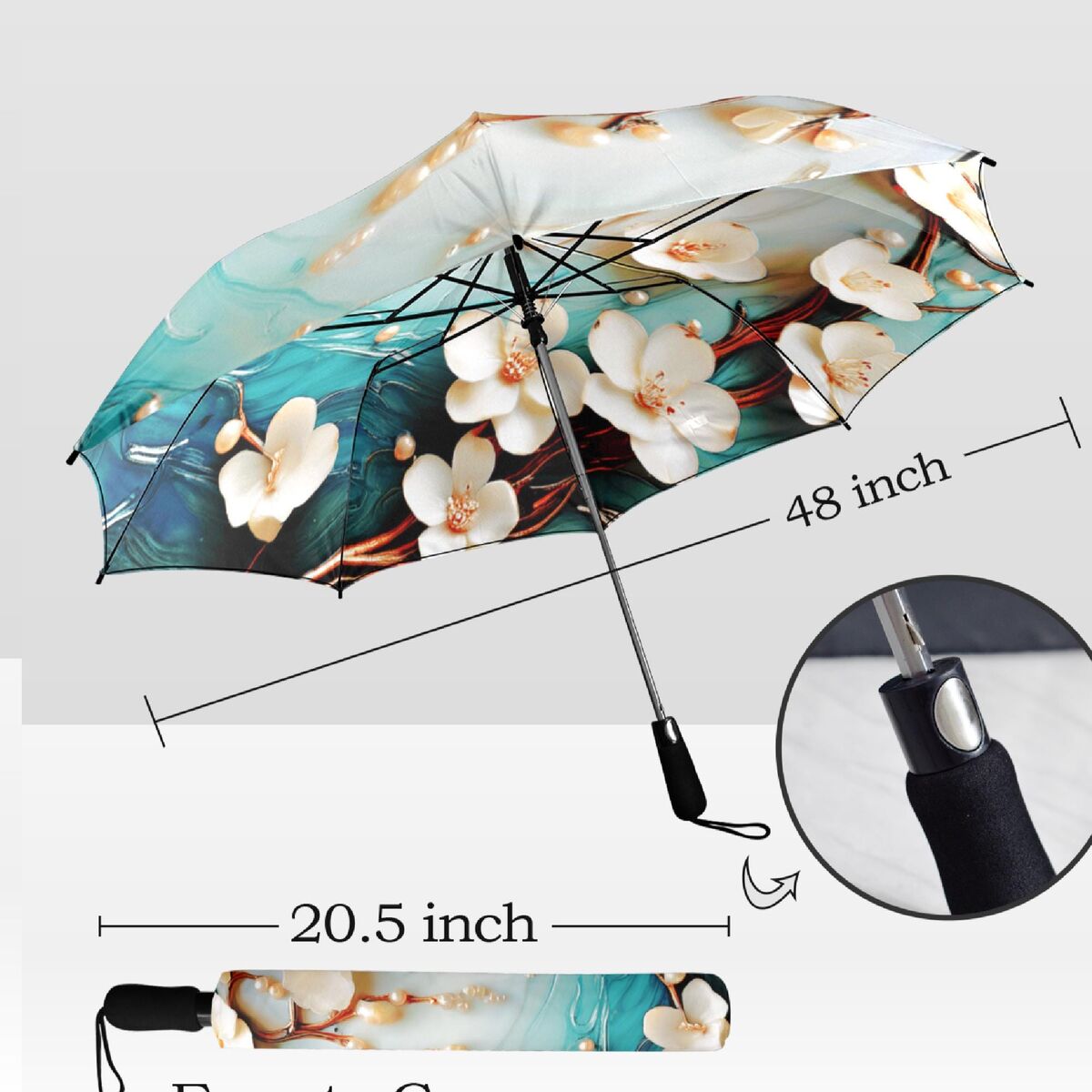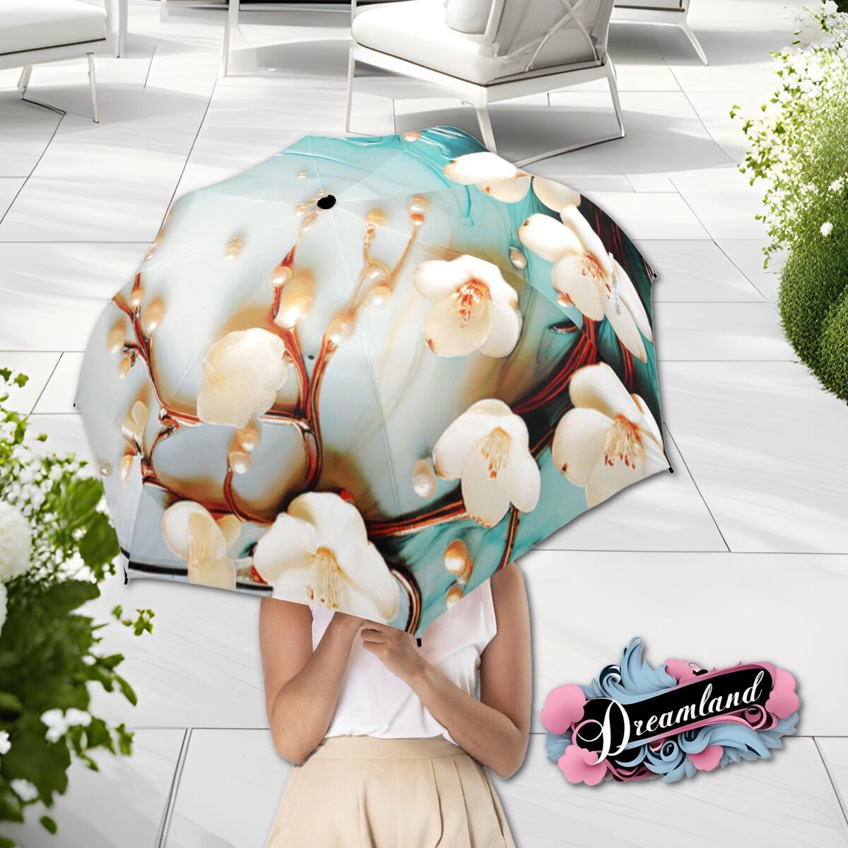 Pink White Flower Unique Umbrella Flower Art Nouveau Style Printed Faux Floral Beads Parasol Semi-Automatic Waterproof Foldable Umbrella