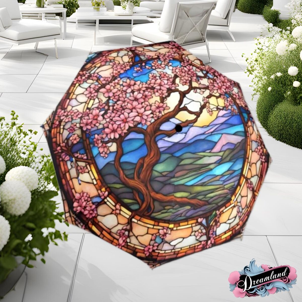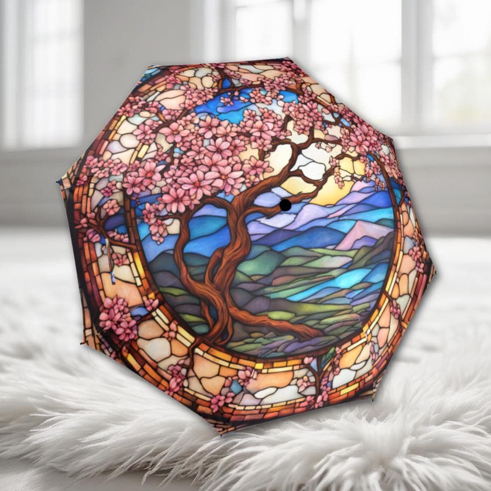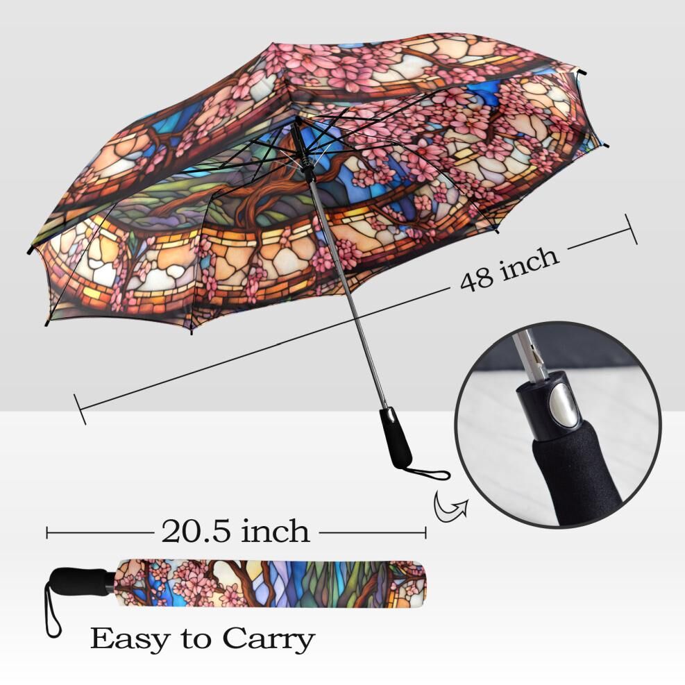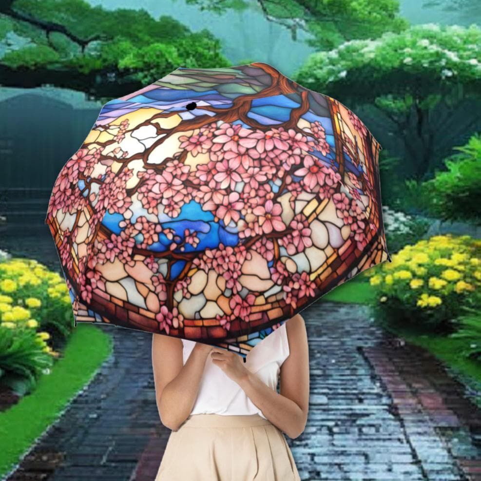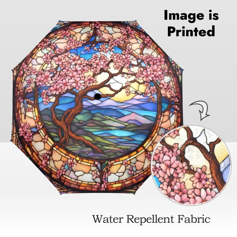 Sakura Romantic Umbrella Cherry Tree Blossoms Faux Stained Glass Flower Parasol Semi-Automatic Waterproof Foldable Umbrella