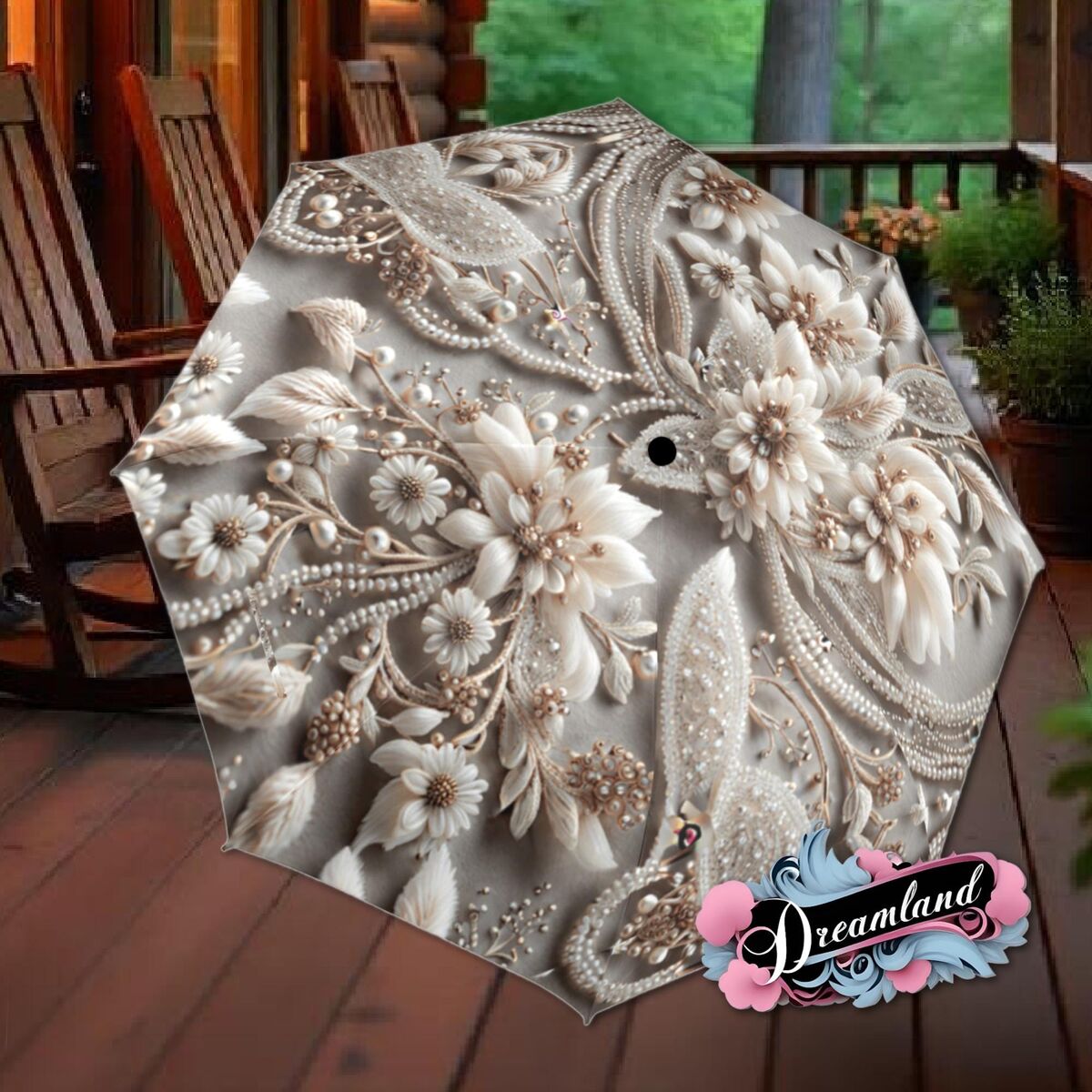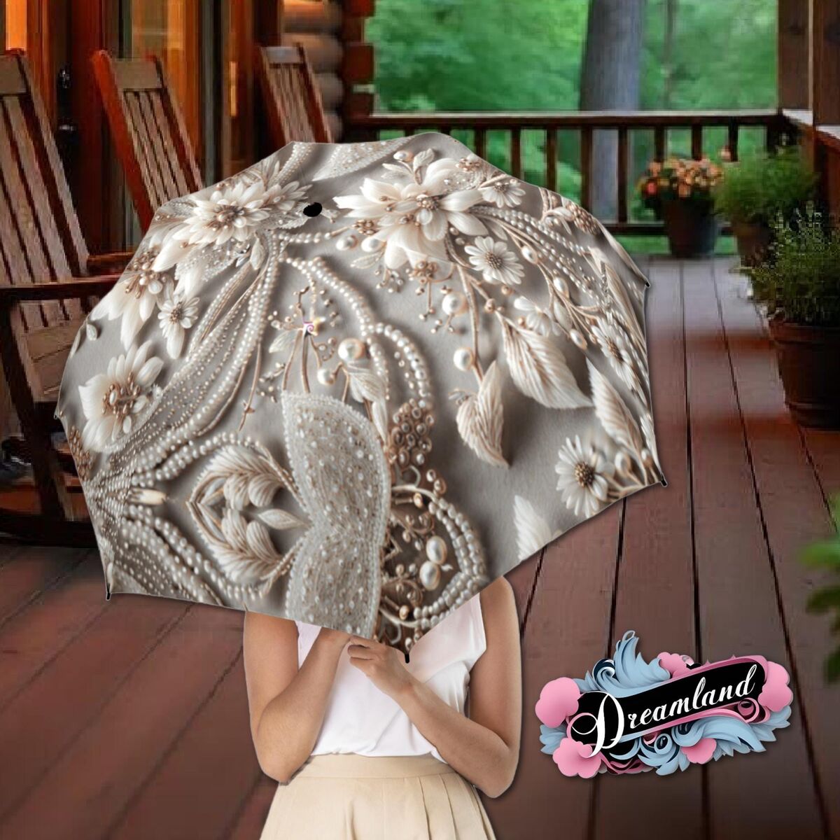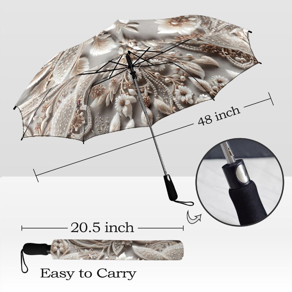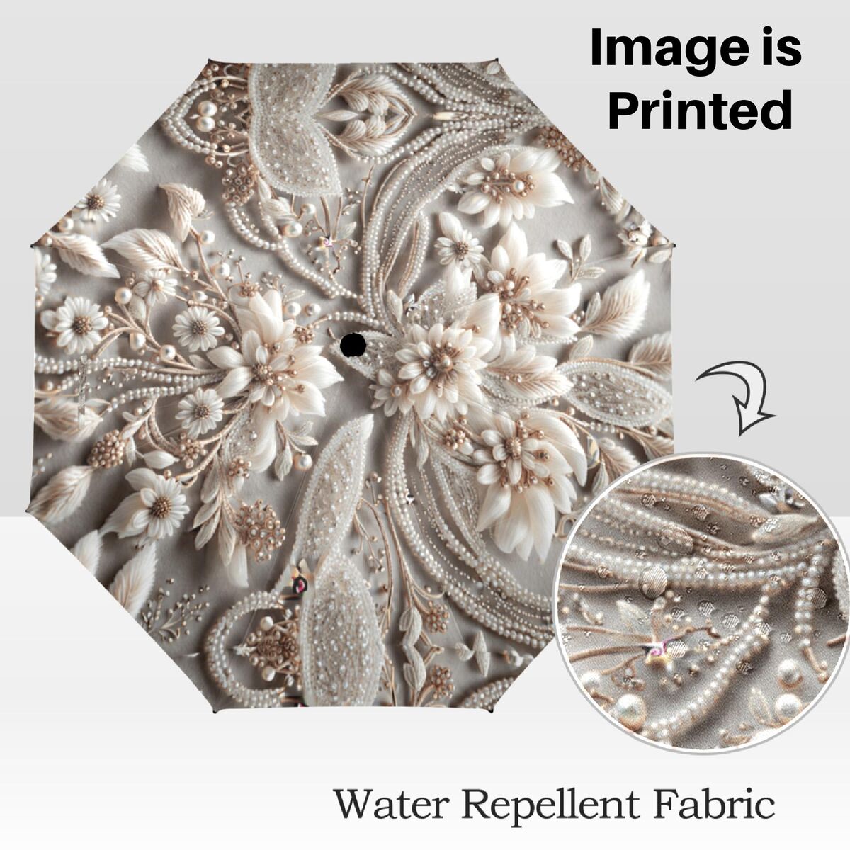 Silver Gray Umbrella Flower Art Nouveau Unique Style Printed Faux Flower Beads Parasol Semi-Automatic Waterproof Foldable Umbrella