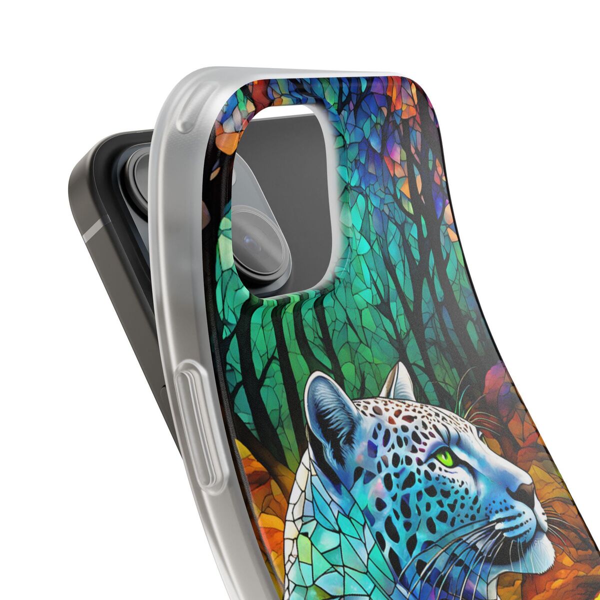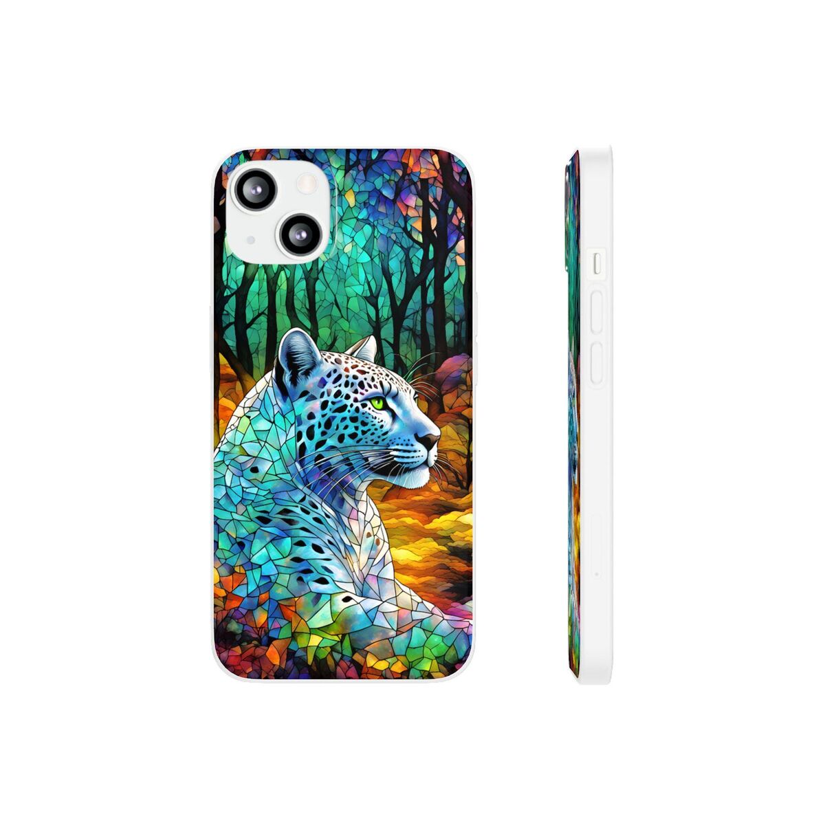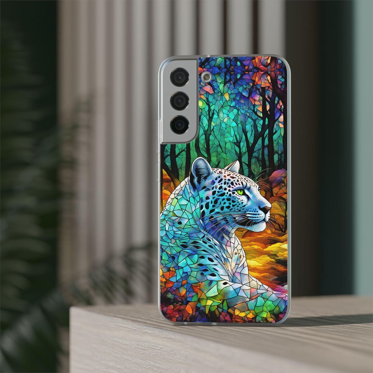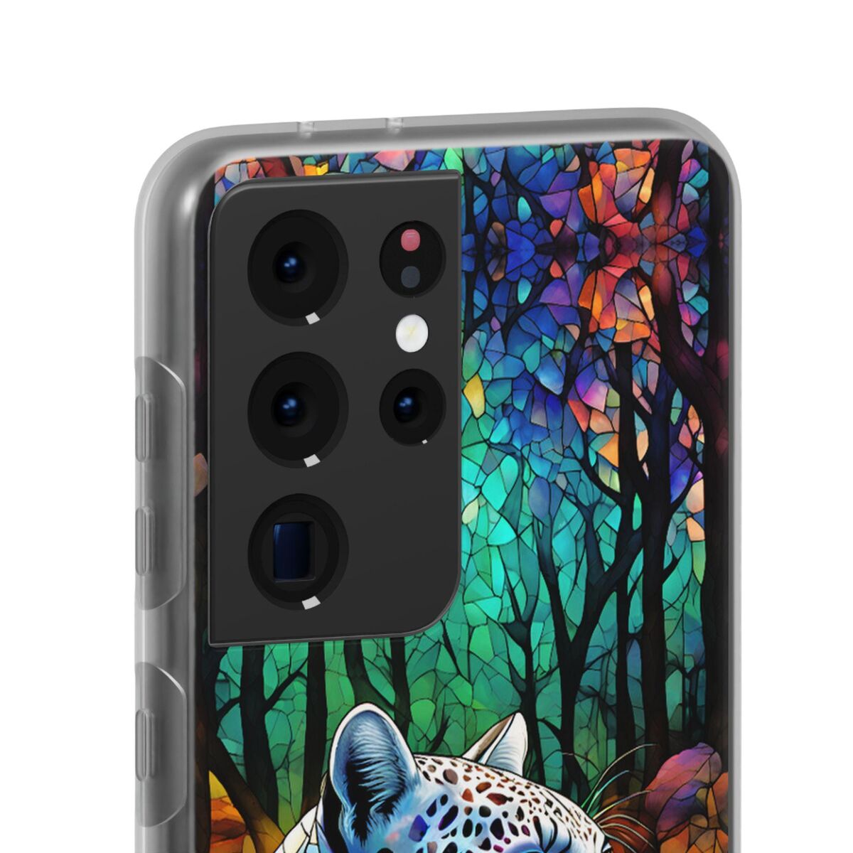 Snow Leopard Phone Case Blue Purple Faux Stained Glass Forest iPhone 15 14 13 12 11 Galaxy S23 S22 S21 And More