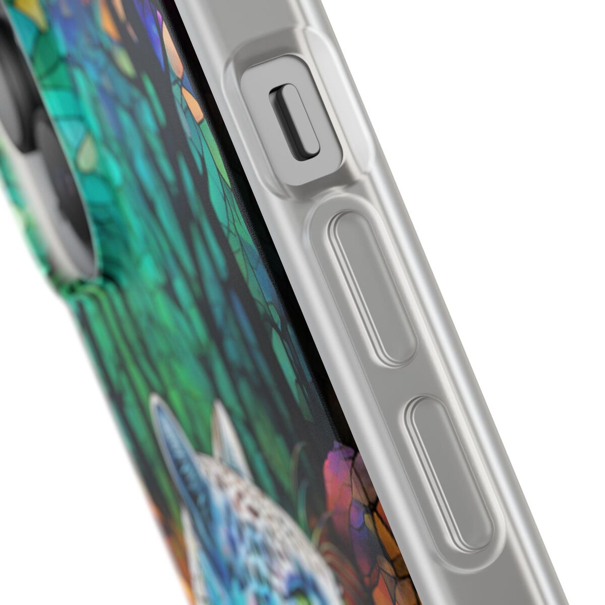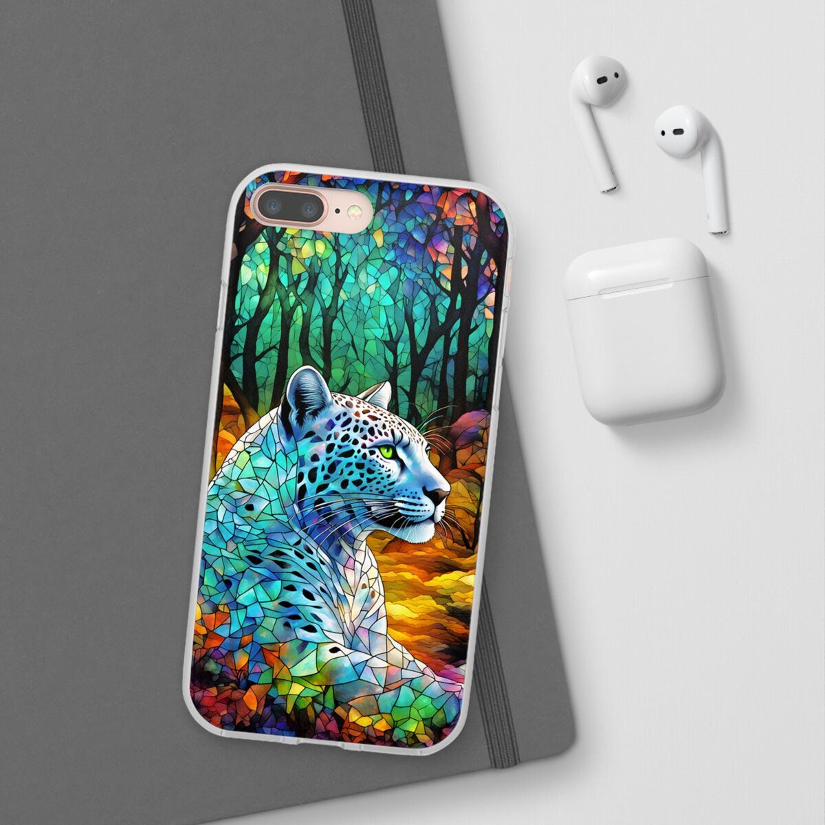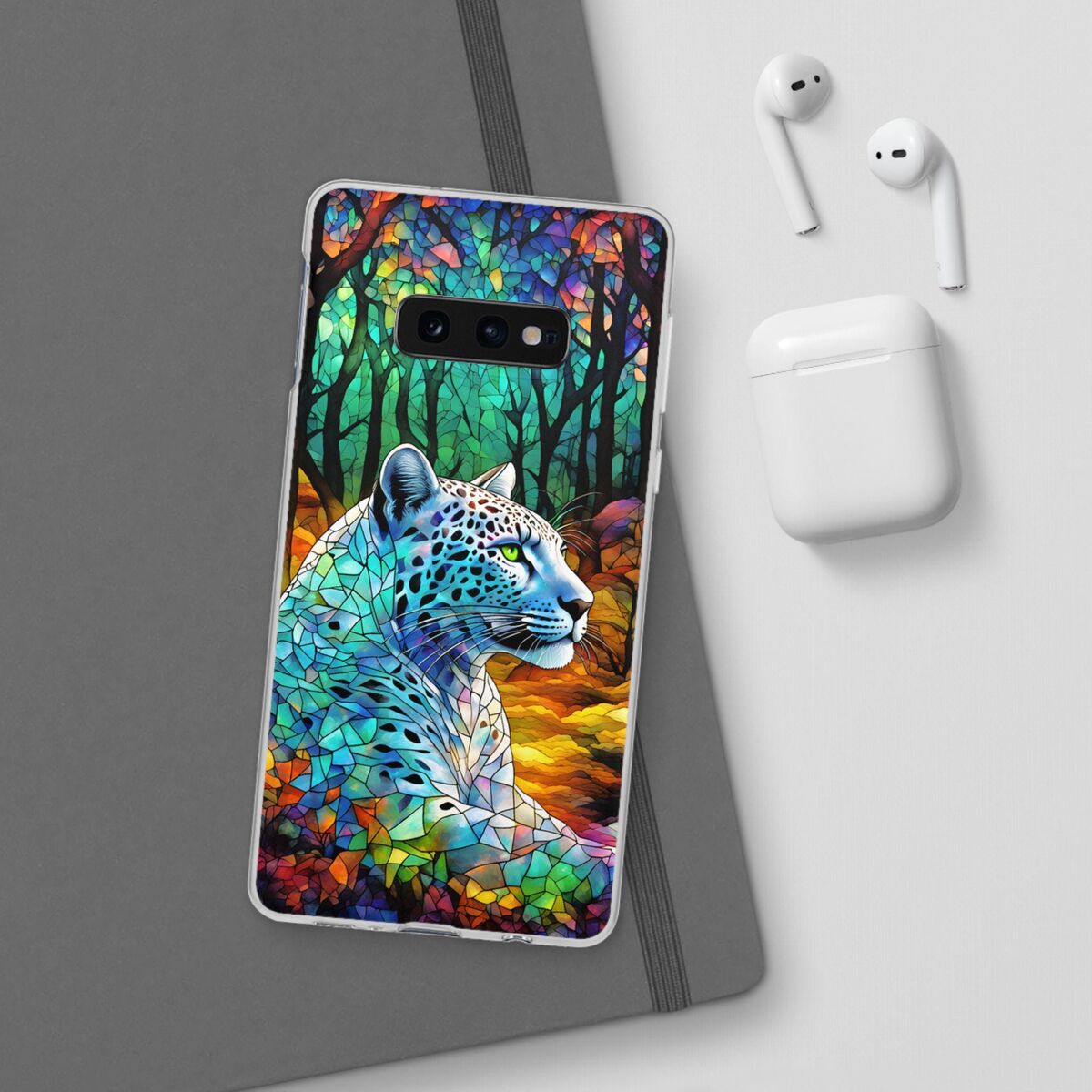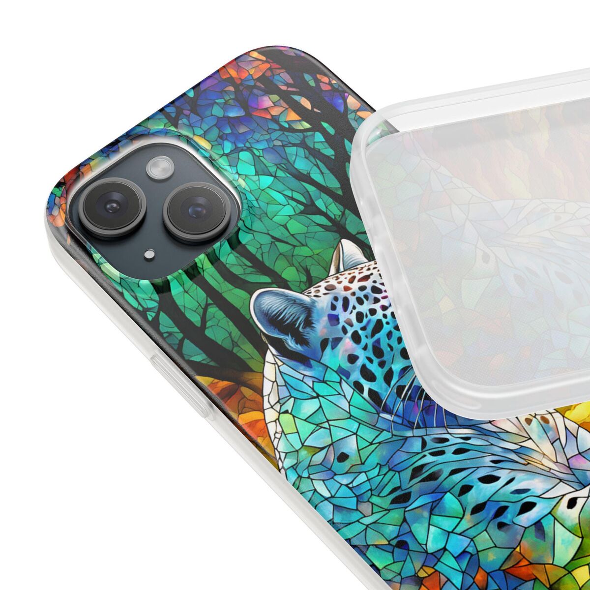 Snow Leopard Phone Case Blue Purple Faux Stained Glass Forest iPhone 15 14 13 12 11 Galaxy S23 S22 S21 And More