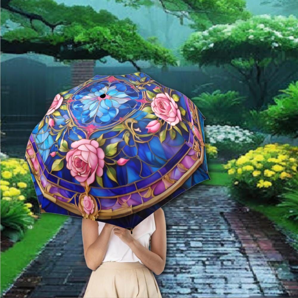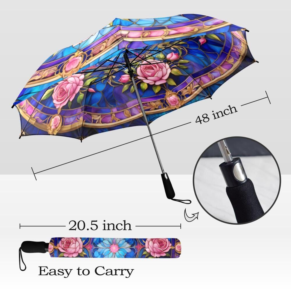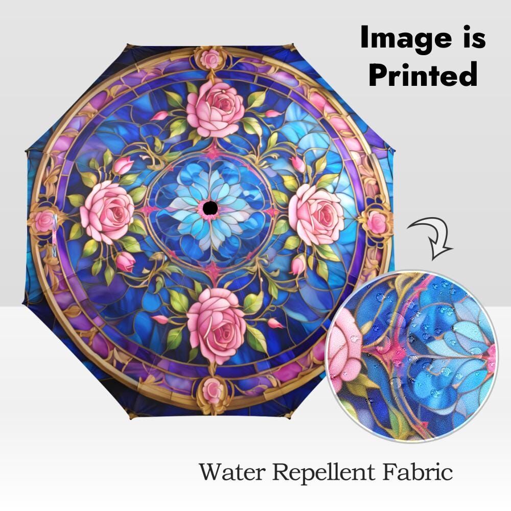 Stained Glass Pink Roses Umbrella Victorian Style Pink Flower Parasol Semi-Automatic Waterproof Foldable Umbrella