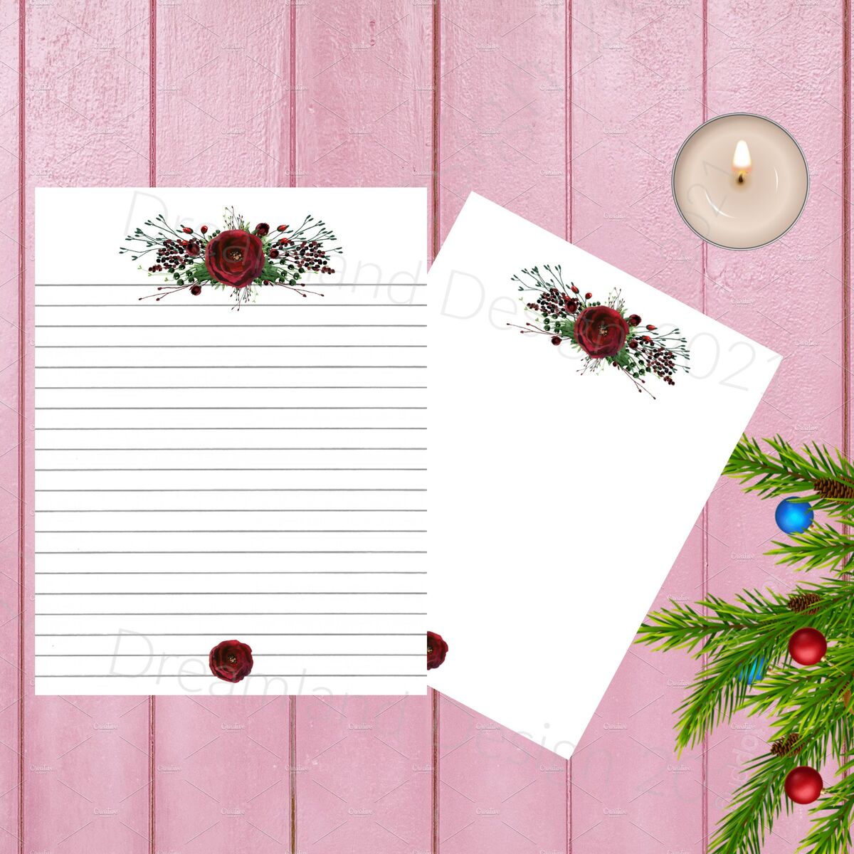 Stationary Christmas Note Book Printable Blank Digital Writing Paper Red White Holiday Floral Lined Note Book Flower Watercolor Roses Paper