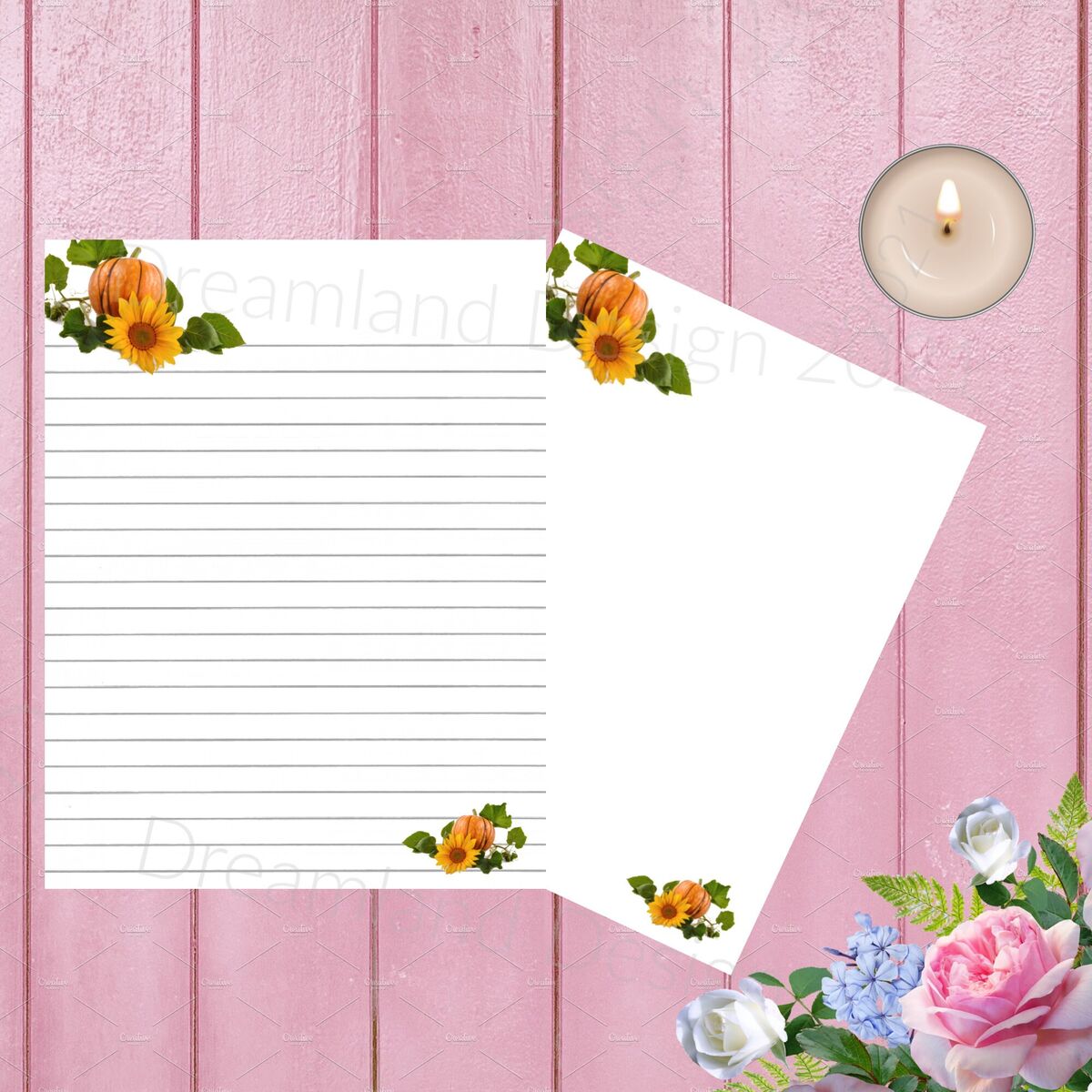 Stationary Printable Pumpkin Fall Thanksgiving Blank Digital Writing Paper Holiday Lined Note Book Watercolor Roses Paper