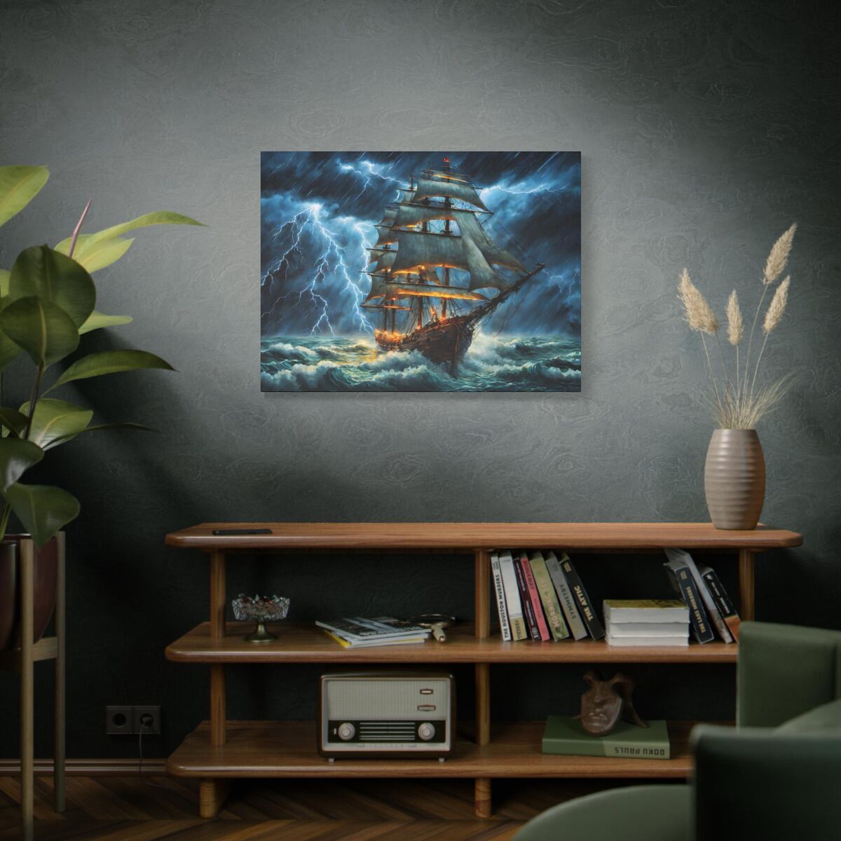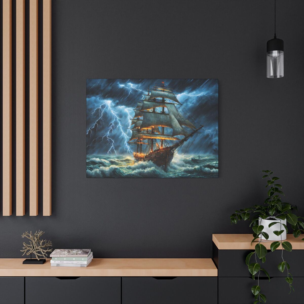 The "Storm At Sea" oil painting canvas print captures the dramatic essence of nautical warfare, showcasing intricately detailed ships amidst tumultuous waves. This large-sized artwork is framed, making it an ideal centerpiece for any room, particularly for those who appreciate the dark academia aesthetic. The moody color palette enhances the sense of adventure and history, inviting viewers to immerse themselves in the maritime narrative.