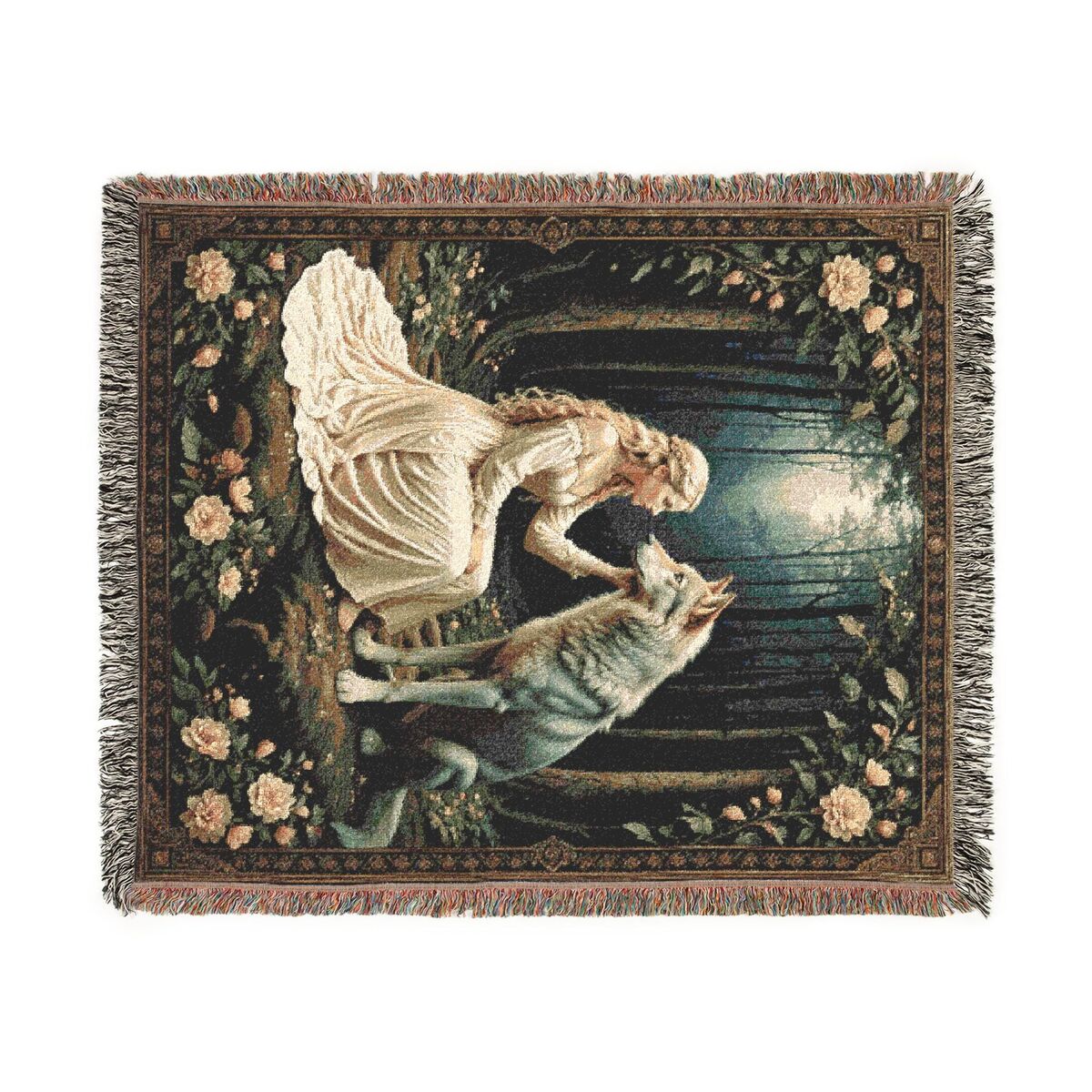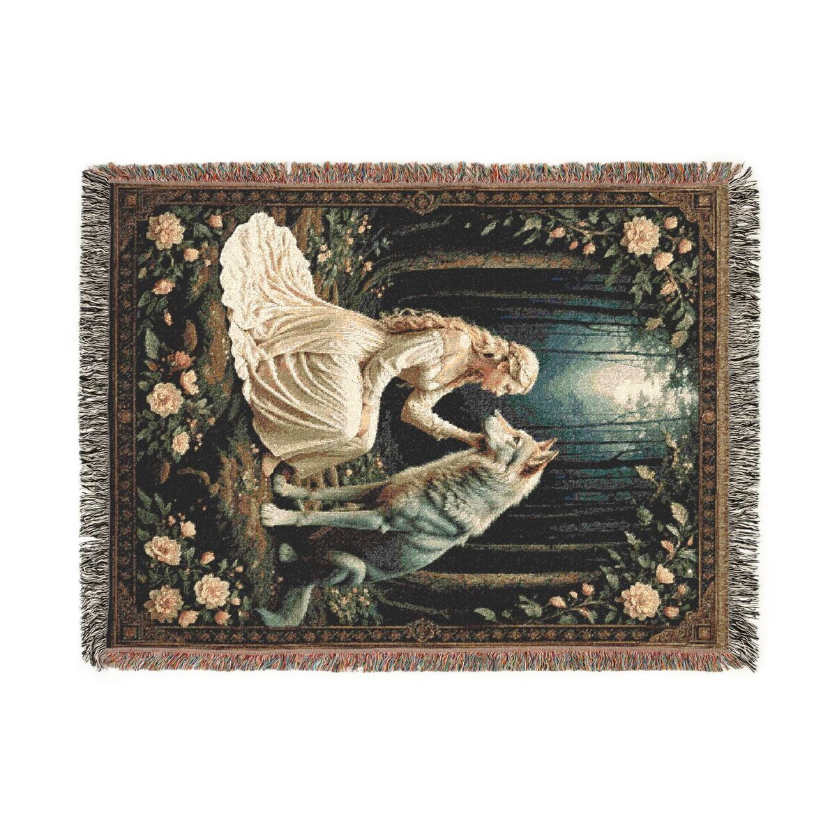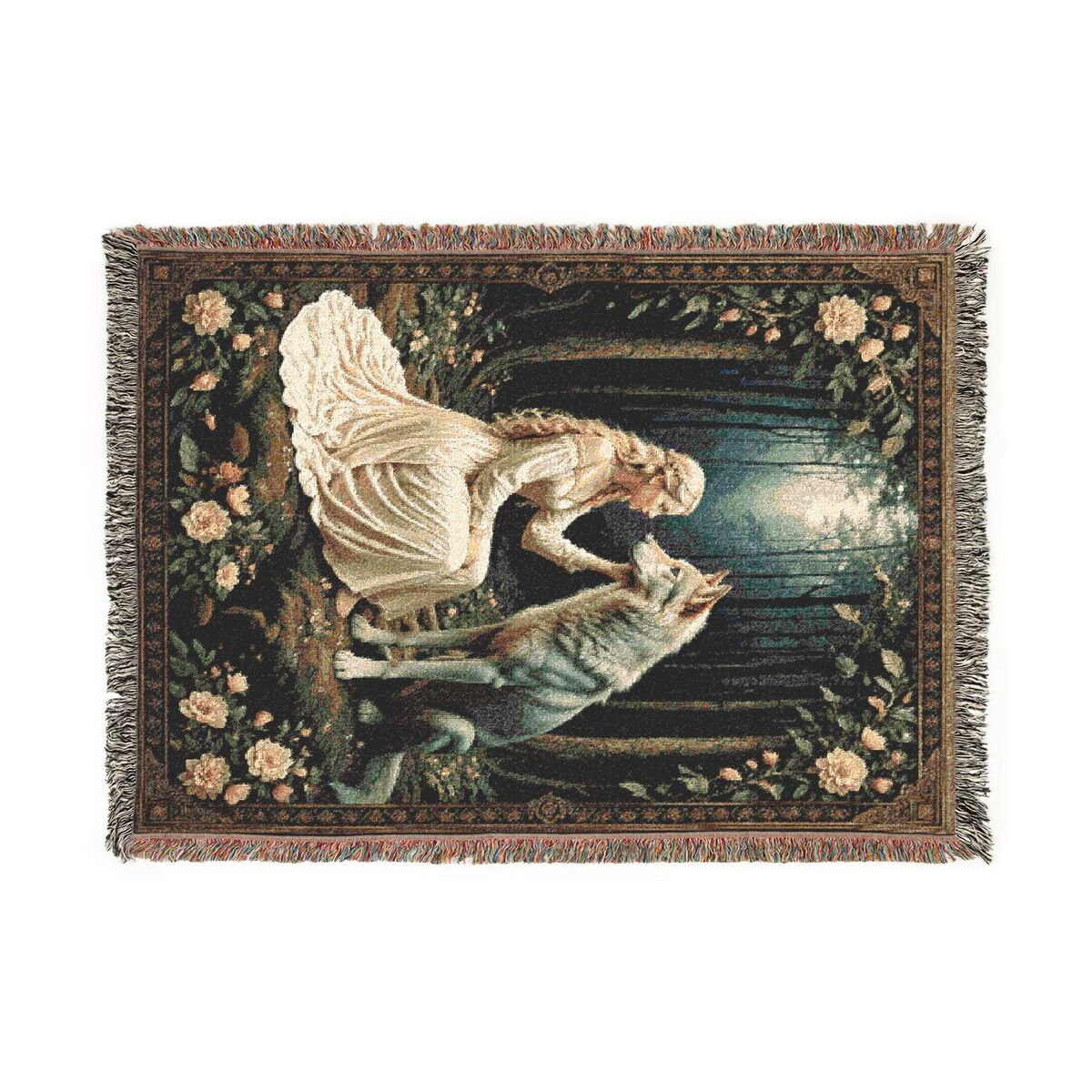 Transform your living space with the enchanting Medieval Woven Blanket featuring a captivating Freya and a wolf This exquisite tapestry wall hanging not only serves as a cozy throw but also as a stunning piece of art that brings a touch of Norse magic and medieval aesthetics to your home. Crafted with intricate details, it showcases a mystical forest scene that is perfect for those who appreciate fantasy and dark decor.