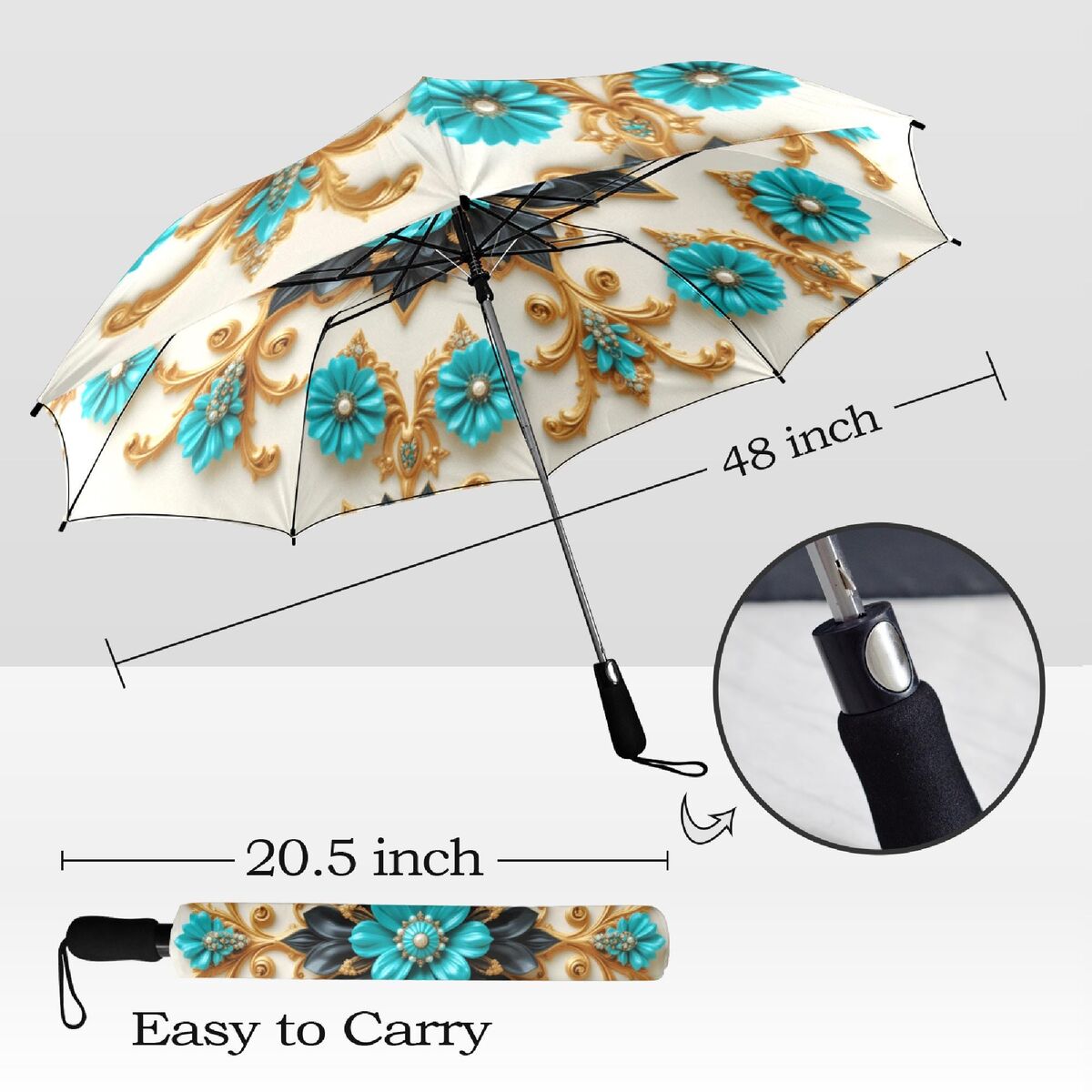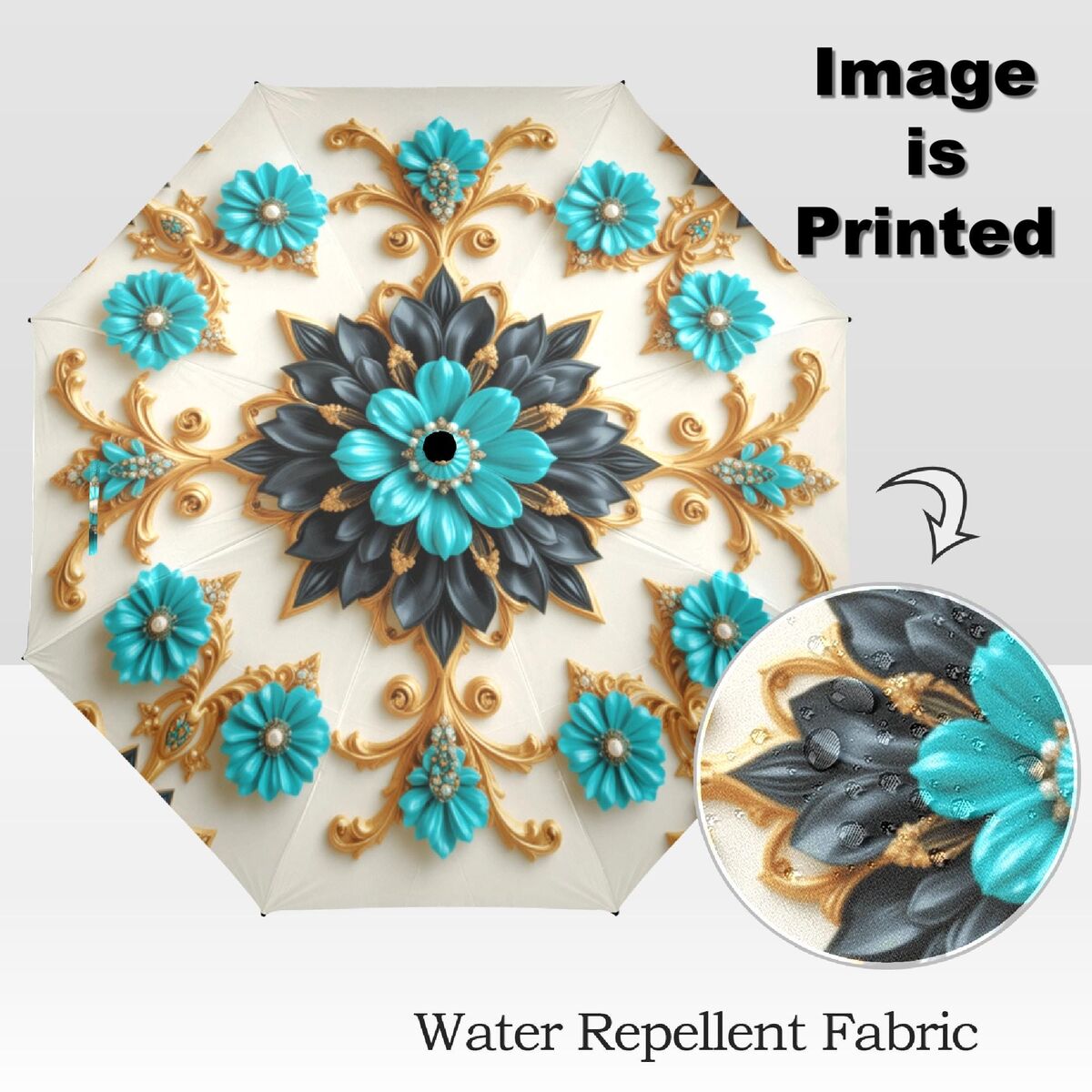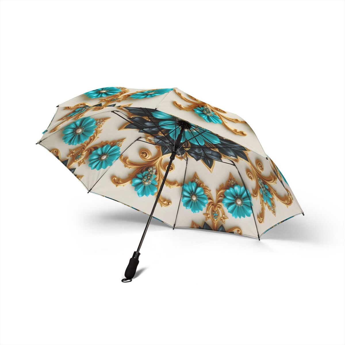 Teal Black Gold Umbrella Art Nouveau Printed Mandella Parasol Semi-Automatic Waterproof Foldable Umbrella