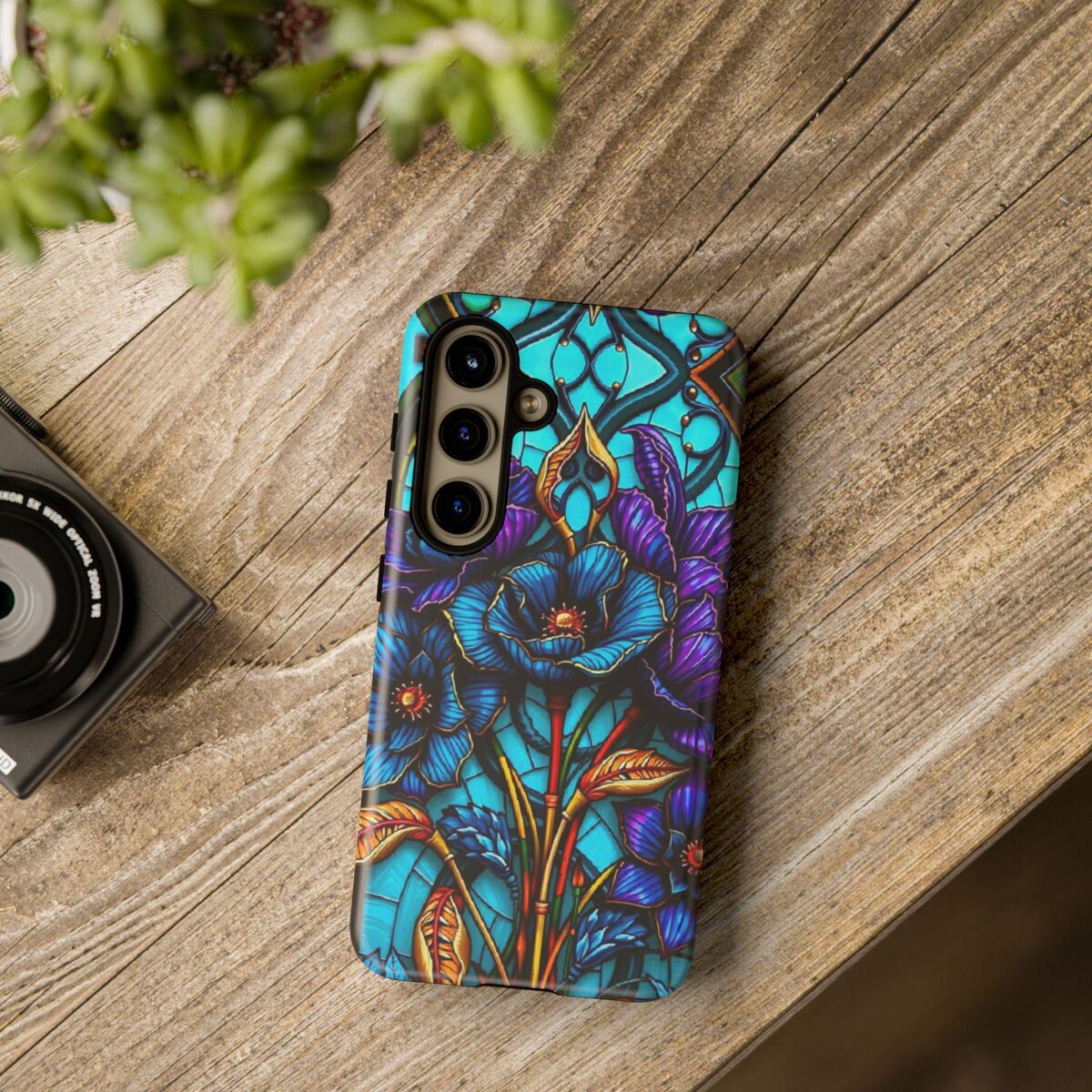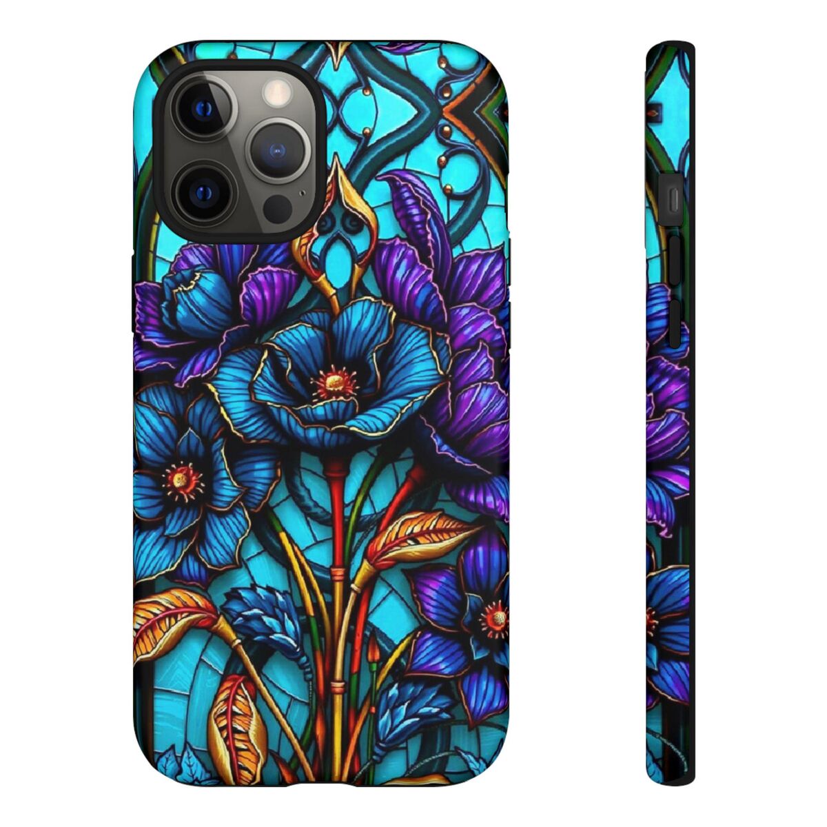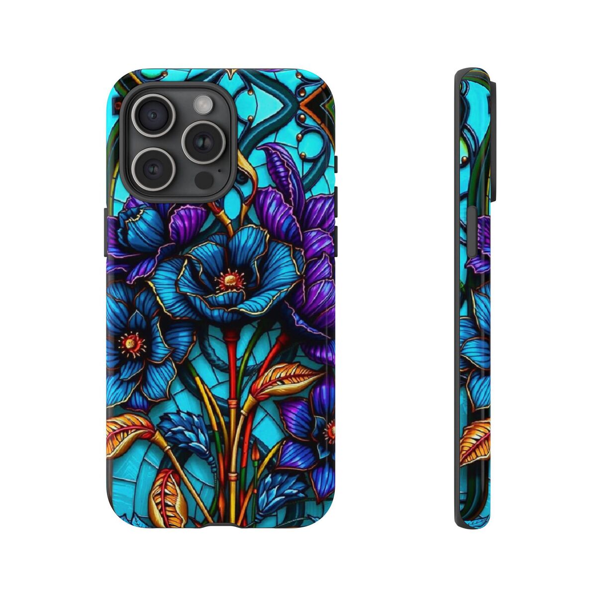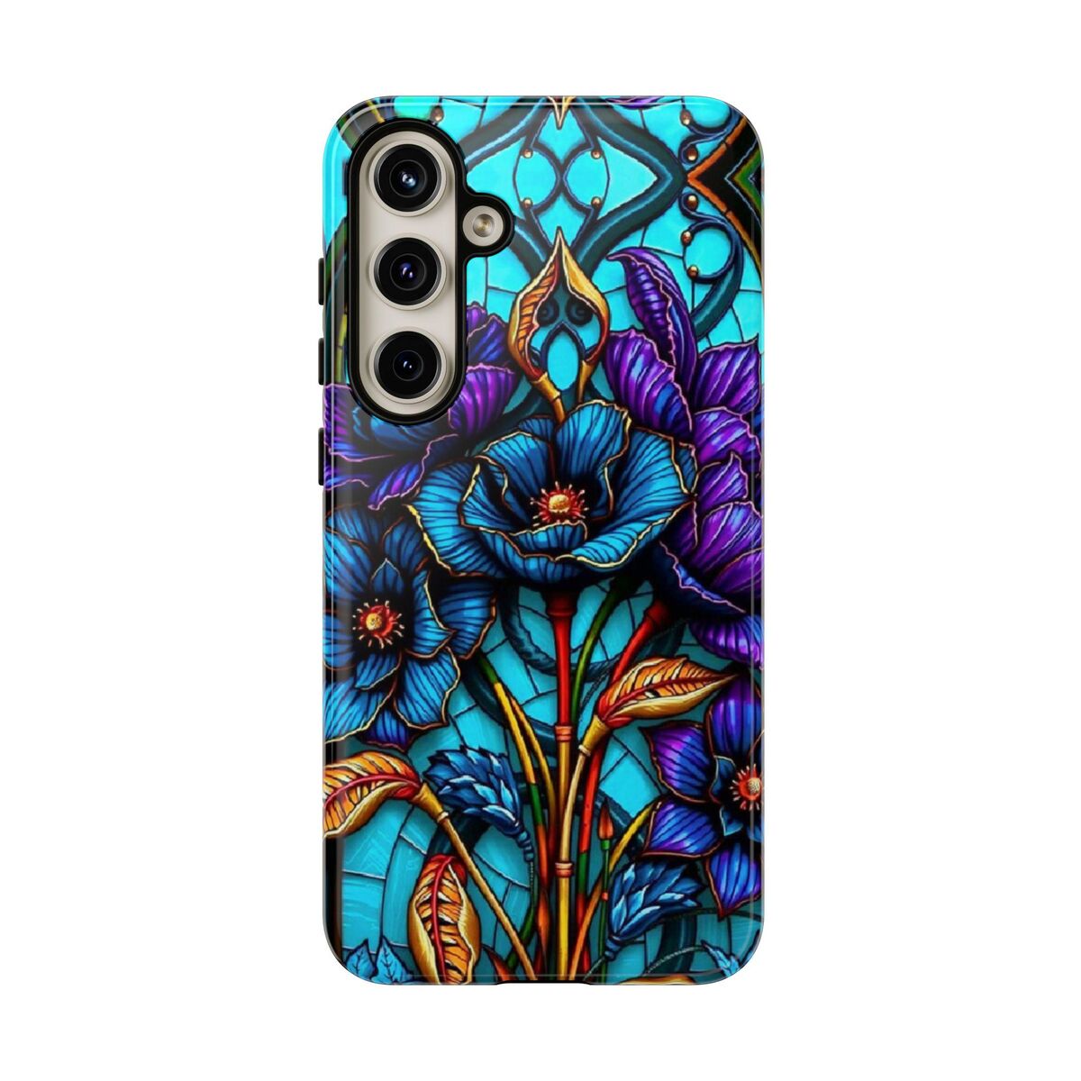 Teal Purple Gothic Flower Tough Phone Case Art Nouveau Faux Stained Glass Phone Case iPhone 16 15 14 13 12 11 Galaxy S24 S23 S22 And More
