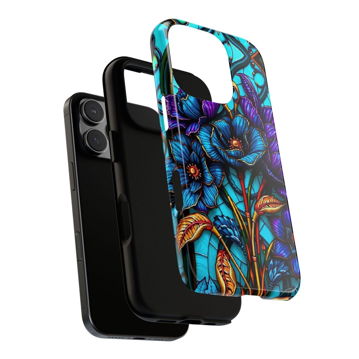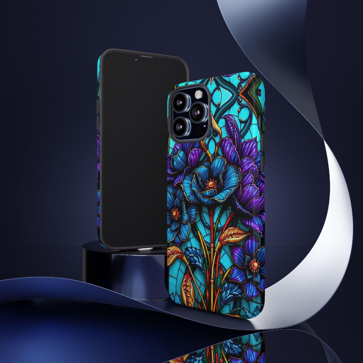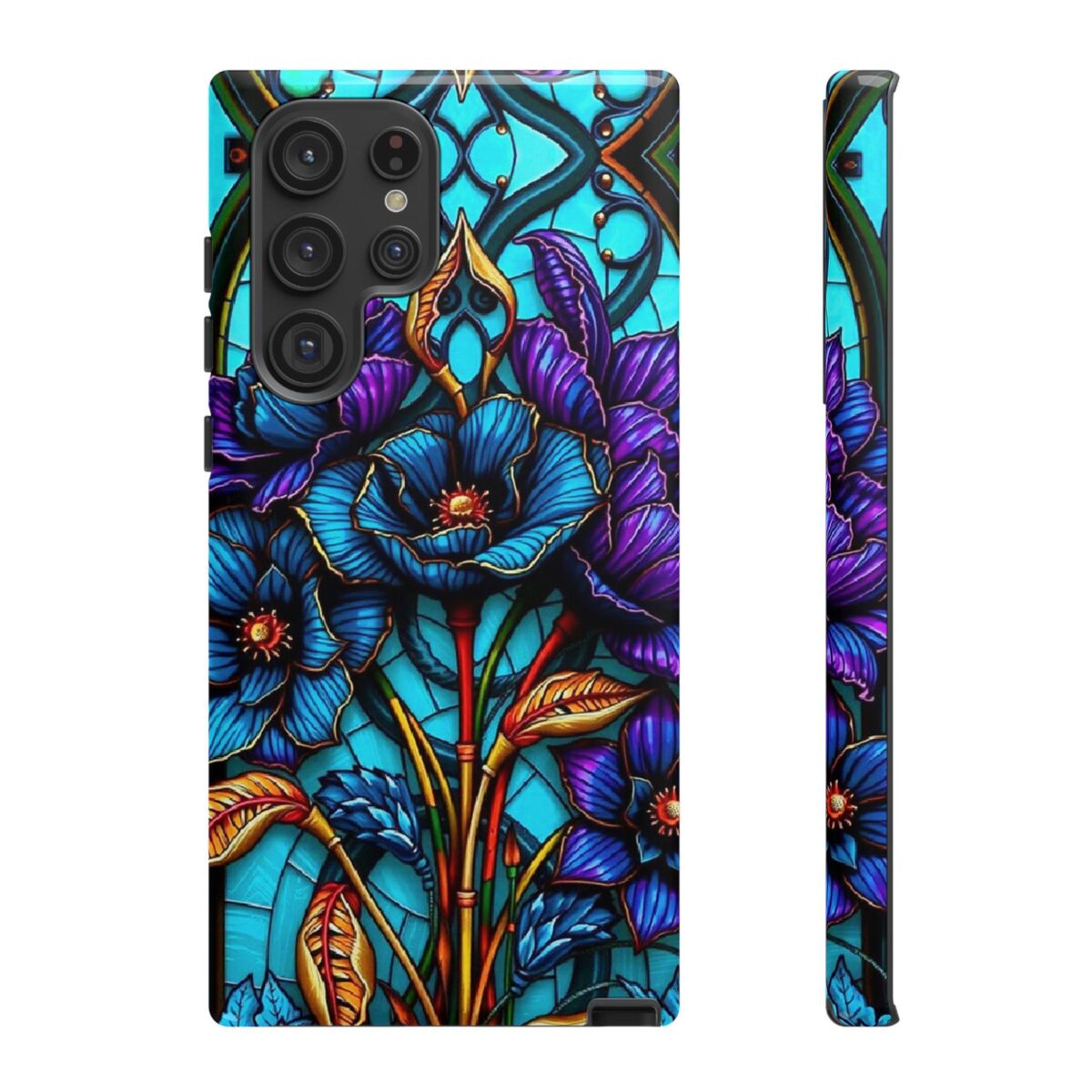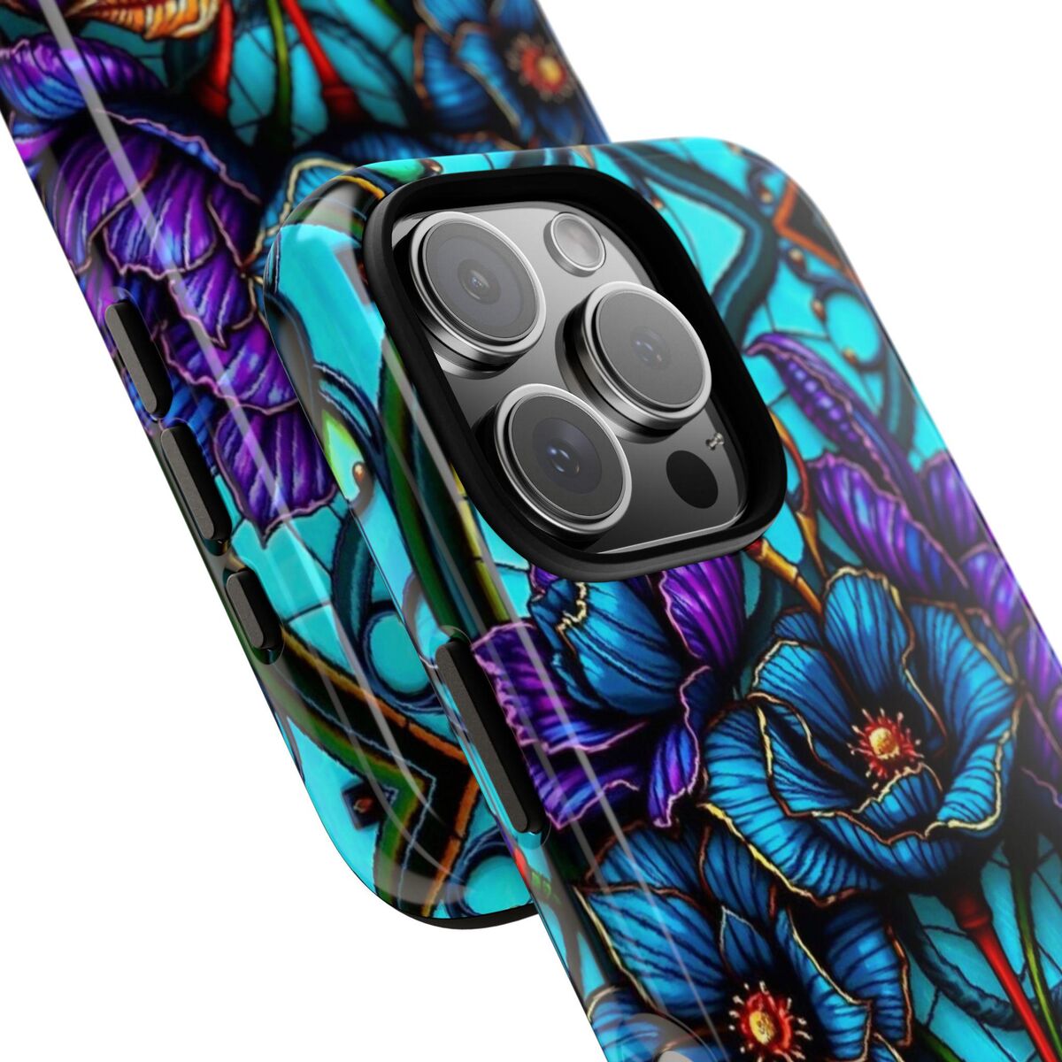 Teal Purple Gothic Flower Tough Phone Case Art Nouveau Faux Stained Glass Phone Case iPhone 16 15 14 13 12 11 Galaxy S24 S23 S22 And More