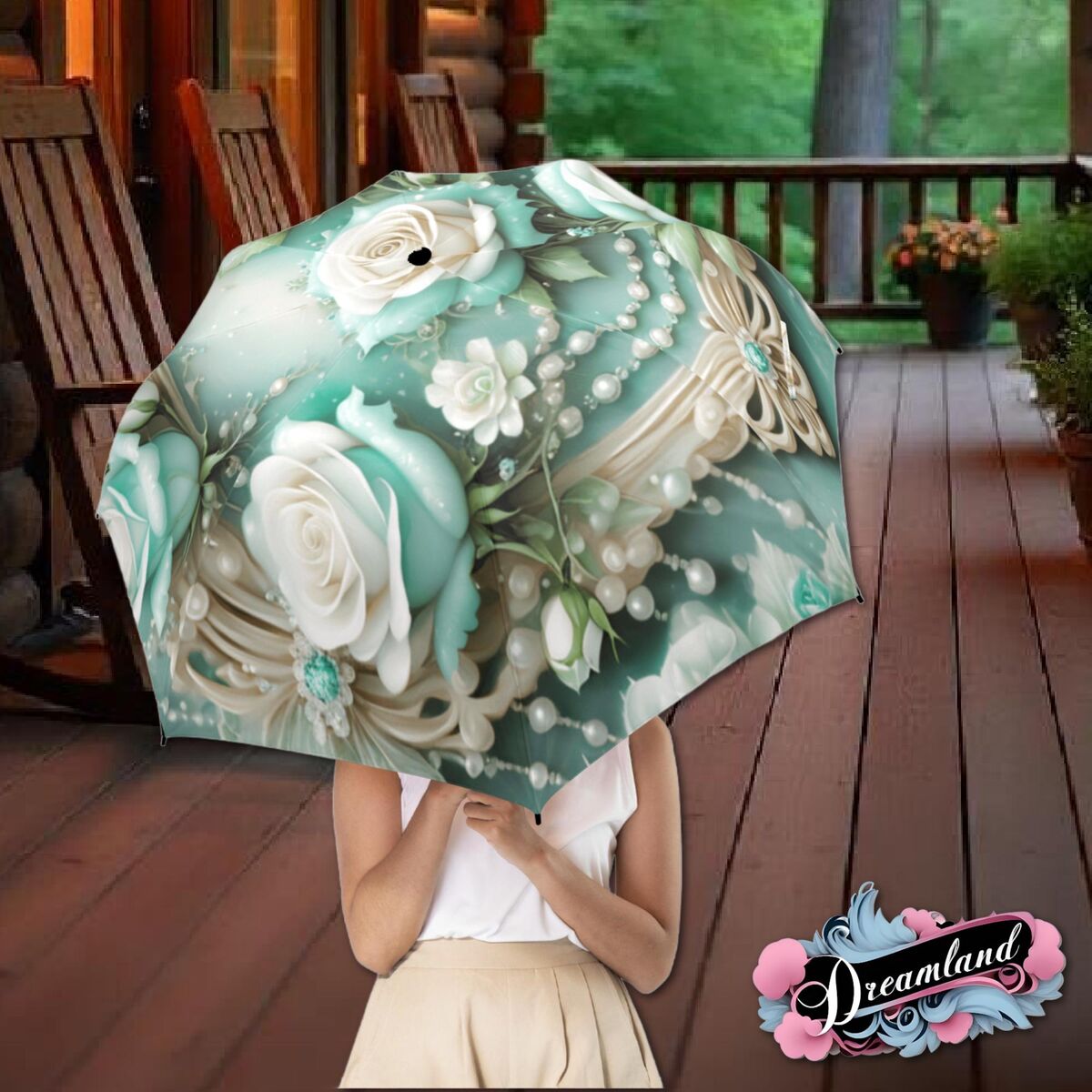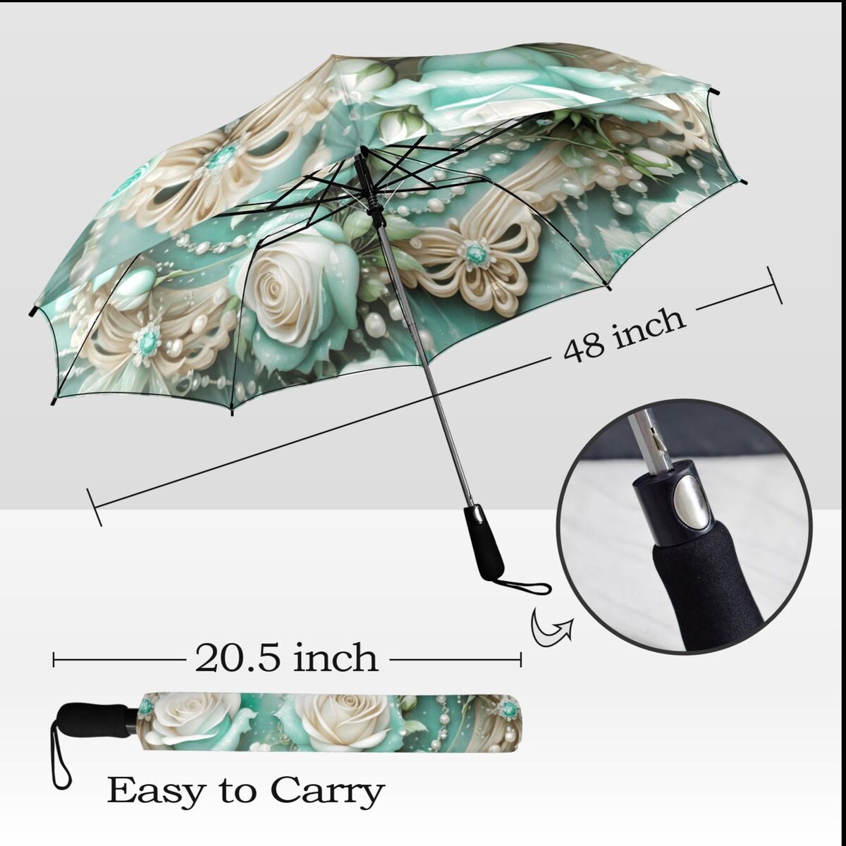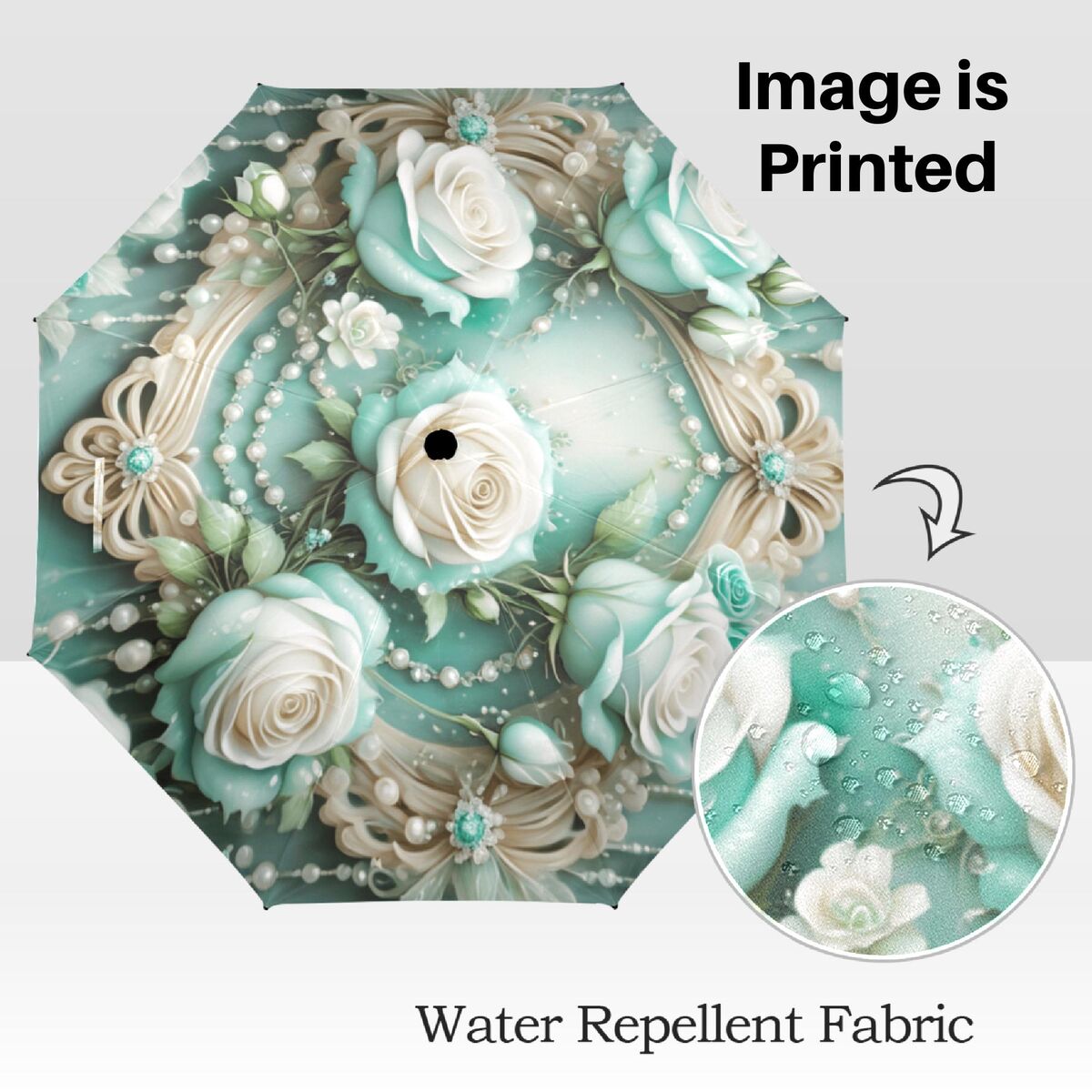 Teal Roses Umbrella Art Nouveau Printed Pearls Parasol Semi-Automatic Waterproof Foldable Umbrella