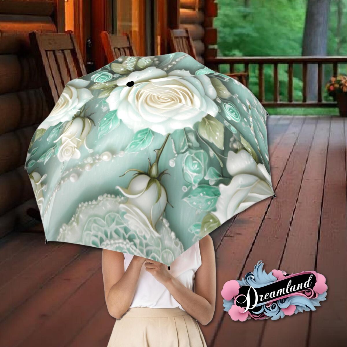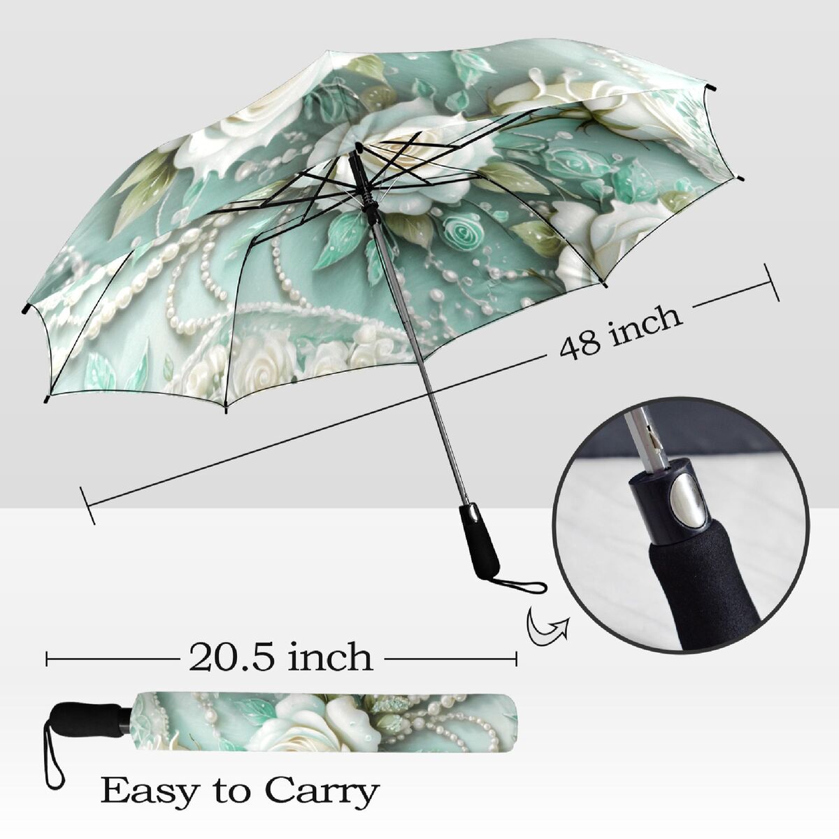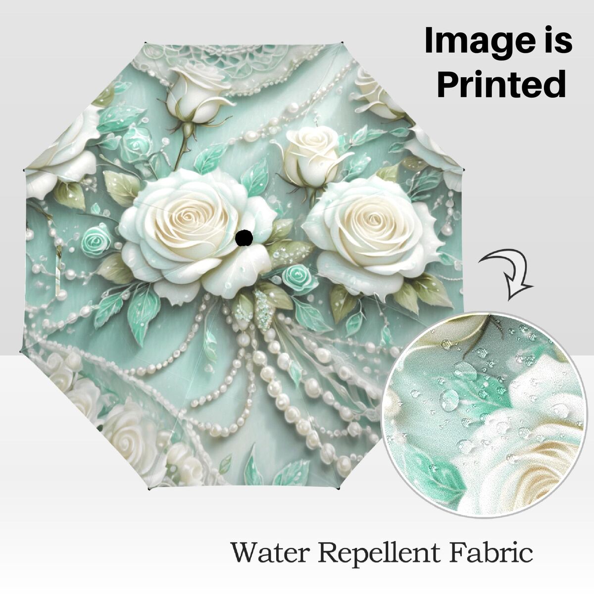 Teal Roses Umbrella Romantic Flower Floral Art Nouveau Style Printed Faux Floral Lace Parasol Semi-Automatic Waterproof Foldable Umbrella