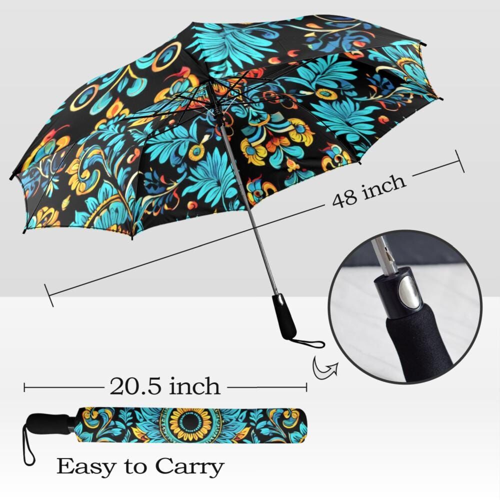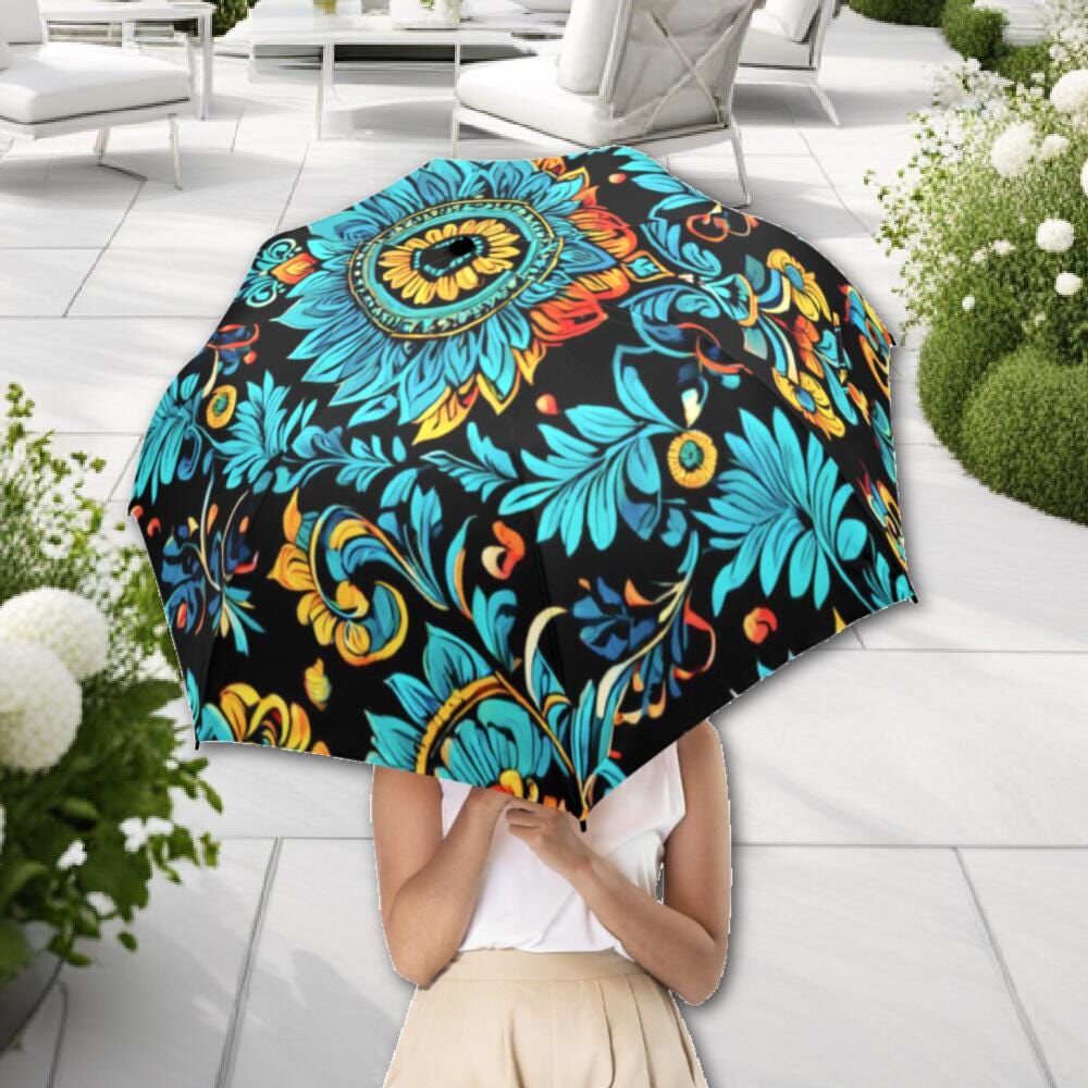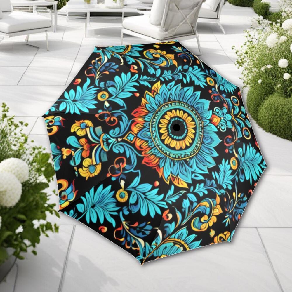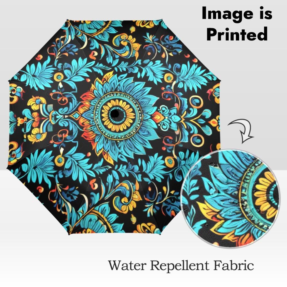 Teal Umbrella Boho Indian Inspired Pattern Parasol Semi-Automatic Floral Sun Rain Waterproof Foldable Umbrella