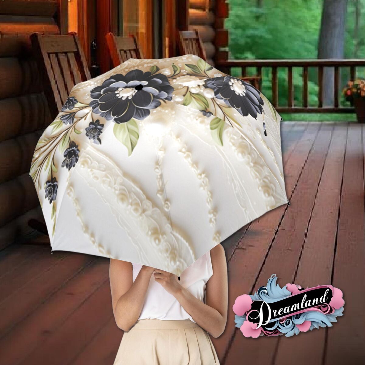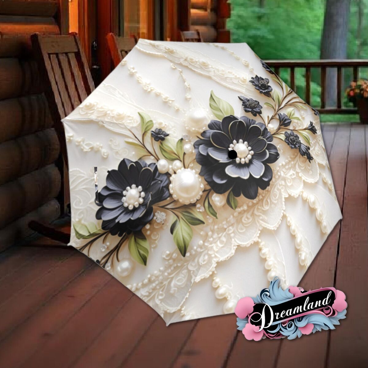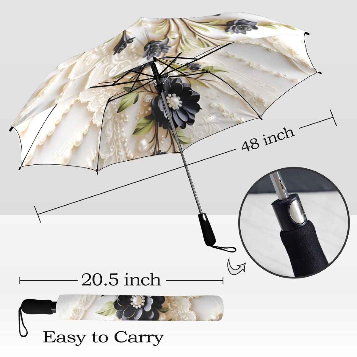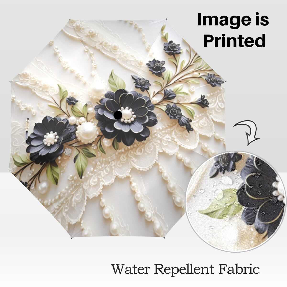 Umbrella Floral Art Nouveau Style Printed Black Cream Faux Lace Flower Parasol Semi-Automatic Waterproof Foldable Umbrella
