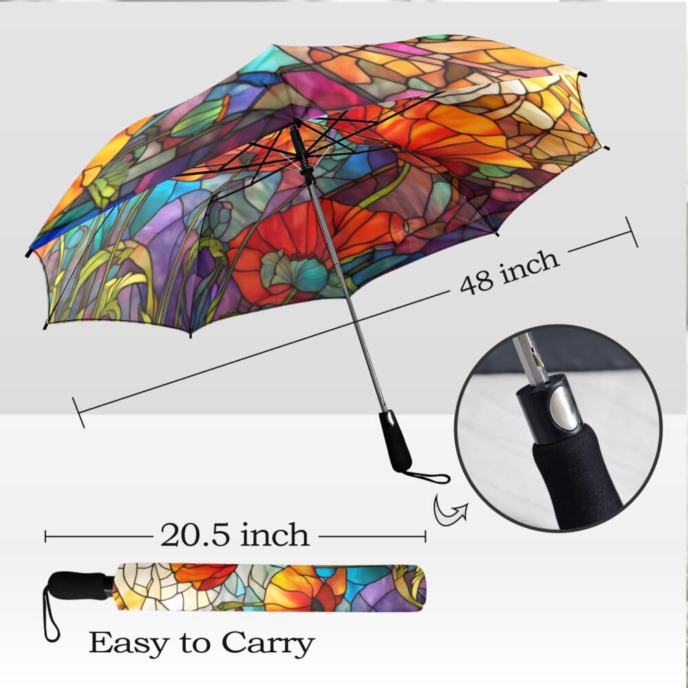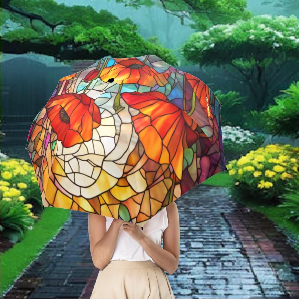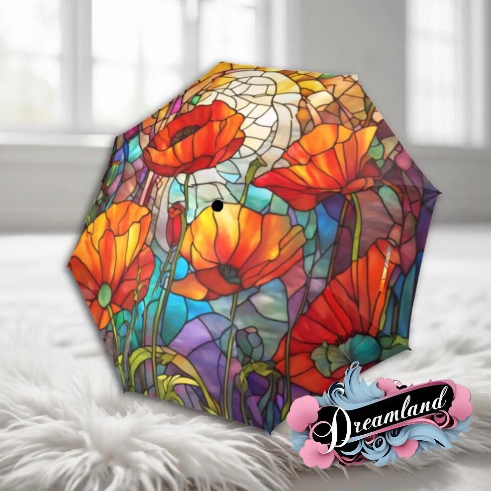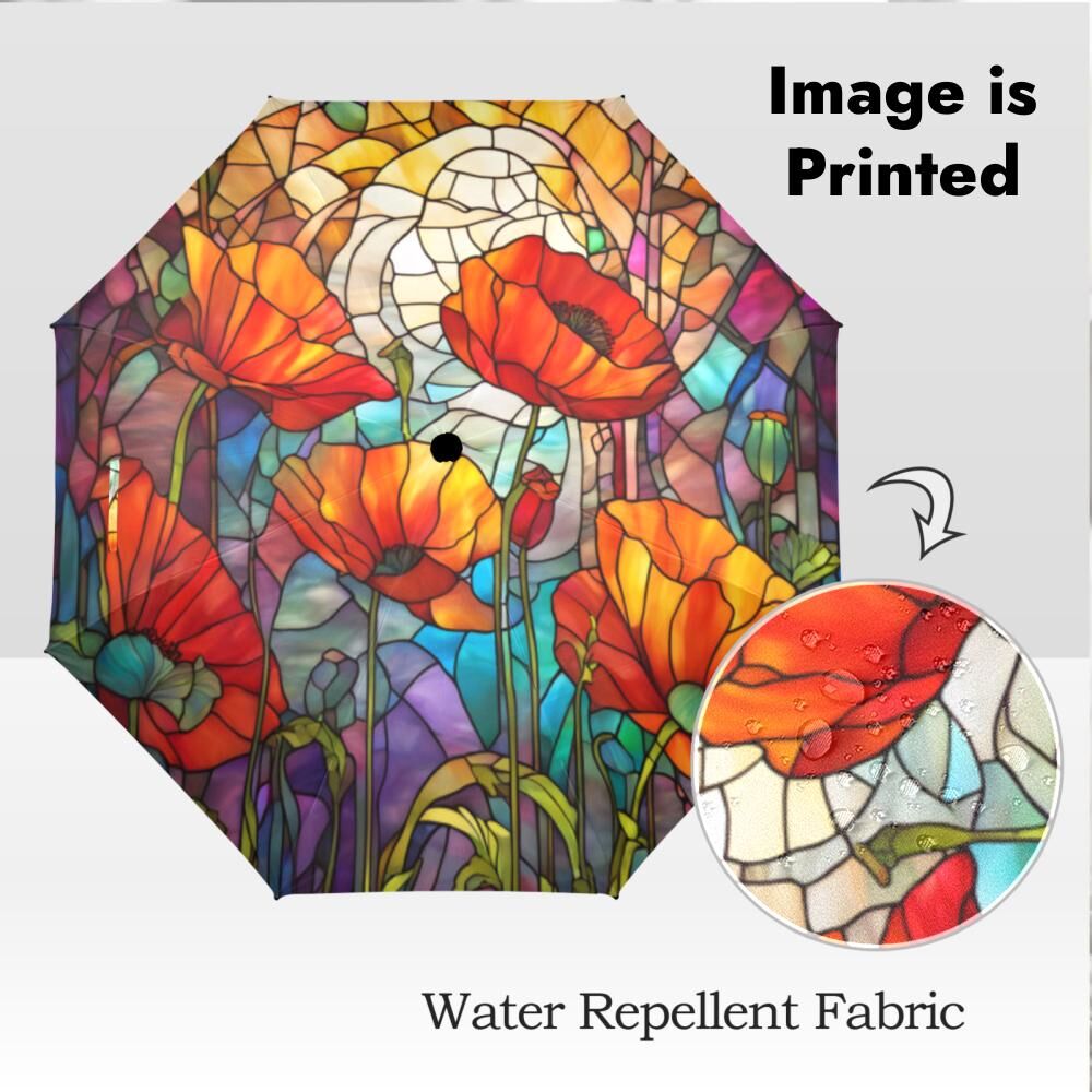 Umbrella Stained Glass Art Nouveau Poppies Red Parasol Semi-Automatic Waterproof Foldable Umbrella