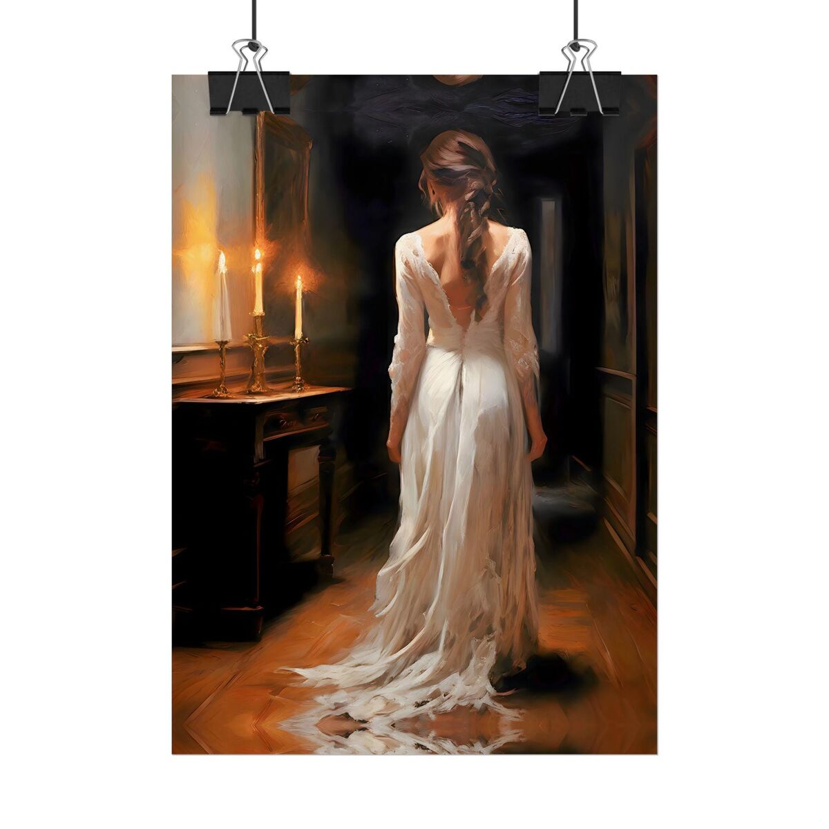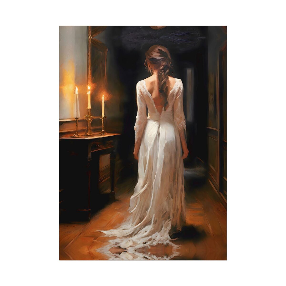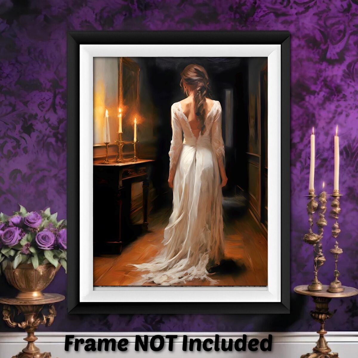 Enhance the ambiance of your living space with this captivating painint Print. This exquisite dark academia print features a mesmerizing ghost lady in a white torn dress, exuding an enchanting aura that will add a touch of mystique to any room. This is a print of the original painting, and is exclusive to Dreamland