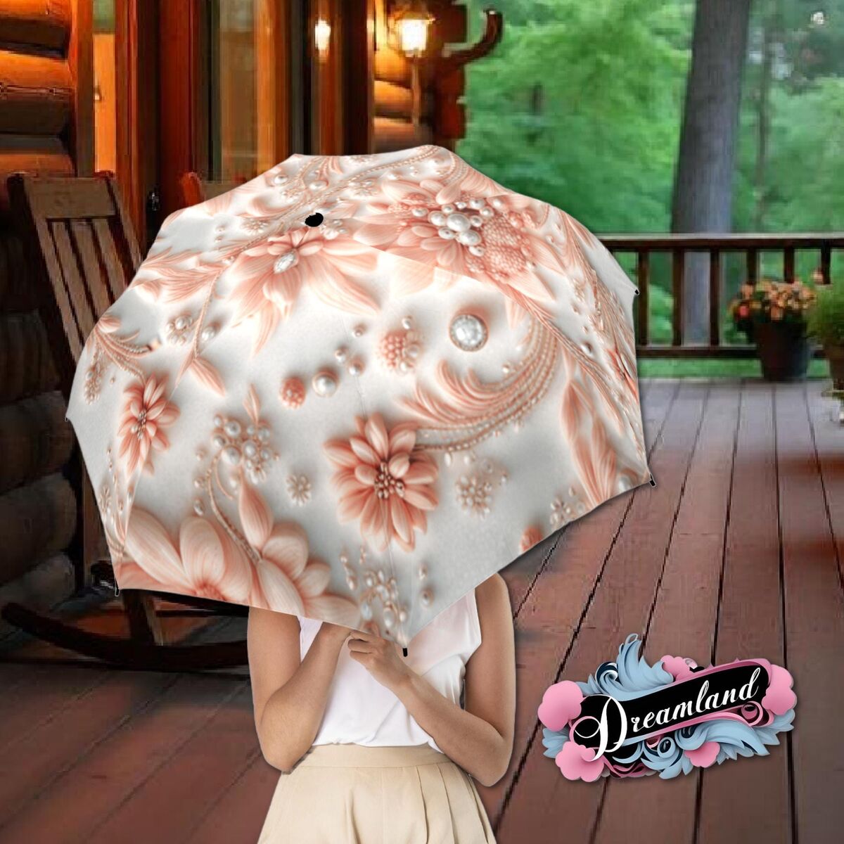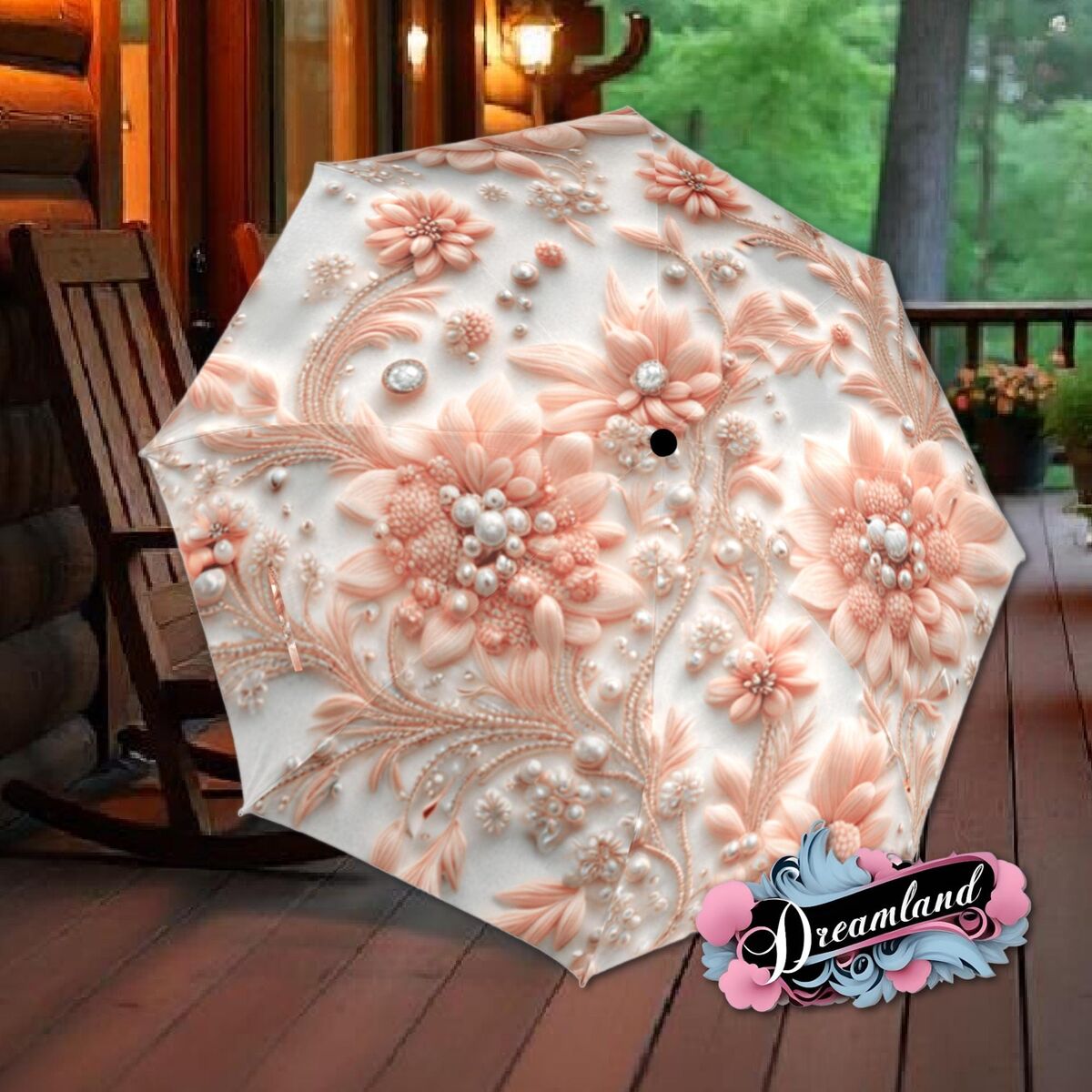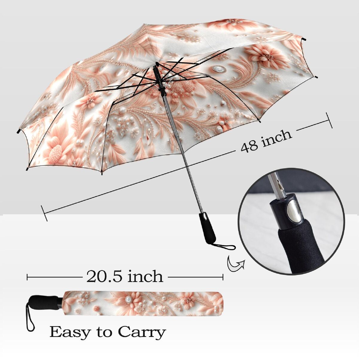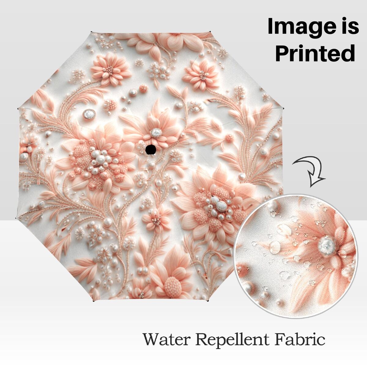 White Unique Umbrella Peach Flower Floral Art Nouveau Style Printed Faux Floral Beads Parasol Semi-Automatic Waterproof Foldable Umbrella