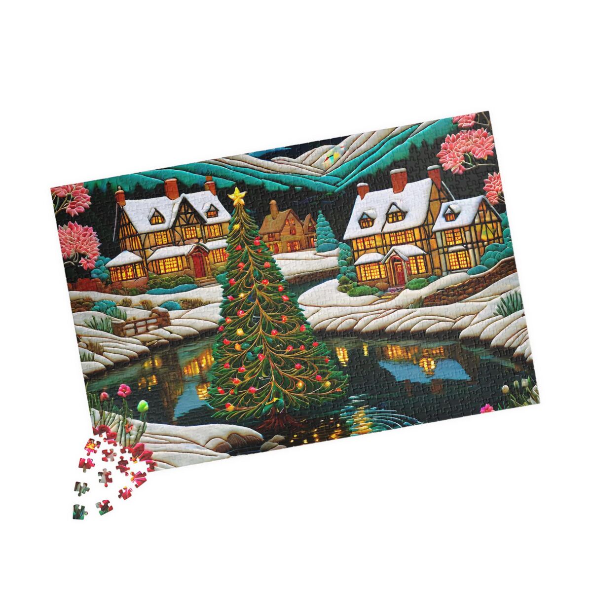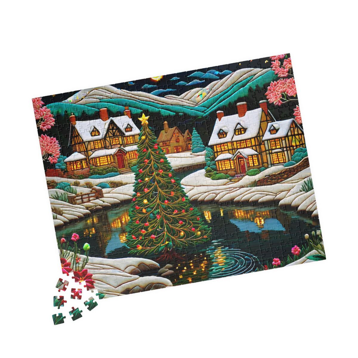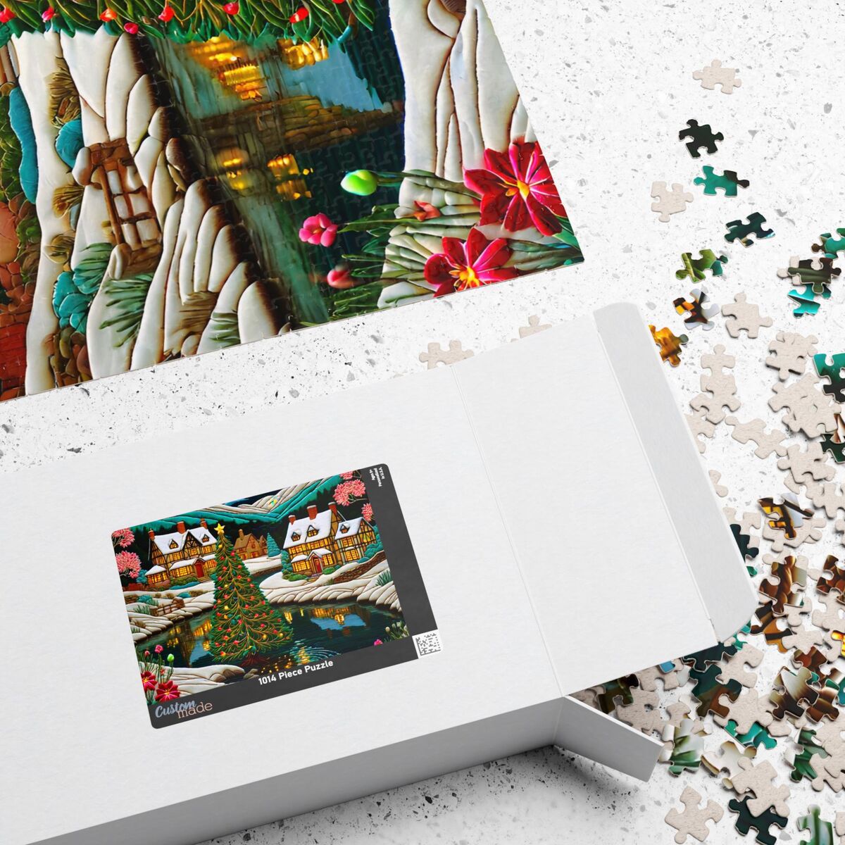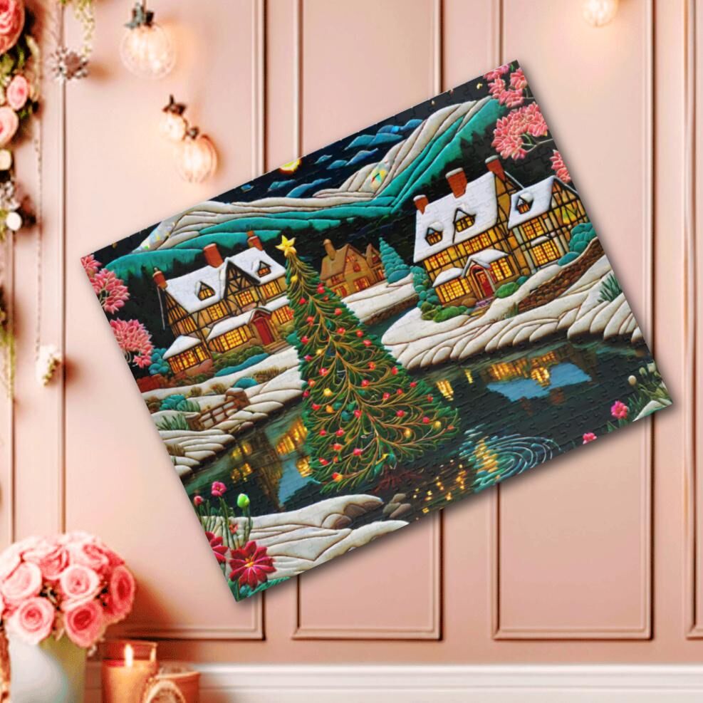 William Morris Inspired Christmas Village Jigsaw Puzzle Folk Art Art Nouveau Faux Embroidered Puzzle (110, 252, 520, 1014-piece)