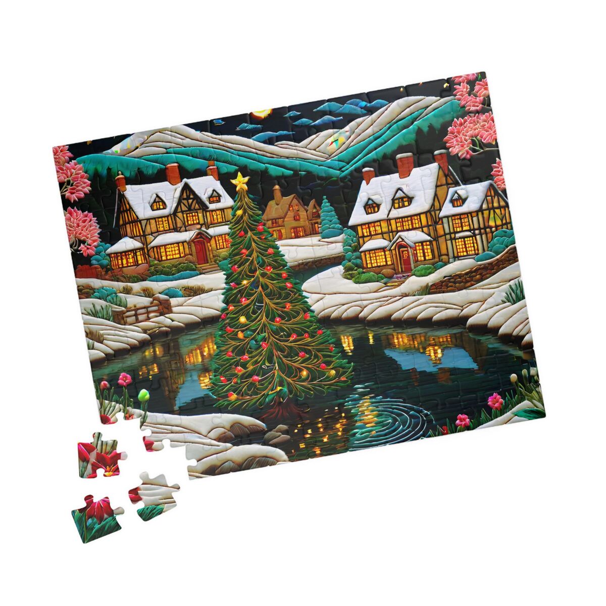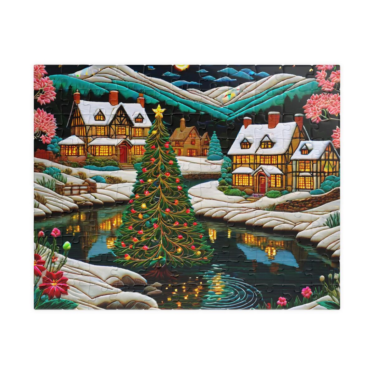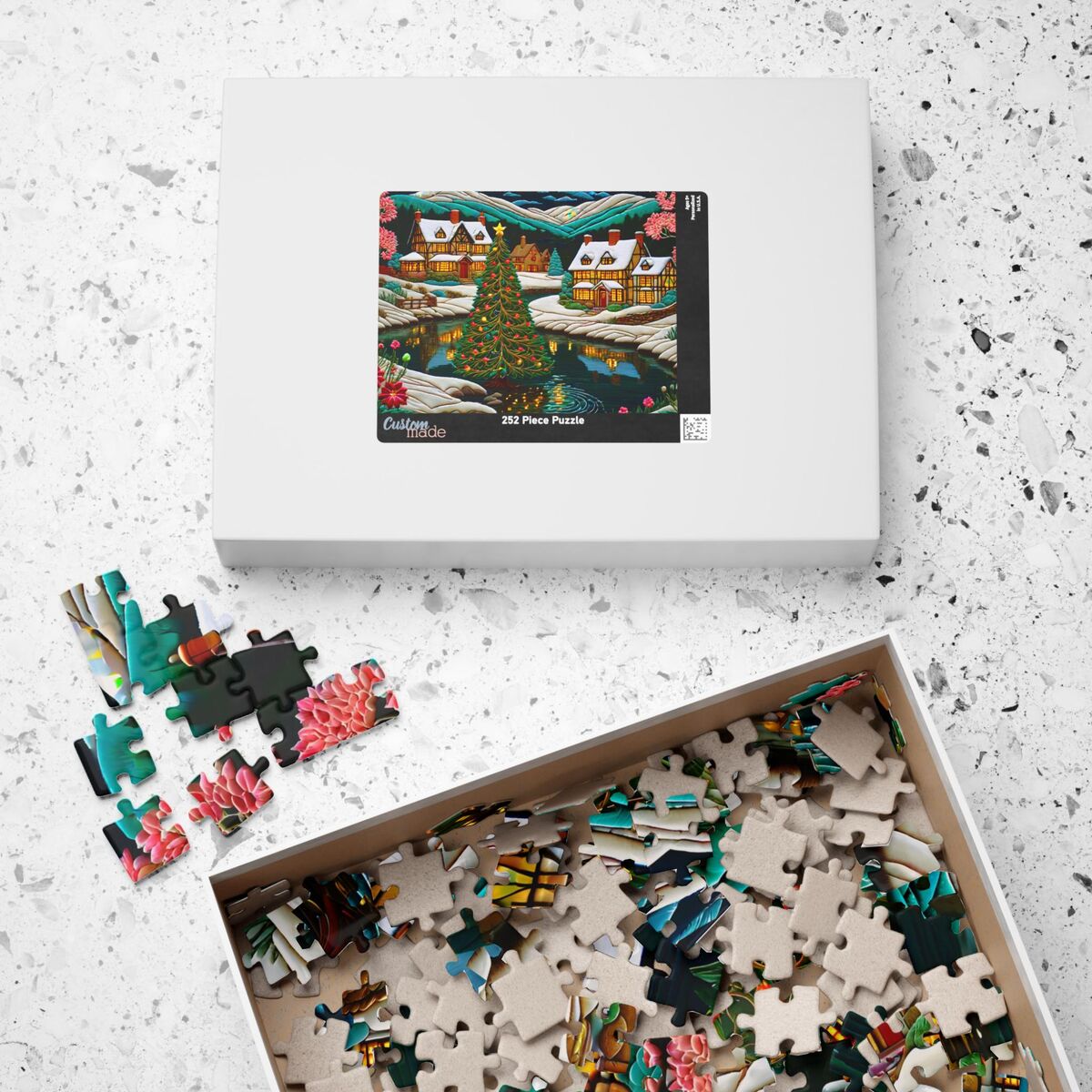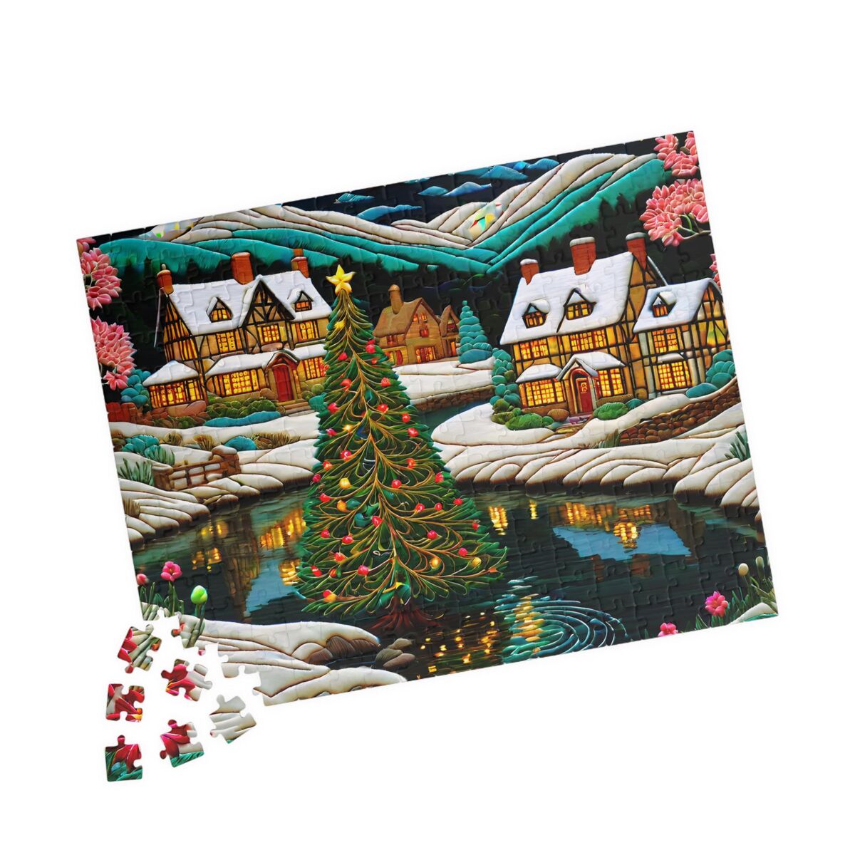 William Morris Inspired Christmas Village Jigsaw Puzzle Folk Art Art Nouveau Faux Embroidered Puzzle (110, 252, 520, 1014-piece)