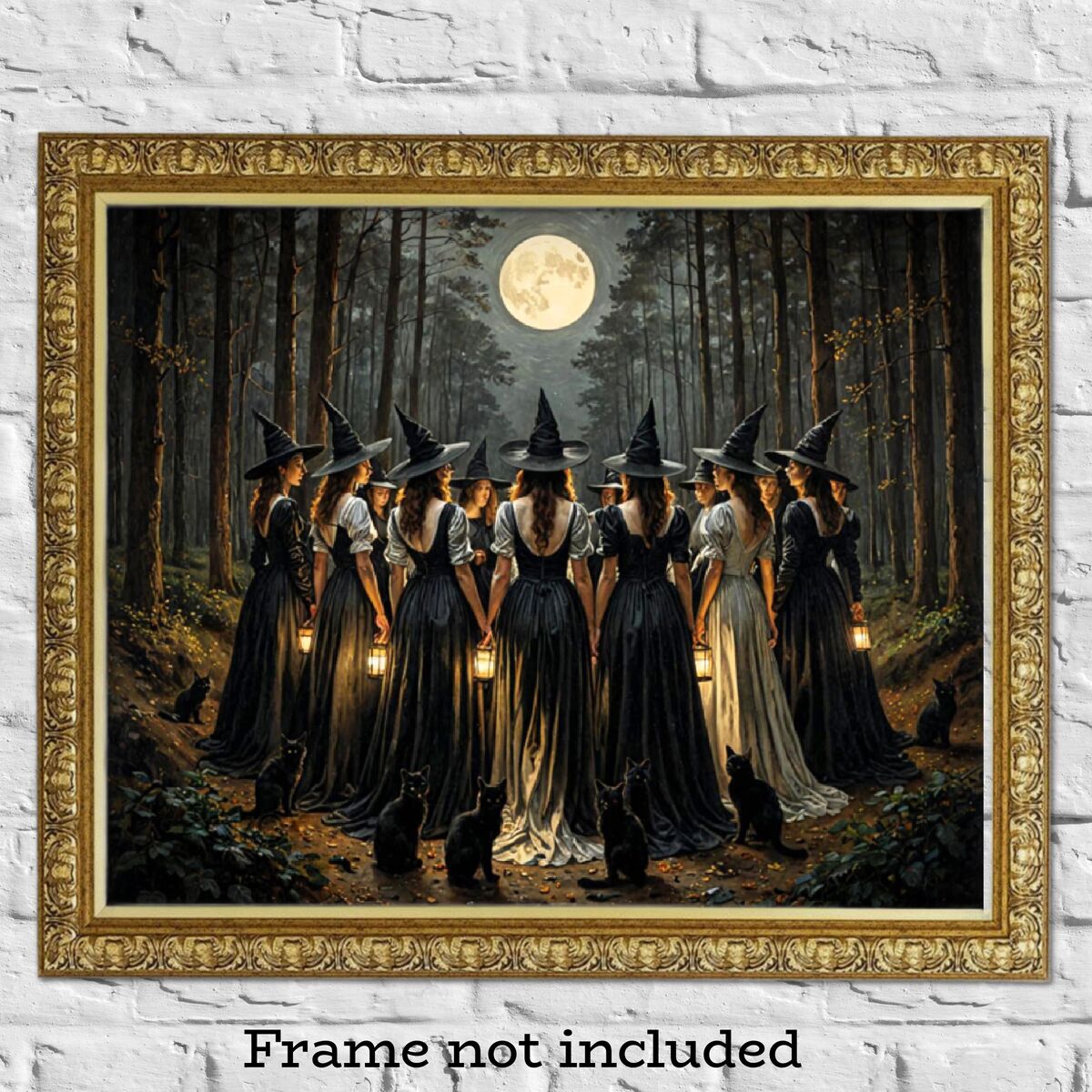 Witch Coven In Forest Print Halloween Black Cats Dark Academia Oil Painting Print Nocturne Victorain Dark Moody Wall Art